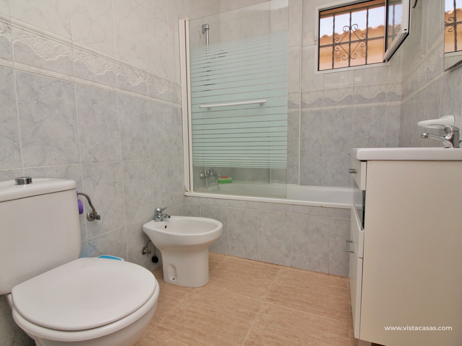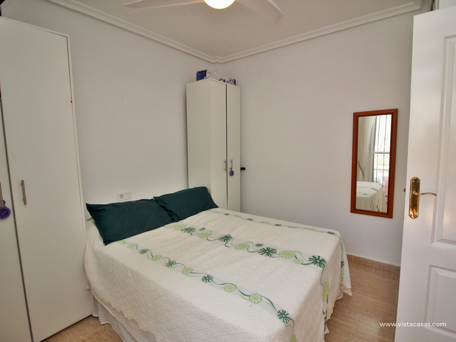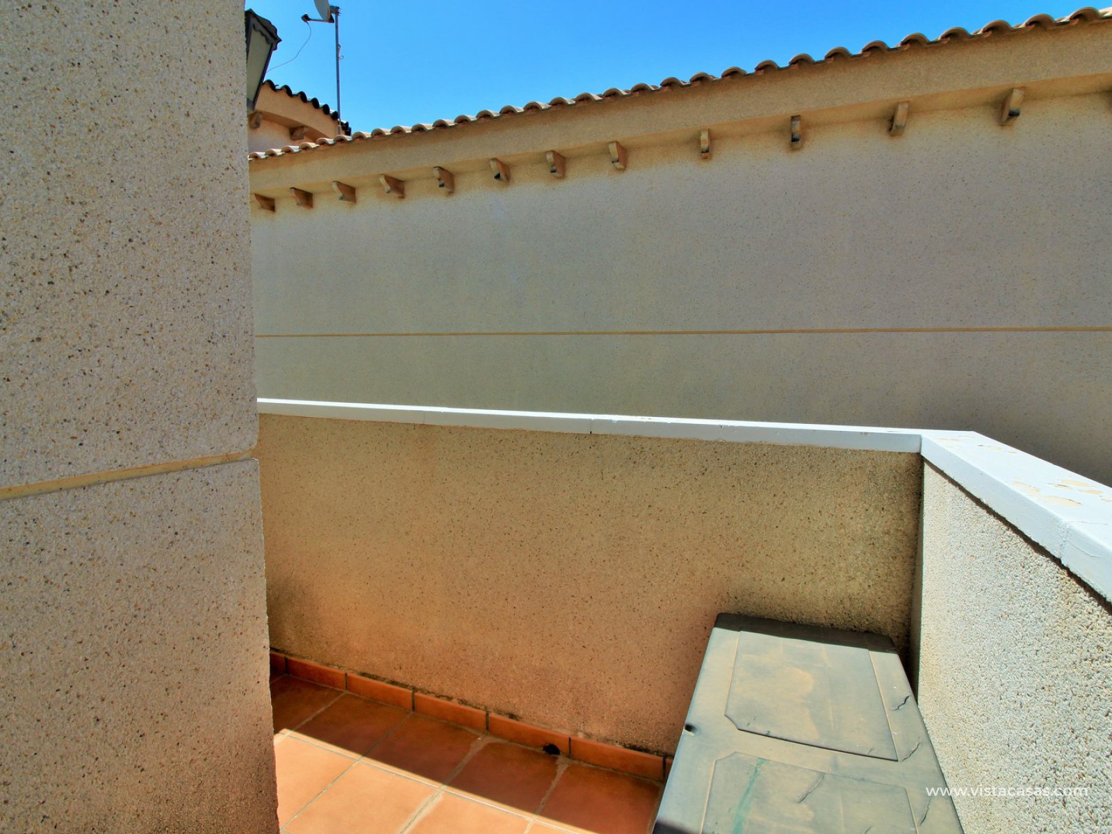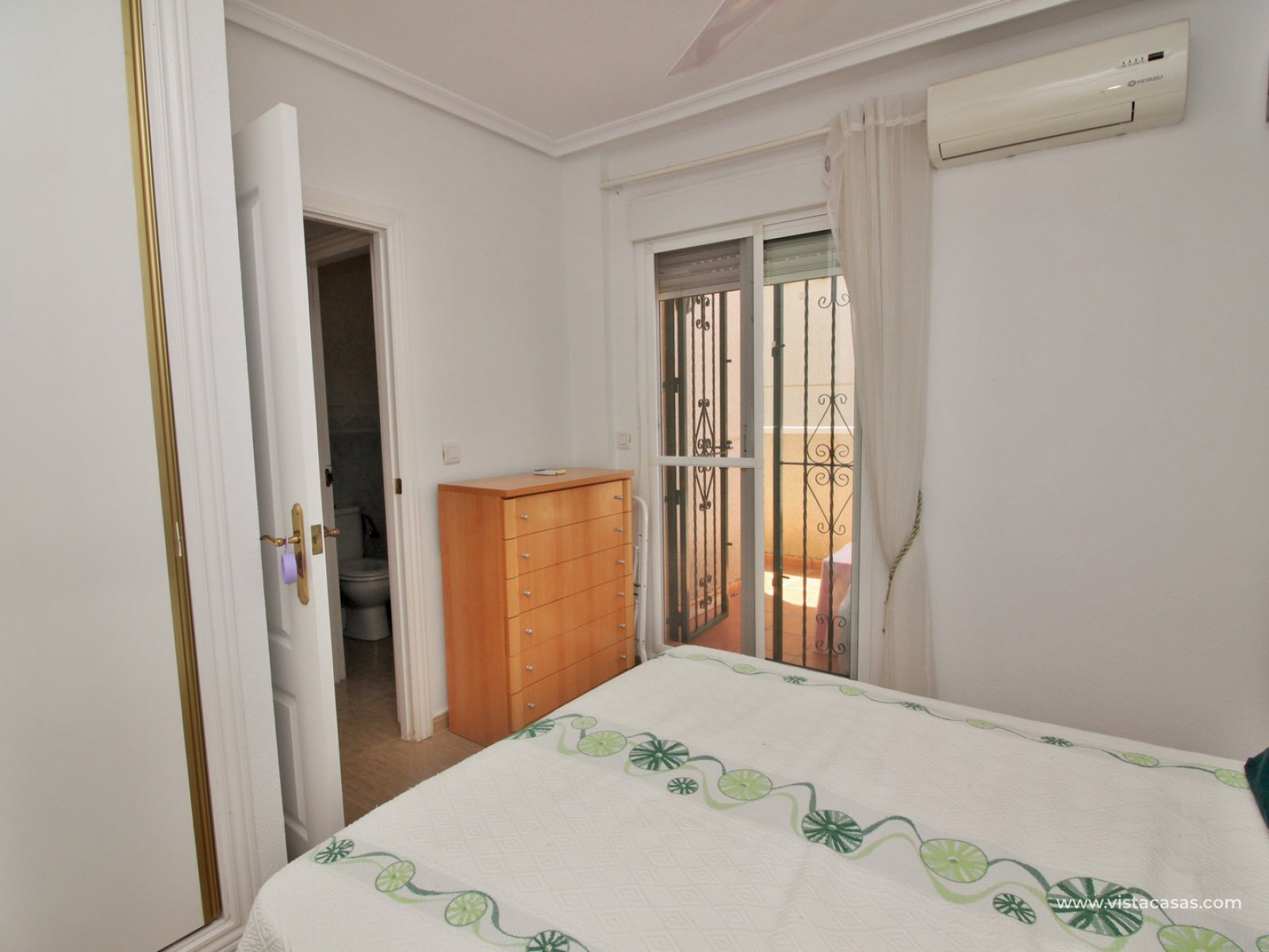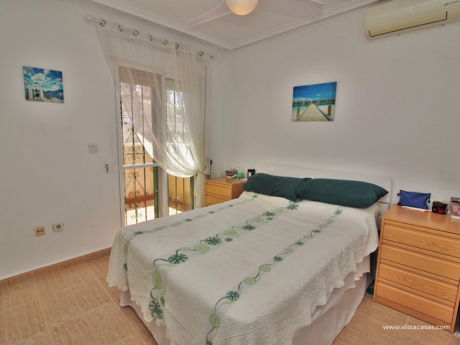 The ground floor living accommodation comprises of a lounge/dining area, renovated separate kitchen, 1 downstairs bedroom and a bathroom with walk-in shower. Upstairs are a further 2 double bedrooms with fitted wardrobes and a family bathroom. Both upstairs bedrooms offer private balconies, with the master bedroom offering a South facing balcony that is partially covered. Outside there is a front conservatory with sliding doors leading out to the private garden and pool area. Sold furnished with air-conditioning and solar panels for hot water.