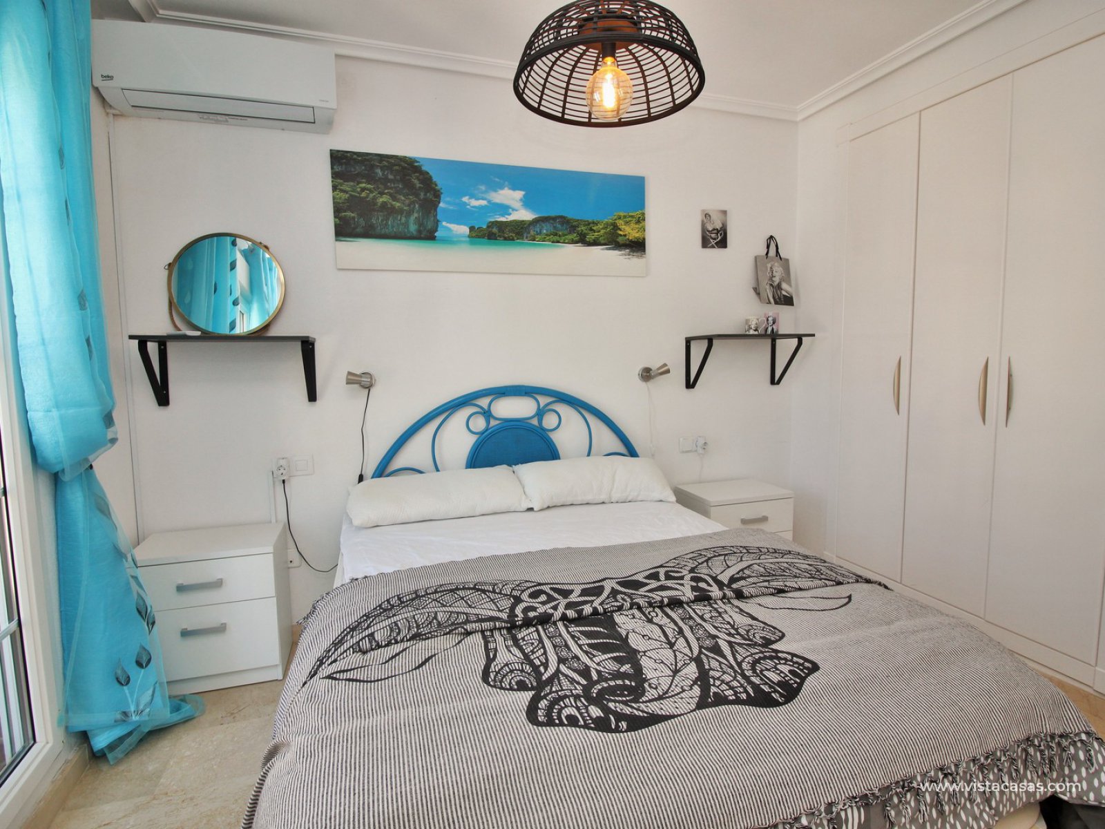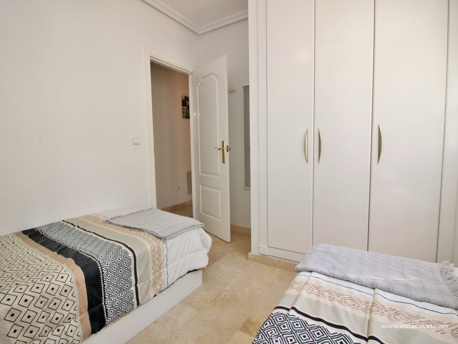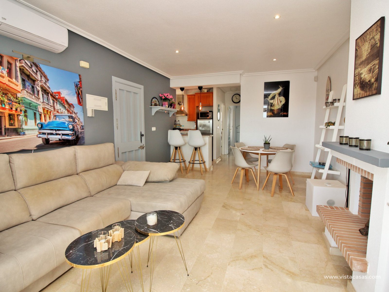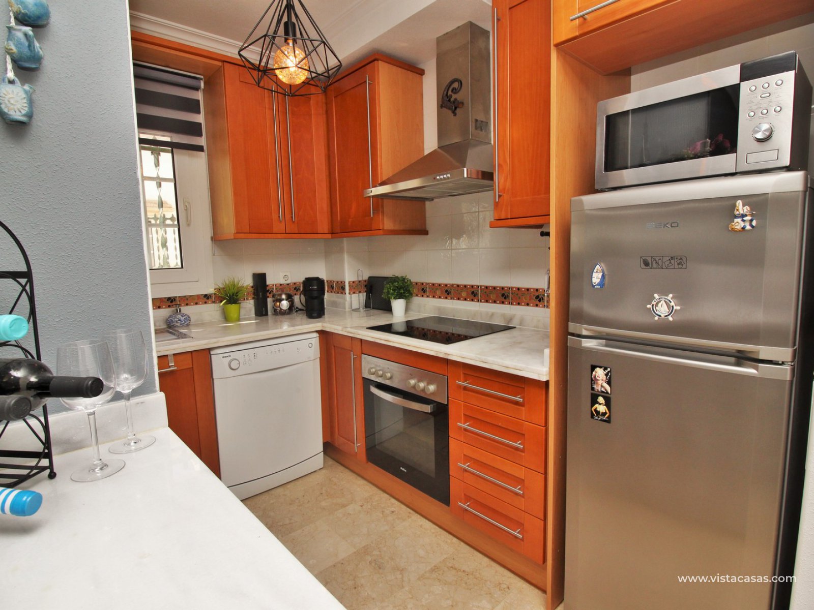 Beautiful 2 bedroom, 2 bathroom top floor apartment with sea views for sale in the highly popular and sought-after area of Las Violetas in Villamartin. The apartment is in great condition, and is sold fully equipped with furniture and offers great outdoor space including a private garden with storage shed, covered balcony with glass curtains, and large roof solarium with brick built BBQ and storage room.