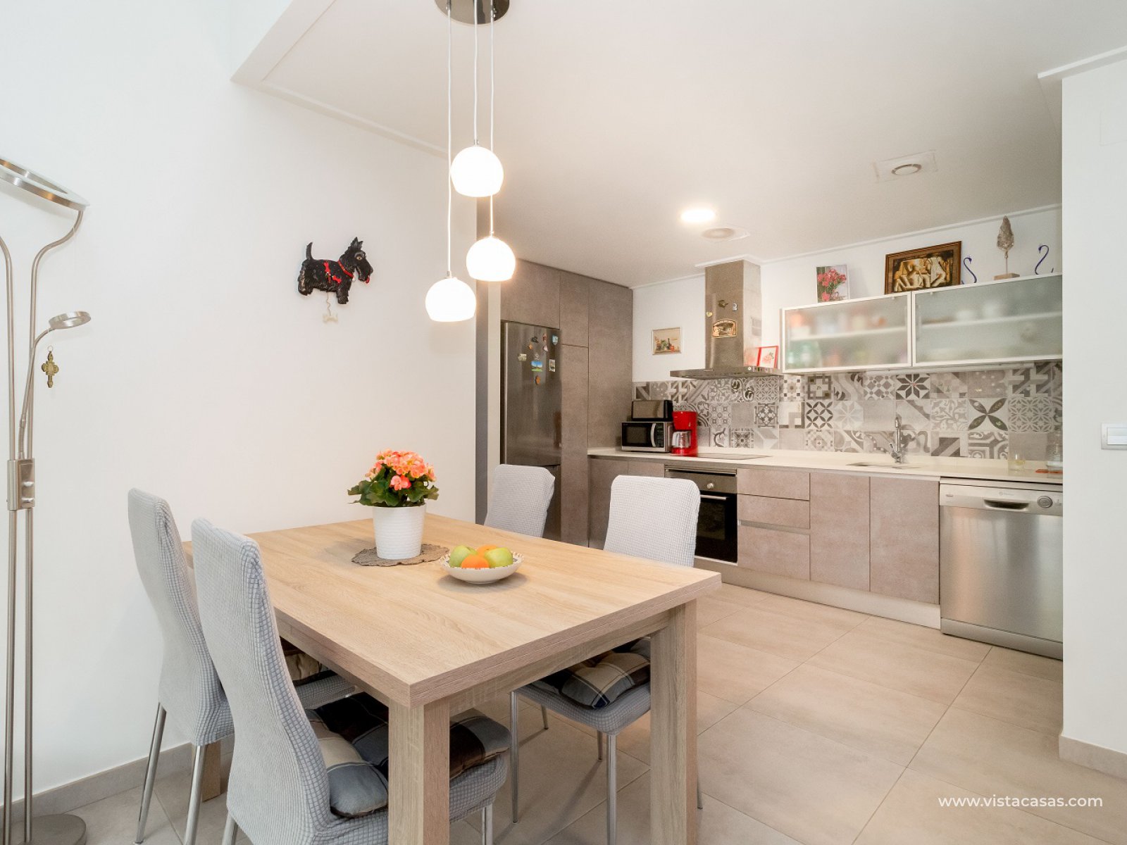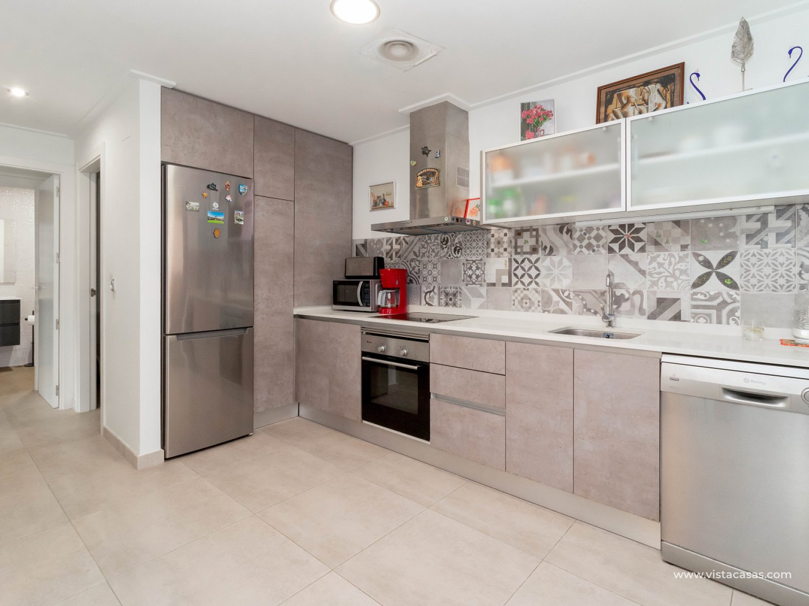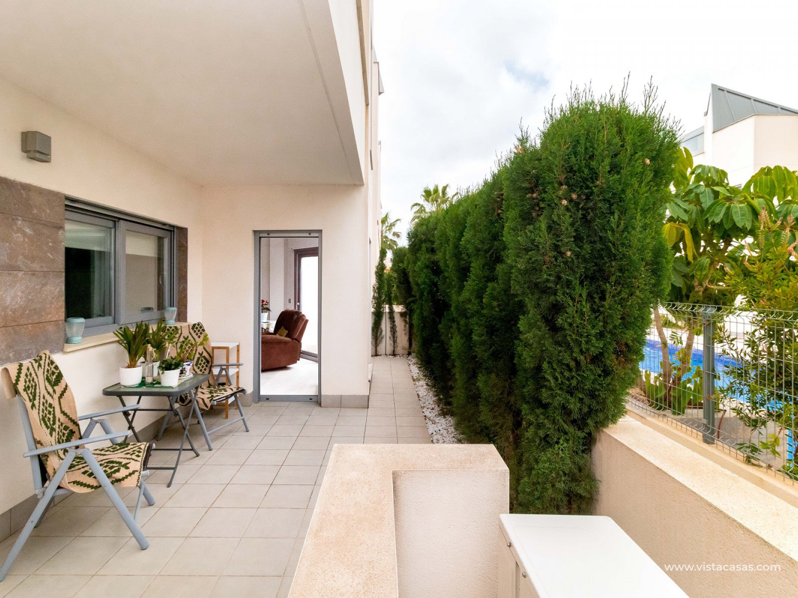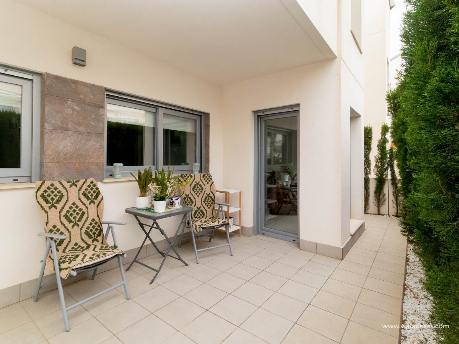 This, as new, ground floor apartment in La Valeta, Torrevieja has a private terrace with pool views, an open plan lounge, dining area and kitchen, 2 bedrooms and 2 bathrooms, underground parking, underfloor heating in bathrooms and it comes with fully installed hot and cold air conditioning, part furnished and all kitchen appliances are included.
