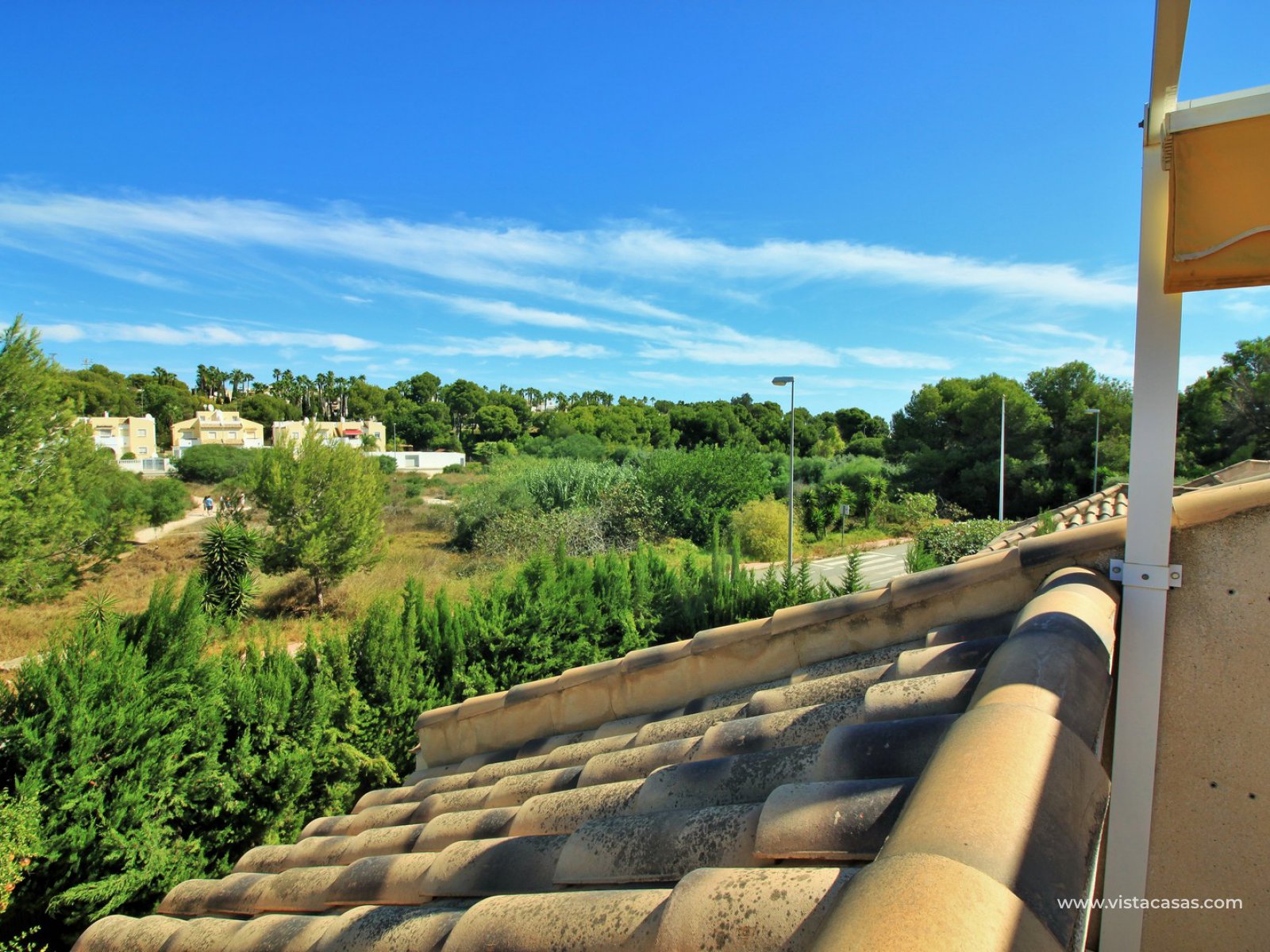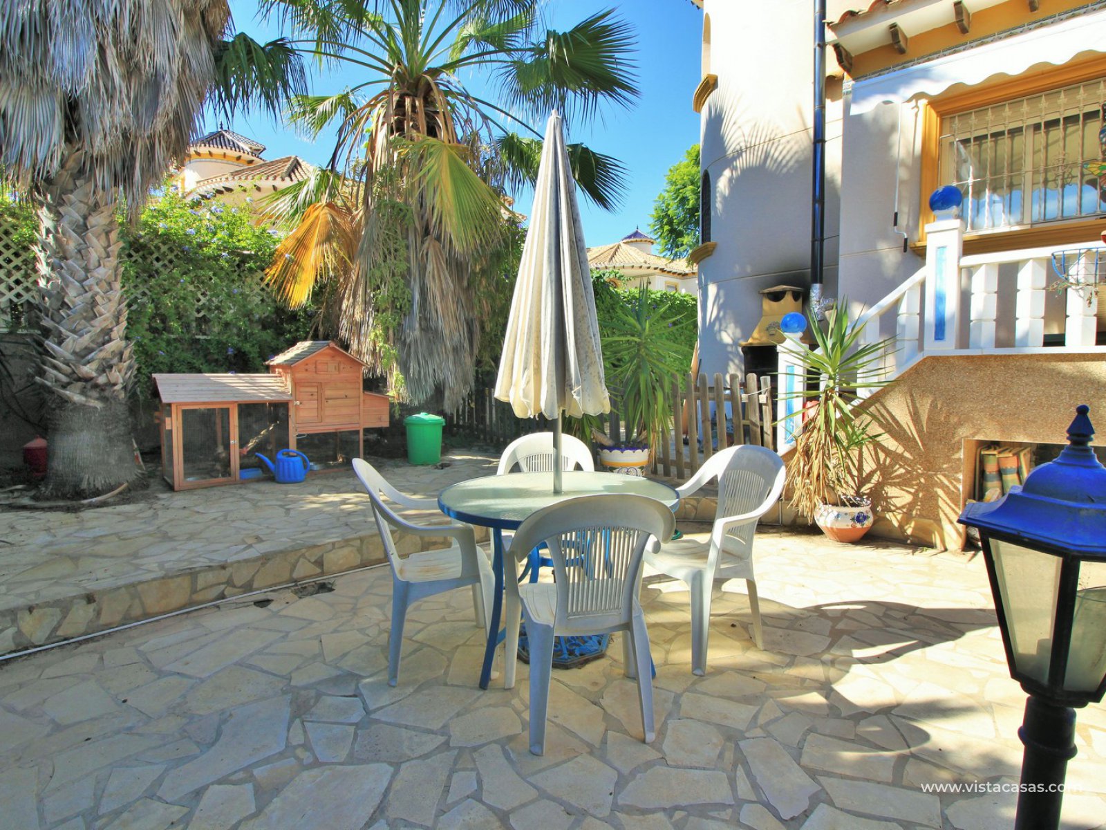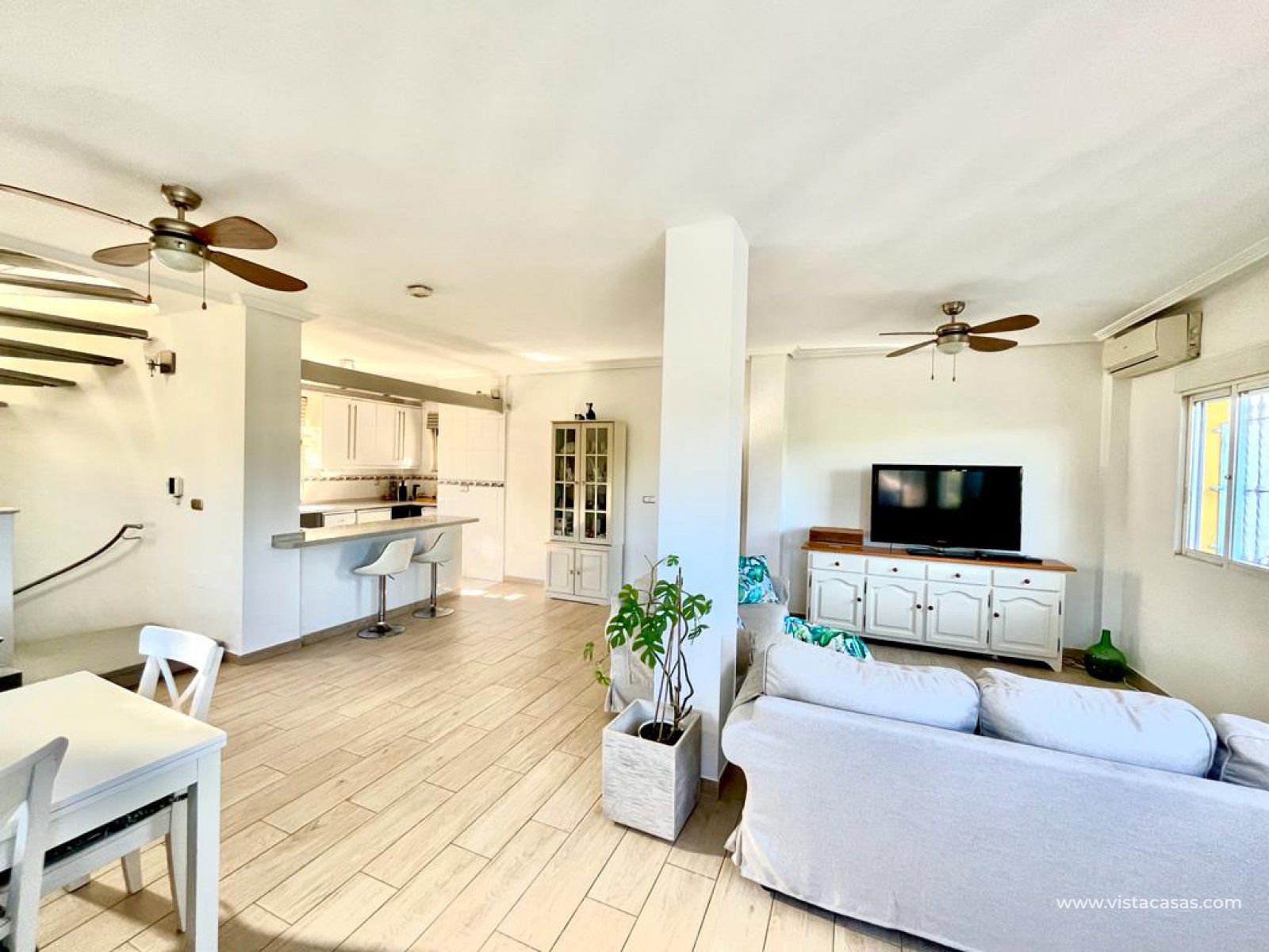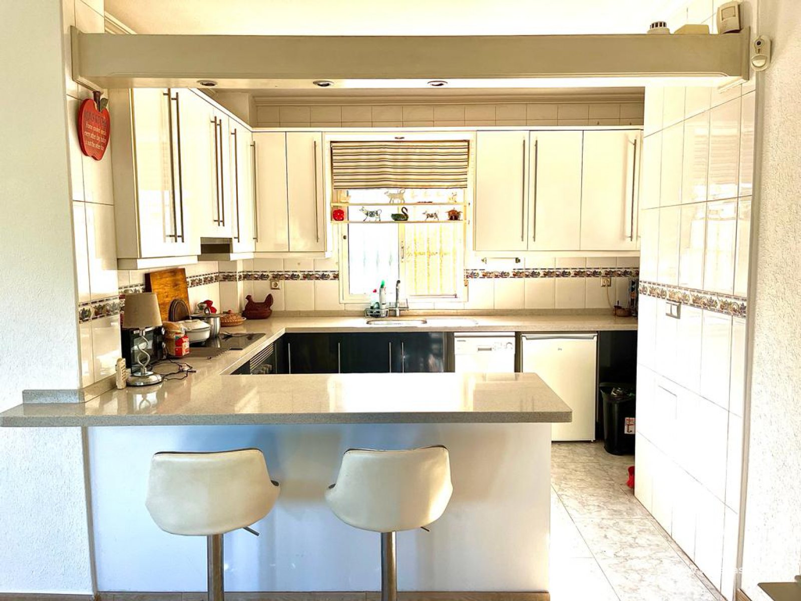 The main level comprises of a spacious lounge-dining area with log burner and open kitchen to the rear, 2 double bedrooms with fitted wardrobes and a family bathroom. The master bedroom offers an en-suite bathroom with walk-in shower. The lounge has been extended giving a lot more useful space. Internal stairs leads down to the underbuild, which offers 2 large bedrooms with fitted wardrobes and a bathroom with walk-in shower. There is direct access also to the garage from the underbuild level. From the lounge area, internal stairs leads up to the sunny roof solarium with glimpse views of the Villamartin golf course. Outside, there is a good sized garden, with a raised terrace area. An ideal home for permanent living or rental! The property forms part of a community with the use of a communal pool.
