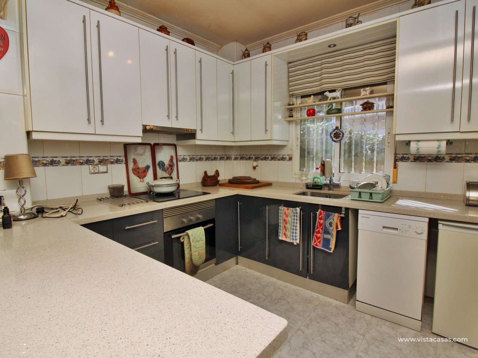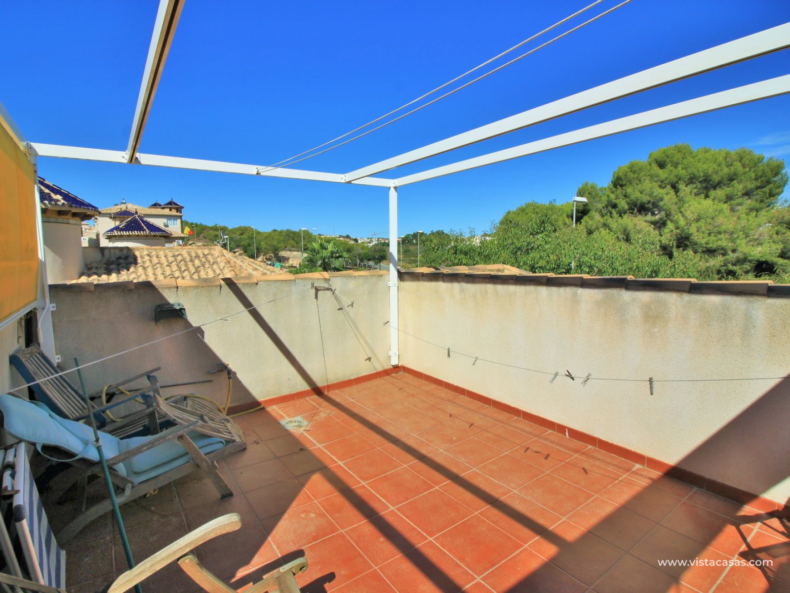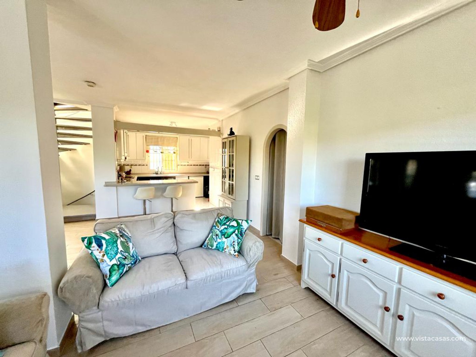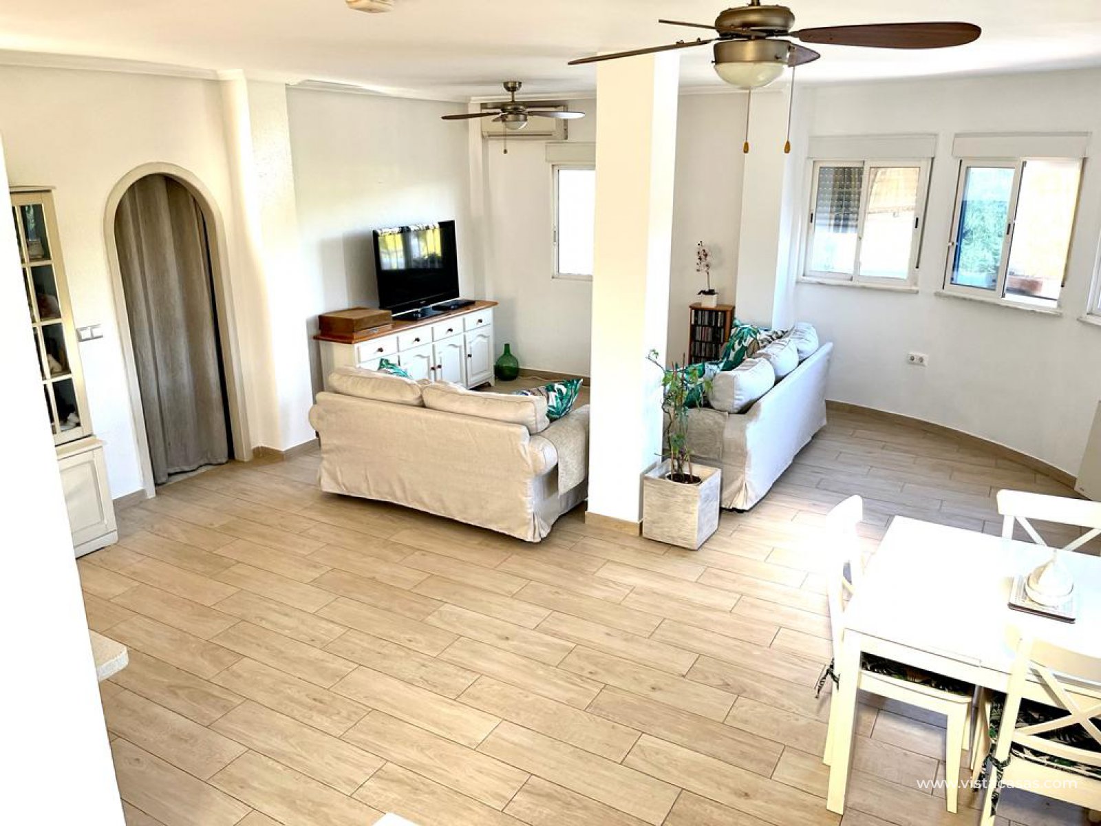 The main level comprises of a spacious lounge-dining area with log burner and open kitchen to the rear, 2 double bedrooms with fitted wardrobes and a family bathroom. The master bedroom offers an en-suite bathroom with walk-in shower. The lounge has been extended giving a lot more useful space. Internal stairs leads down to the underbuild, which offers 2 large bedrooms with fitted wardrobes and a bathroom with walk-in shower. There is direct access also to the garage from the underbuild level. From the lounge area, internal stairs leads up to the sunny roof solarium with glimpse views of the Villamartin golf course. Outside, there is a good sized garden, with a raised terrace area. An ideal home for permanent living or rental! The property forms part of a community with the use of a communal pool.