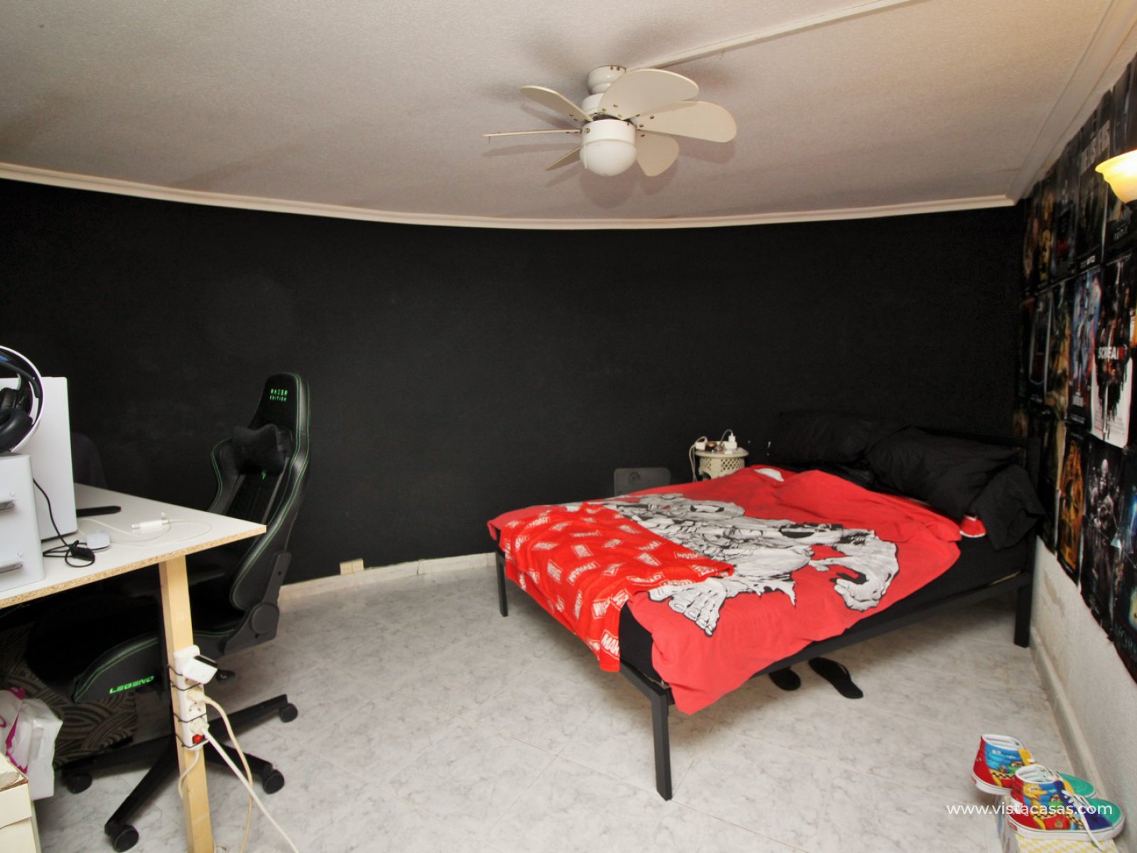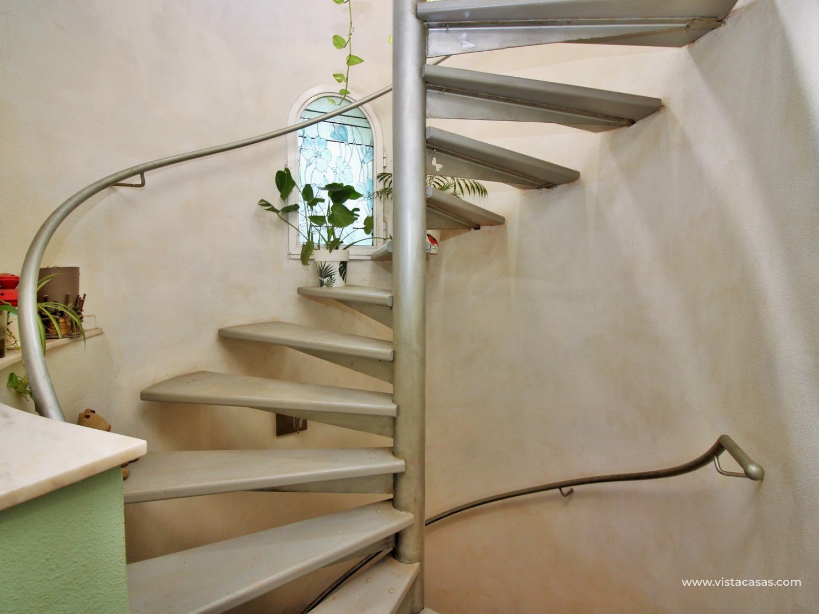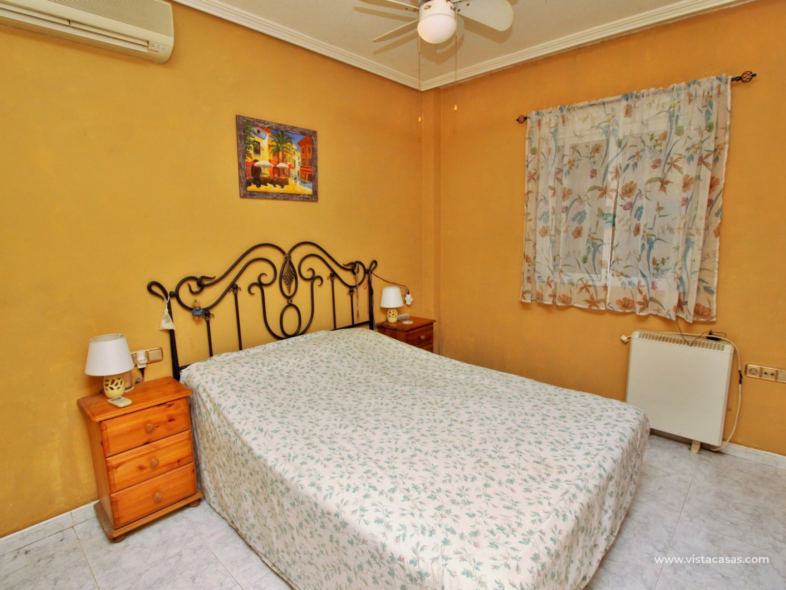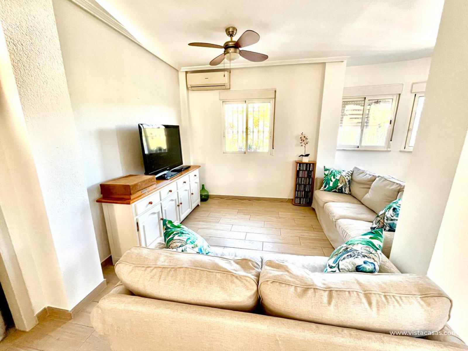 The main level comprises of a spacious lounge-dining area with log burner and open kitchen to the rear, 2 double bedrooms with fitted wardrobes and a family bathroom. The master bedroom offers an en-suite bathroom with walk-in shower. The lounge has been extended giving a lot more useful space. Internal stairs leads down to the underbuild, which offers 2 large bedrooms with fitted wardrobes and a bathroom with walk-in shower. There is direct access also to the garage from the underbuild level. From the lounge area, internal stairs leads up to the sunny roof solarium with glimpse views of the Villamartin golf course. Outside, there is a good sized garden, with a raised terrace area. An ideal home for permanent living or rental! The property forms part of a community with the use of a communal pool.