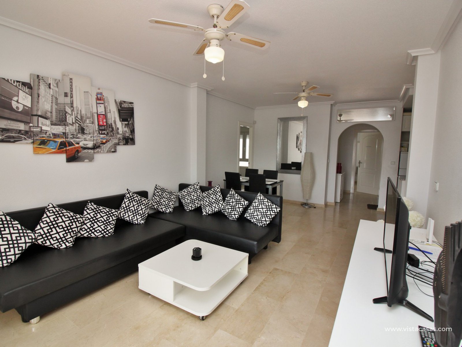 South facing 2 bedroom, 2 bathroom apartment for sale in the highly-sought after area of Las Violetas, Villamartin, just a short walk to the Villamartin golf and the Plaza with its shops, cafes, bars and restaurants. There is also a bus stop just outside of the complex. This spacious and bright apartment is within a secure gated community with communal pool, lift, communal roof solarium with panoramic views sea and country views. It comes fully furnished to a high standard and is immaculate through-out and ready to use.