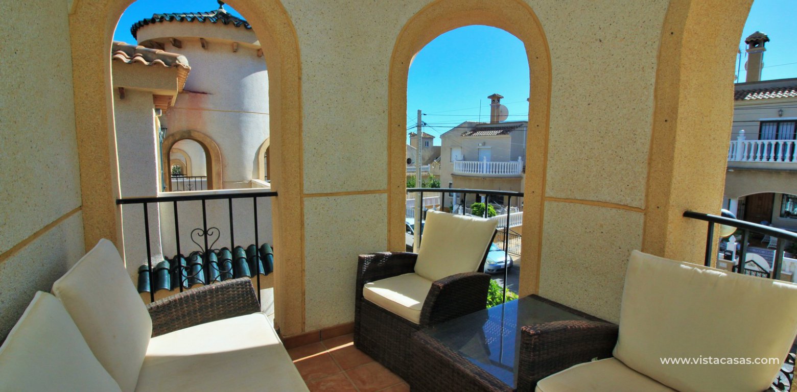 The ground floor living accommodation comprises of a lounge/dining area, a separate kitchen, 1 downstairs bedroom and a bathroom with walk-in shower. Upstairs are a further 2 double bedrooms with fitted wardrobes and a family bathroom with walk-in shower. Both upstairs bedrooms offer private balconies, with the master bedroom offering a South facing balcony that is partially covered. Outside there is a covered dining area, plus a storage/utility shed. Sold furnished with air-conditioning.