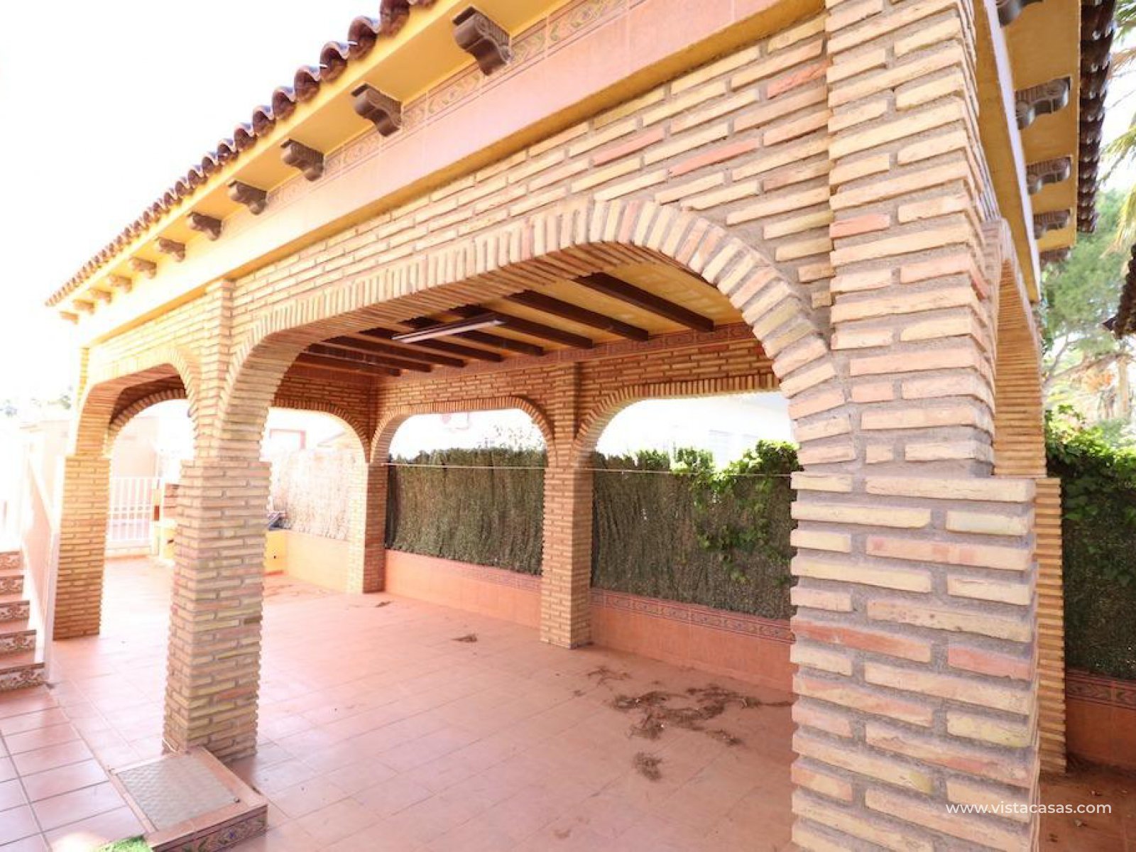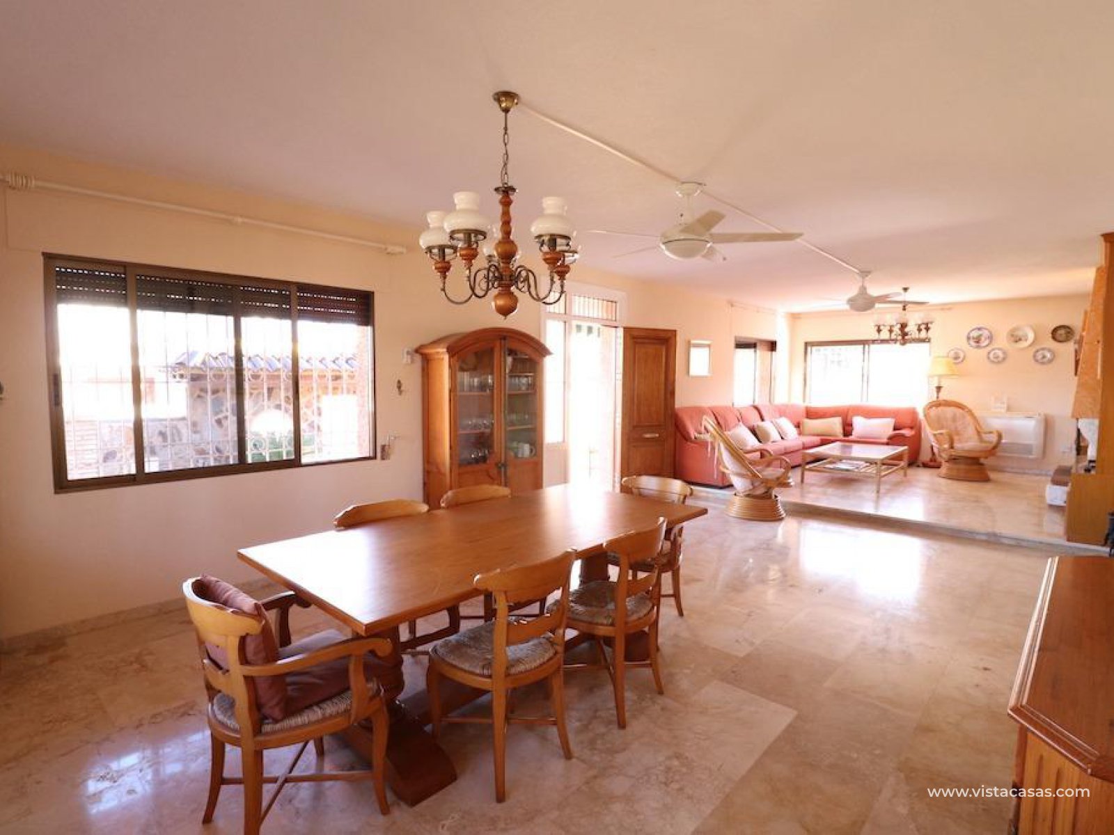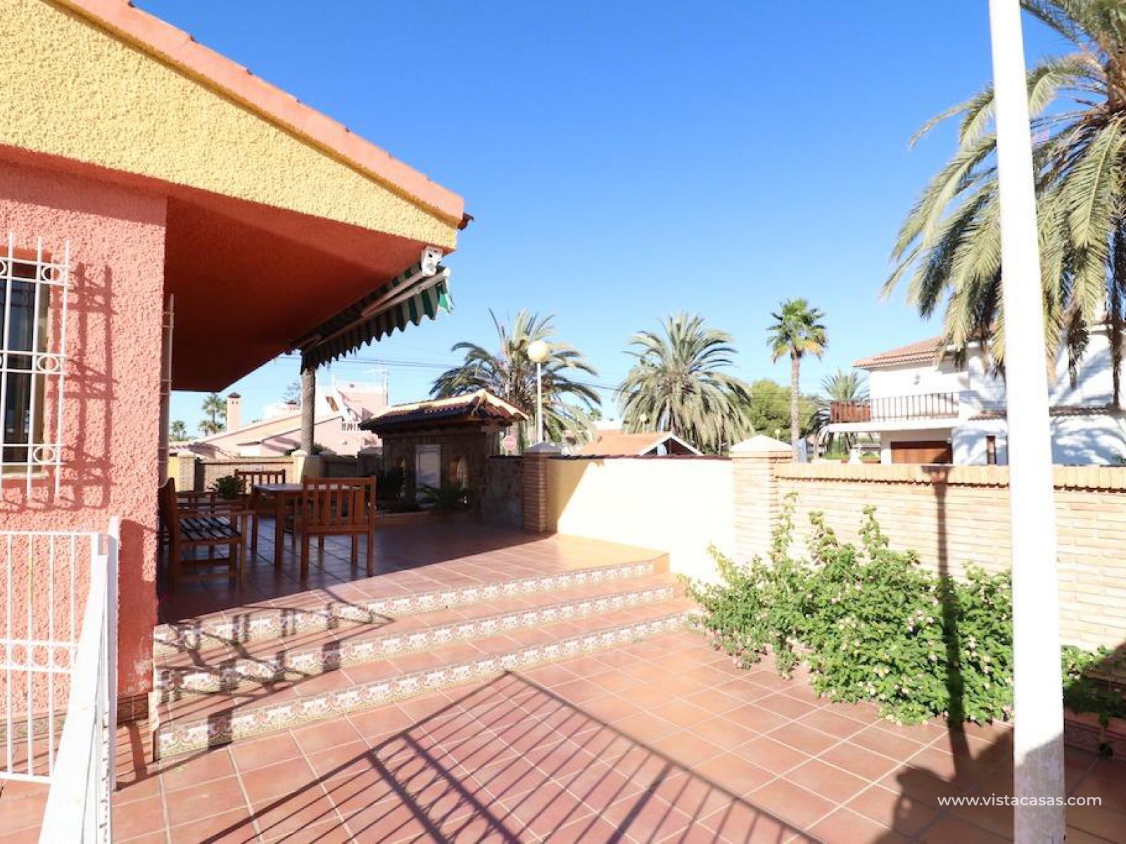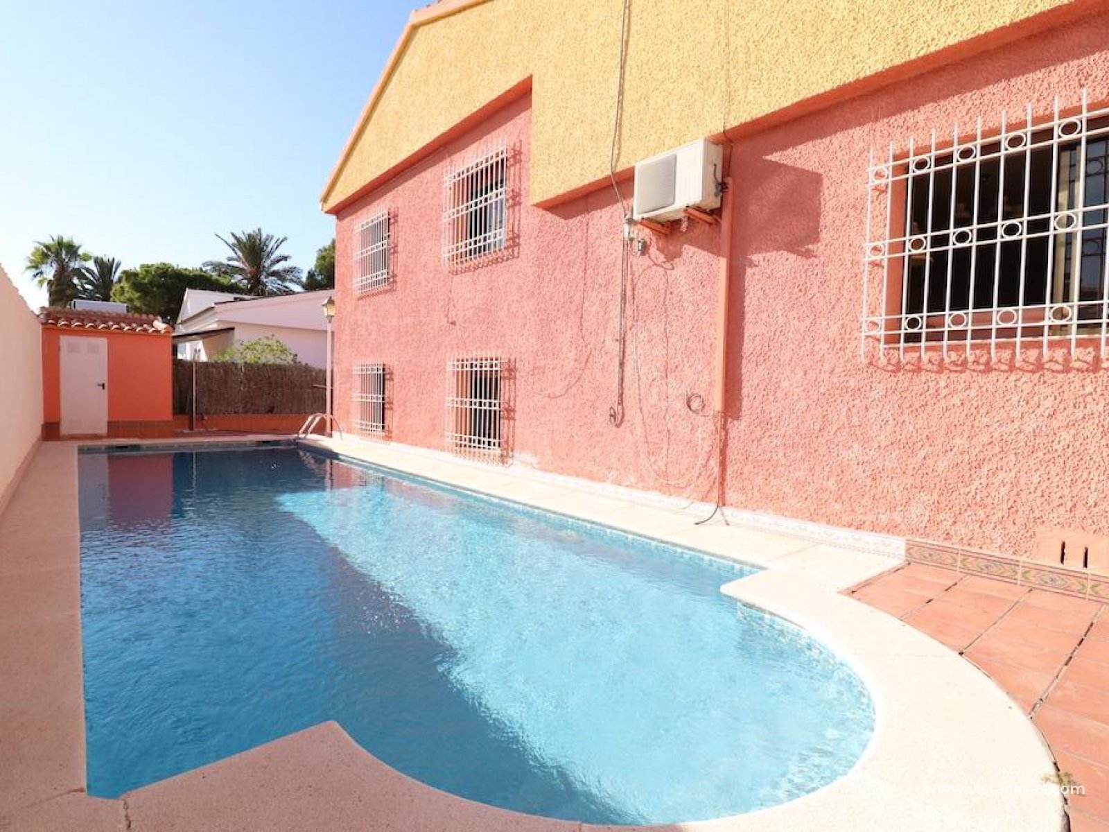 Cabo Roig, Detached villa on the corner of two streets with a 522 m2 plot and south-east orientation, and just 300 meters from Capitan beach, with a two-story house of 276 m2, the house has 5 bedrooms, 2 full bathrooms, 60m2 living room with fireplace, large independent kitchen, 8x3 pool with a barbecue area, large terrace in front of the house, sold furnished and with air conditioning and heating. Garage for 2 cars with pergola.