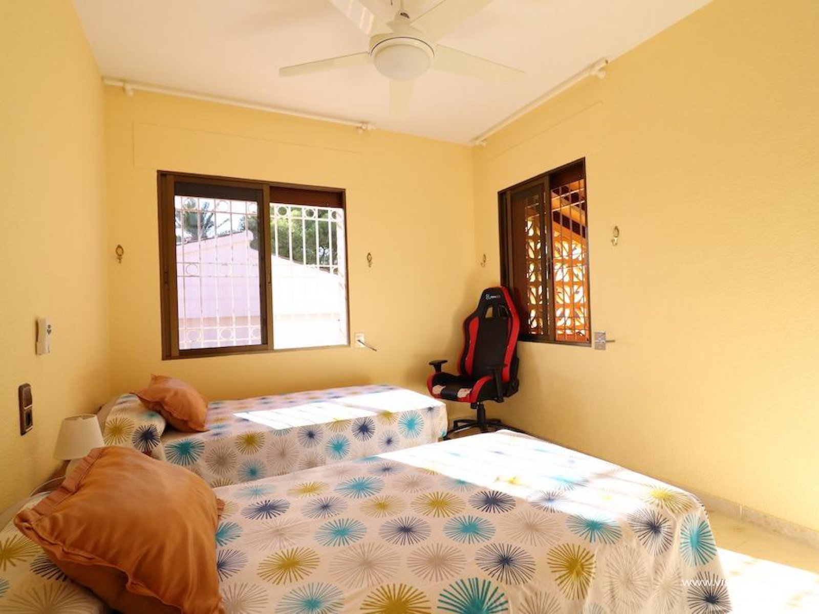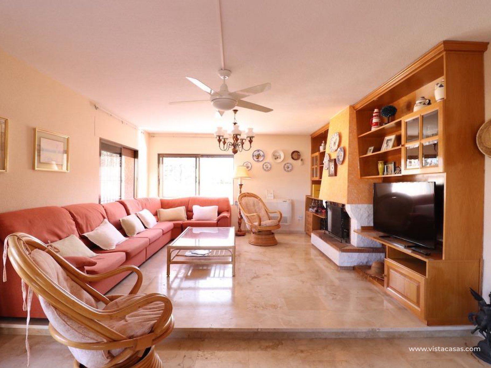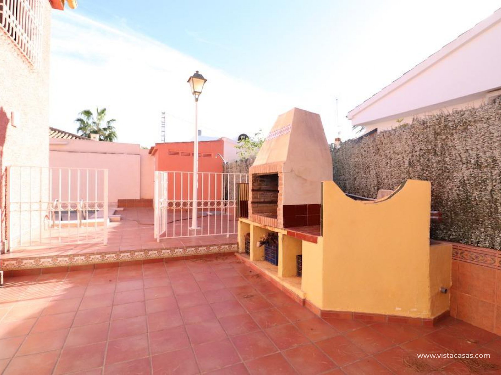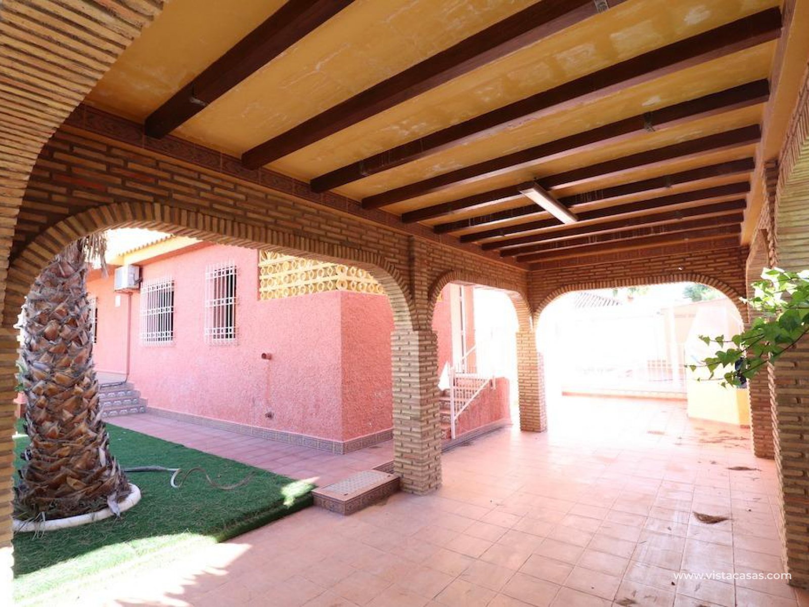 Cabo Roig, Detached villa on the corner of two streets with a 522 m2 plot and south-east orientation, and just 300 meters from Capitan beach, with a two-story house of 276 m2, the house has 5 bedrooms, 2 full bathrooms, 60m2 living room with fireplace, large independent kitchen, 8x3 pool with a barbecue area, large terrace in front of the house, sold furnished and with air conditioning and heating. Garage for 2 cars with pergola.