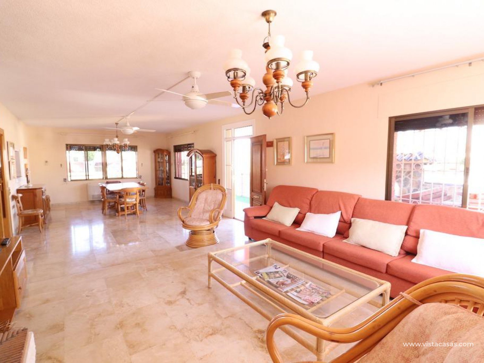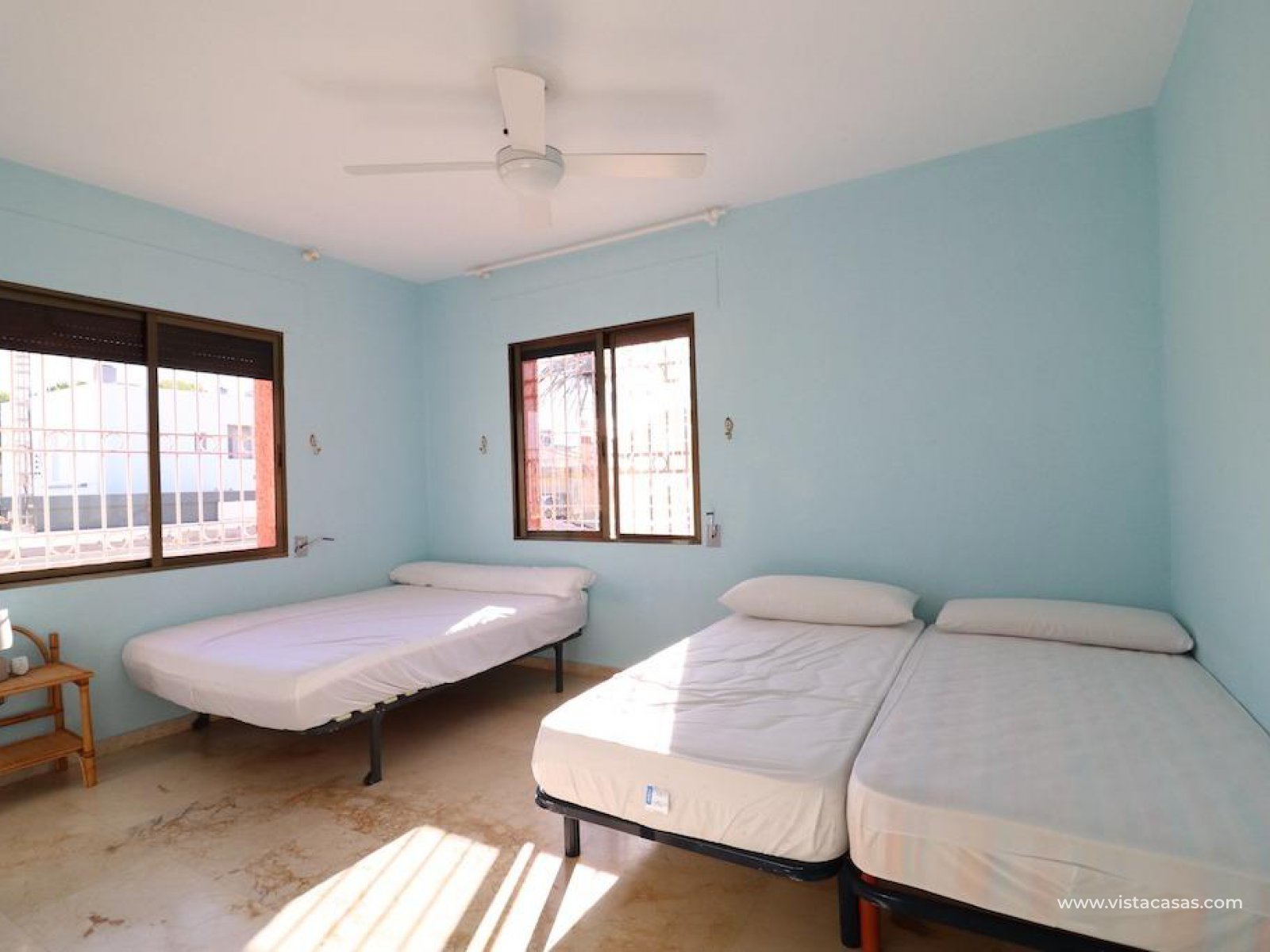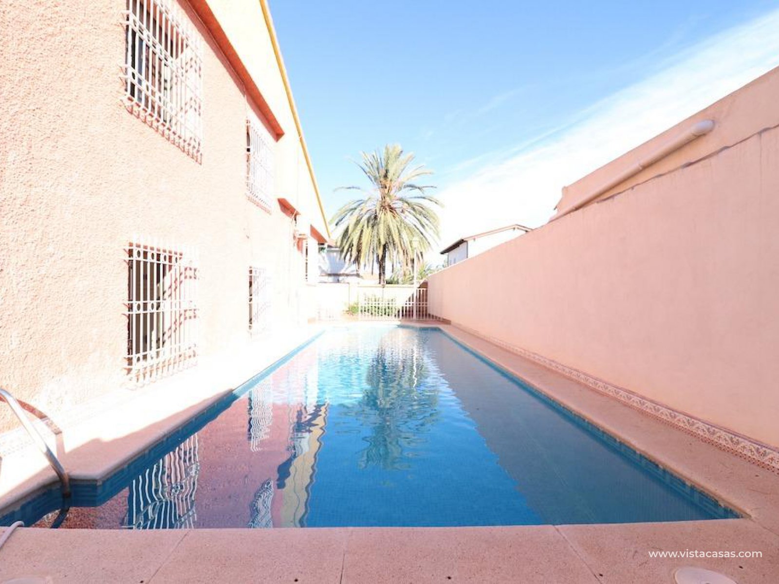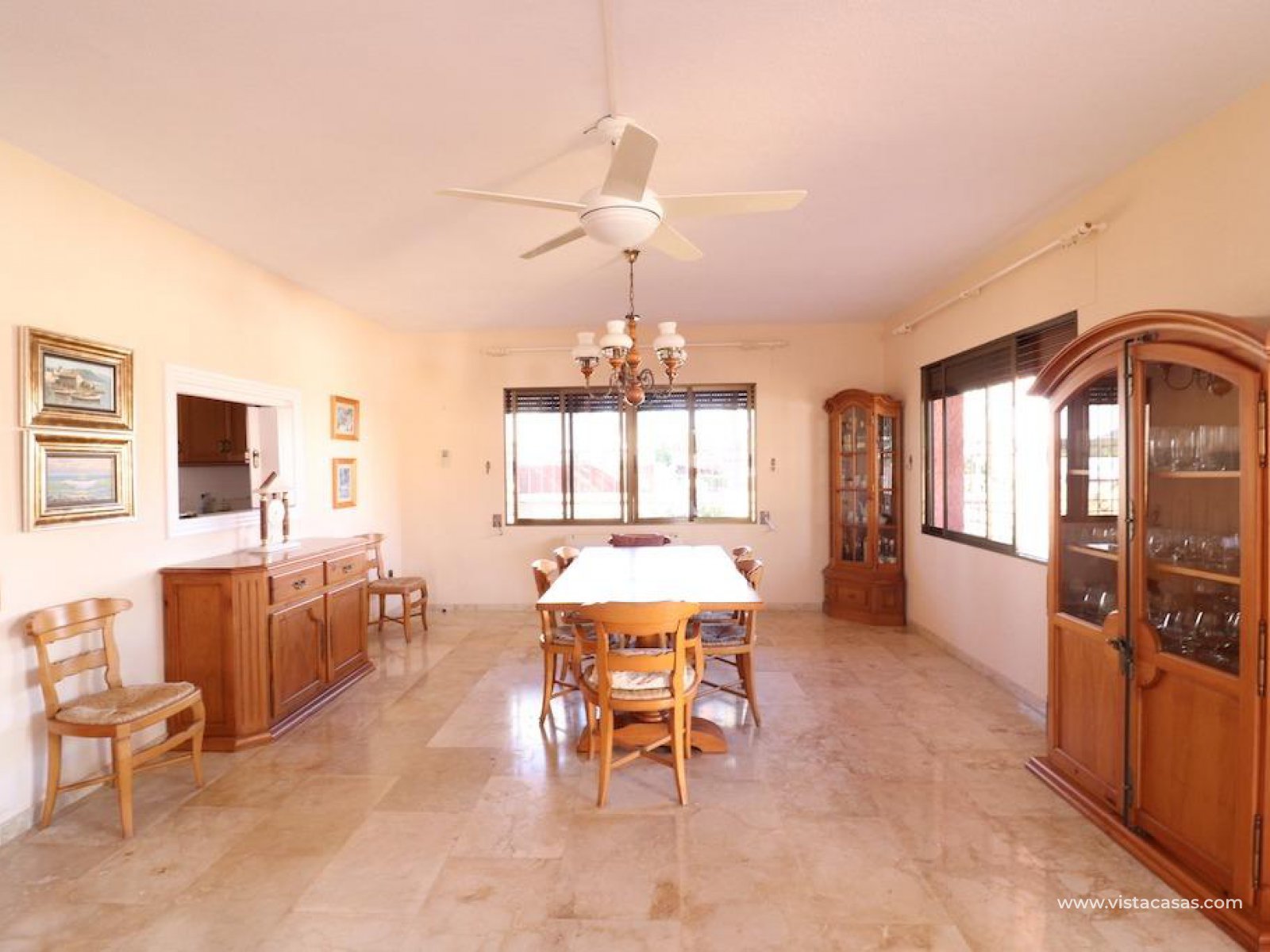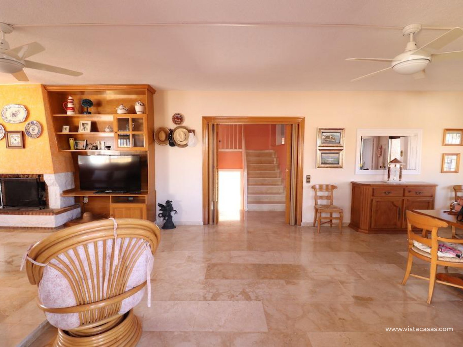 Cabo Roig, Detached villa on the corner of two streets with a 522 m2 plot and south-east orientation, and just 300 meters from Capitan beach, with a two-story house of 276 m2, the house has 5 bedrooms, 2 full bathrooms, 60m2 living room with fireplace, large independent kitchen, 8x3 pool with a barbecue area, large terrace in front of the house, sold furnished and with air conditioning and heating. Garage for 2 cars with pergola.