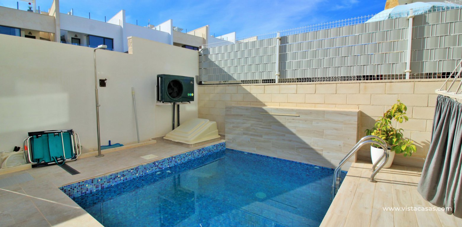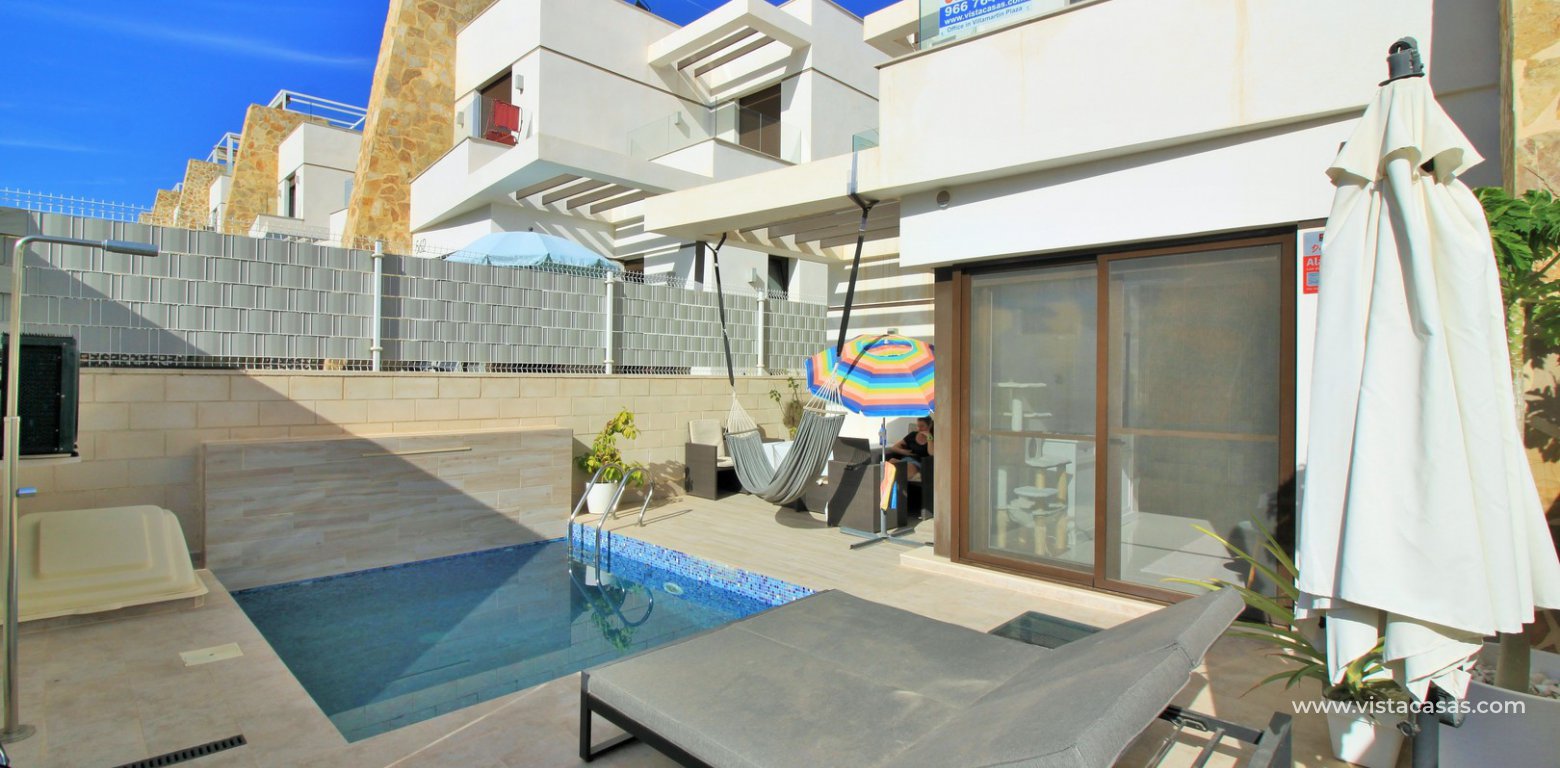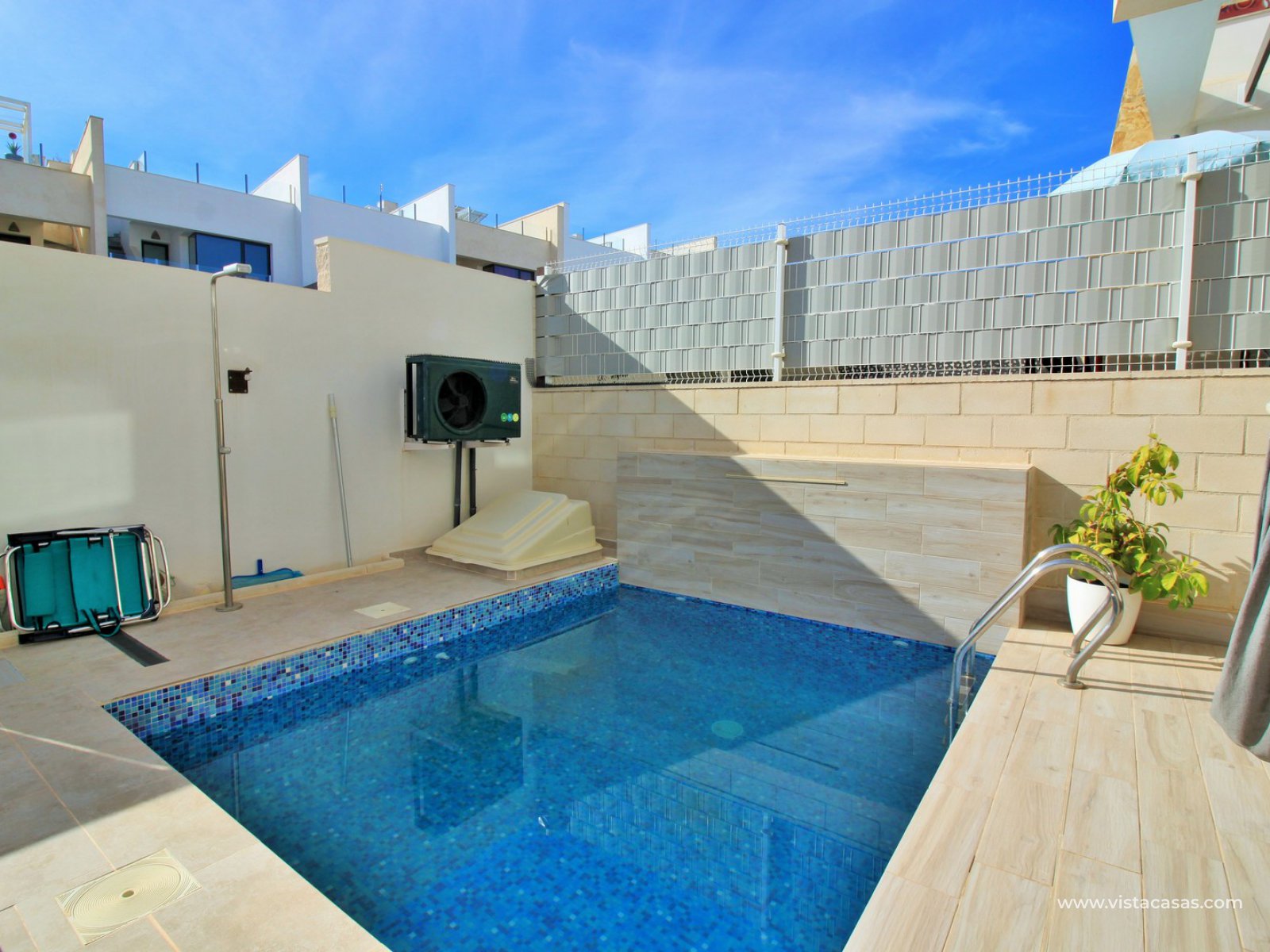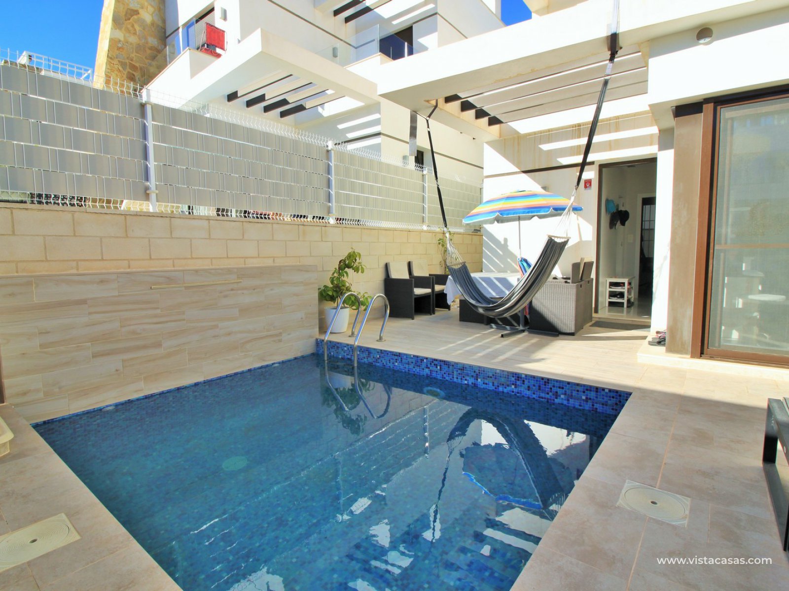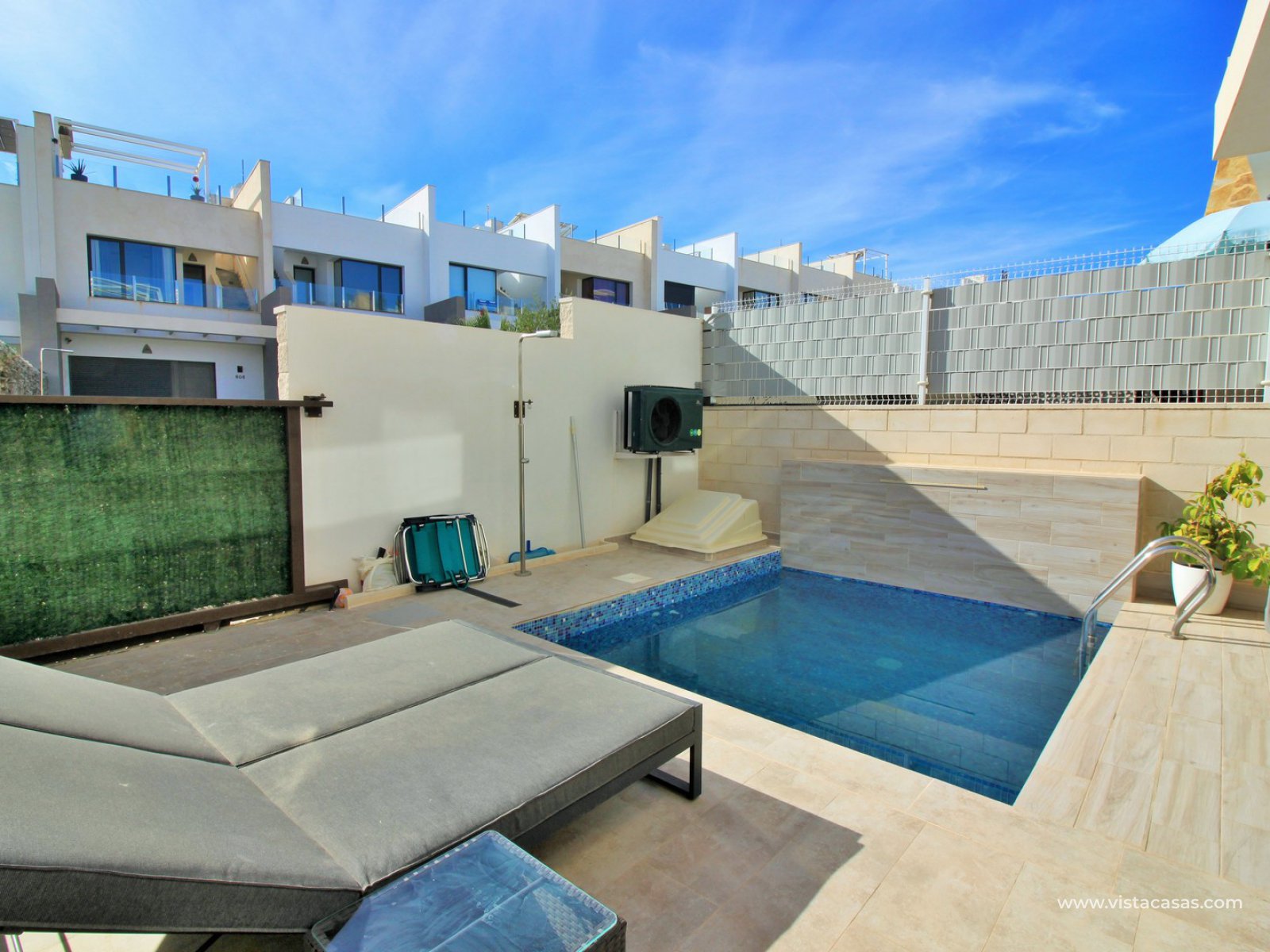 South facing 3 bedroom townhouse for sale in Entregolf, Pau 26, Villamartin. This fantastic property was built in 2017 and offers lovely outdoor space with all day sunshine including a private pool, 2 balconies and a roof solarium with views of the Torrevieja salt lakes. The ground floor comprises of a bright and airy lounge-dining area with open kitchen and built-in appliances, a bedroom with fitted wardrobes and downstairs toilet. To the rear there is a covered utility area a washing machine/dryer. Upstairs there are two bedrooms with fitted wardrobes, both of which offer private balconies. There is also a family bathroom with walk-in shower. Internal stairs from the landing leads to the roof solarium which offers a summer kitchen with BBQ area, retractable awnings, and views of the salt lakes of Torrevieja. The property is sold furnished with ducted air-conditioning throughout and has LED lighting throughout with a B energy rating. There are mosquito nets on the windows and doors. There is also electric shutters and off-road parking. Part of a community with the use of a communal pool and a petanque court just a few metres from the property.