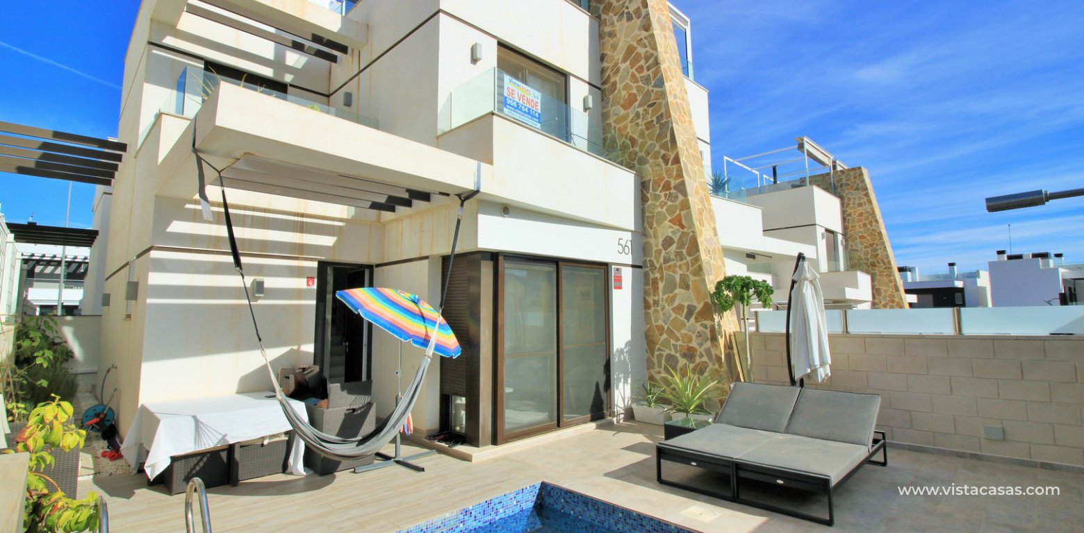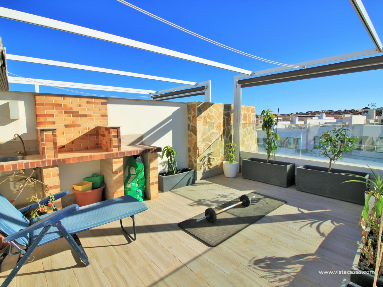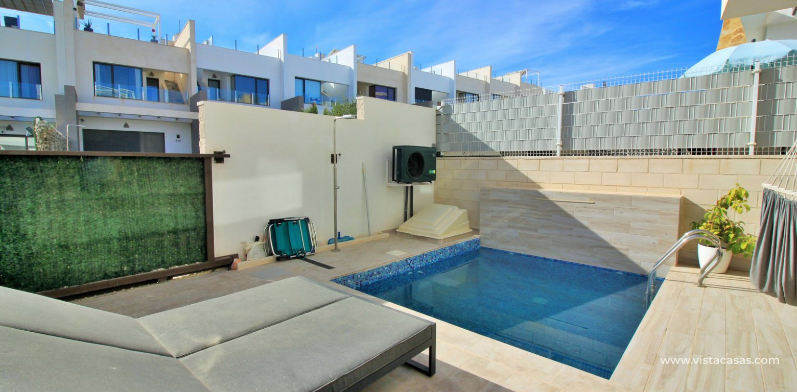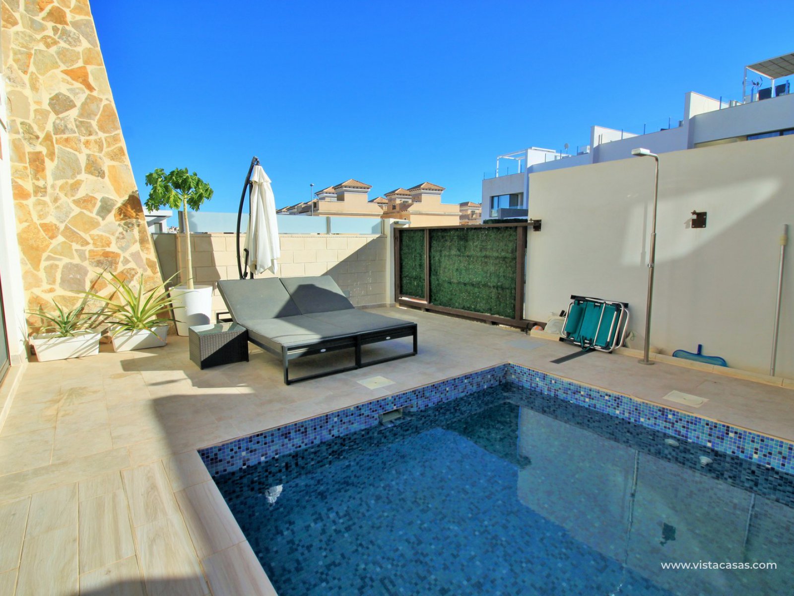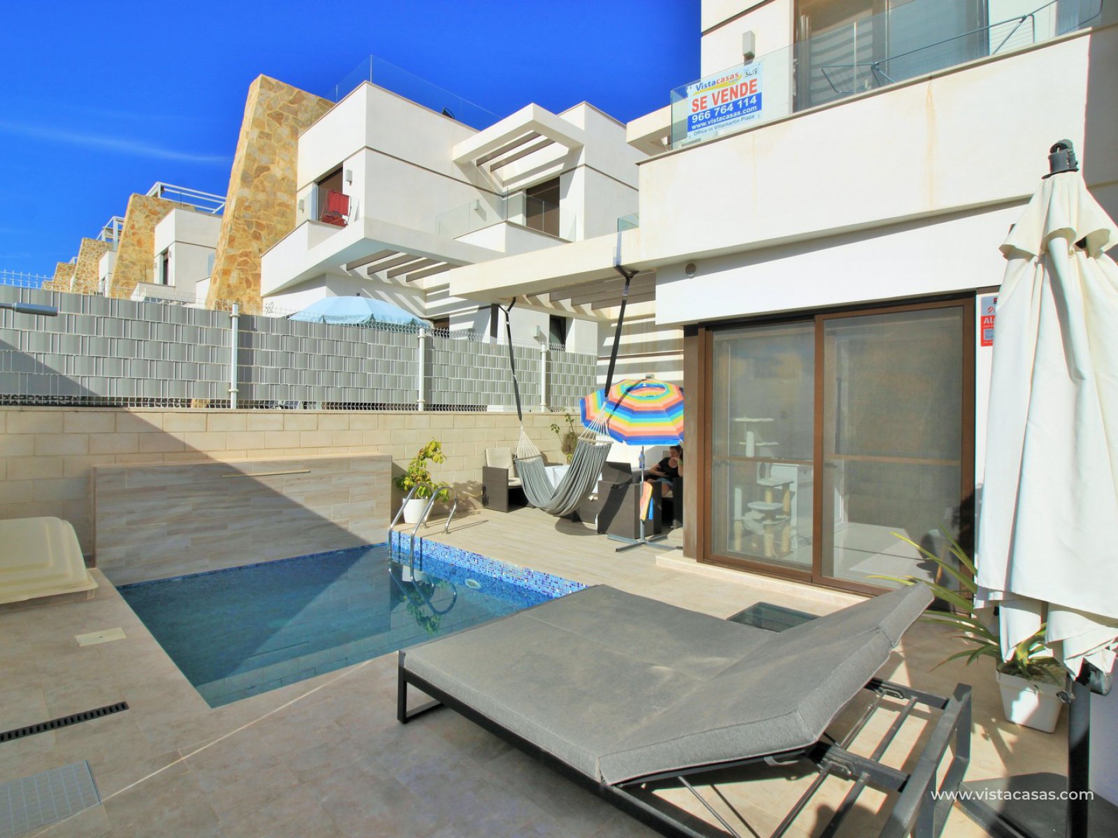 South facing 3 bedroom townhouse for sale in Entregolf, Pau 26, Villamartin. This fantastic property was built in 2017 and offers lovely outdoor space with all day sunshine including a private pool, 2 balconies and a roof solarium with views of the Torrevieja salt lakes. The ground floor comprises of a bright and airy lounge-dining area with open kitchen and built-in appliances, a bedroom with fitted wardrobes and downstairs toilet. To the rear there is a covered utility area a washing machine/dryer. Upstairs there are two bedrooms with fitted wardrobes, both of which offer private balconies. There is also a family bathroom with walk-in shower. Internal stairs from the landing leads to the roof solarium which offers a summer kitchen with BBQ area, retractable awnings, and views of the salt lakes of Torrevieja. The property is sold furnished with ducted air-conditioning throughout and has LED lighting throughout with a B energy rating. There are mosquito nets on the windows and doors. There is also electric shutters and off-road parking. Part of a community with the use of a communal pool and a petanque court just a few metres from the property.