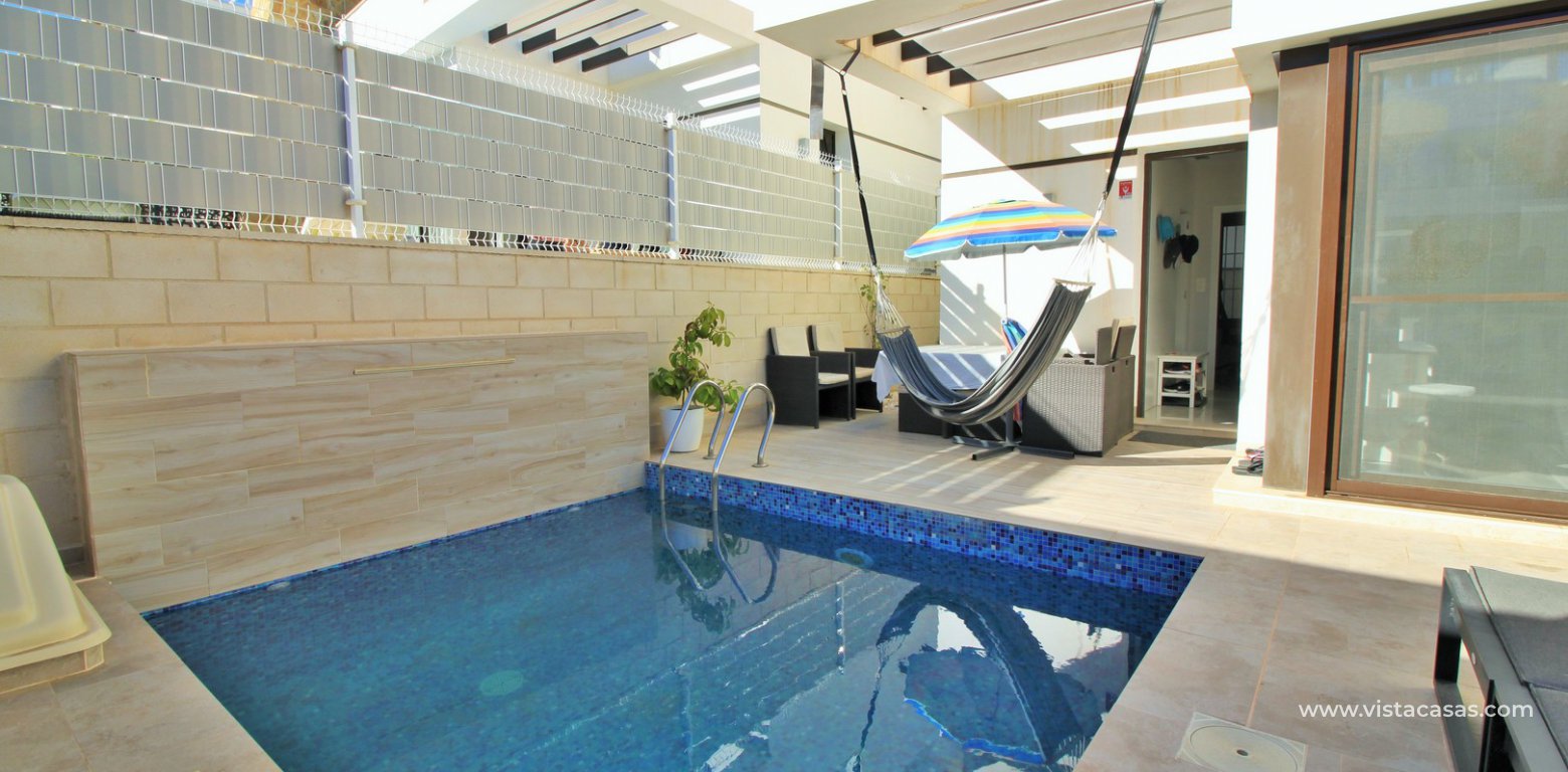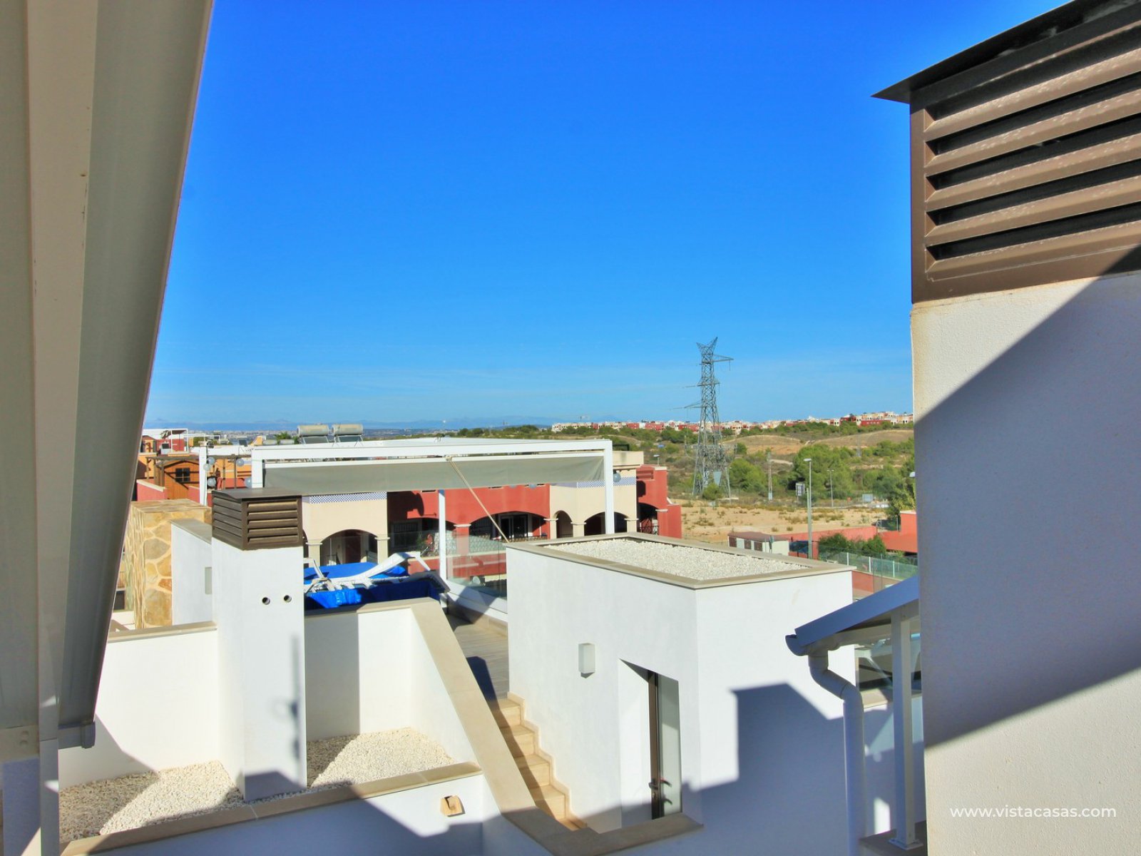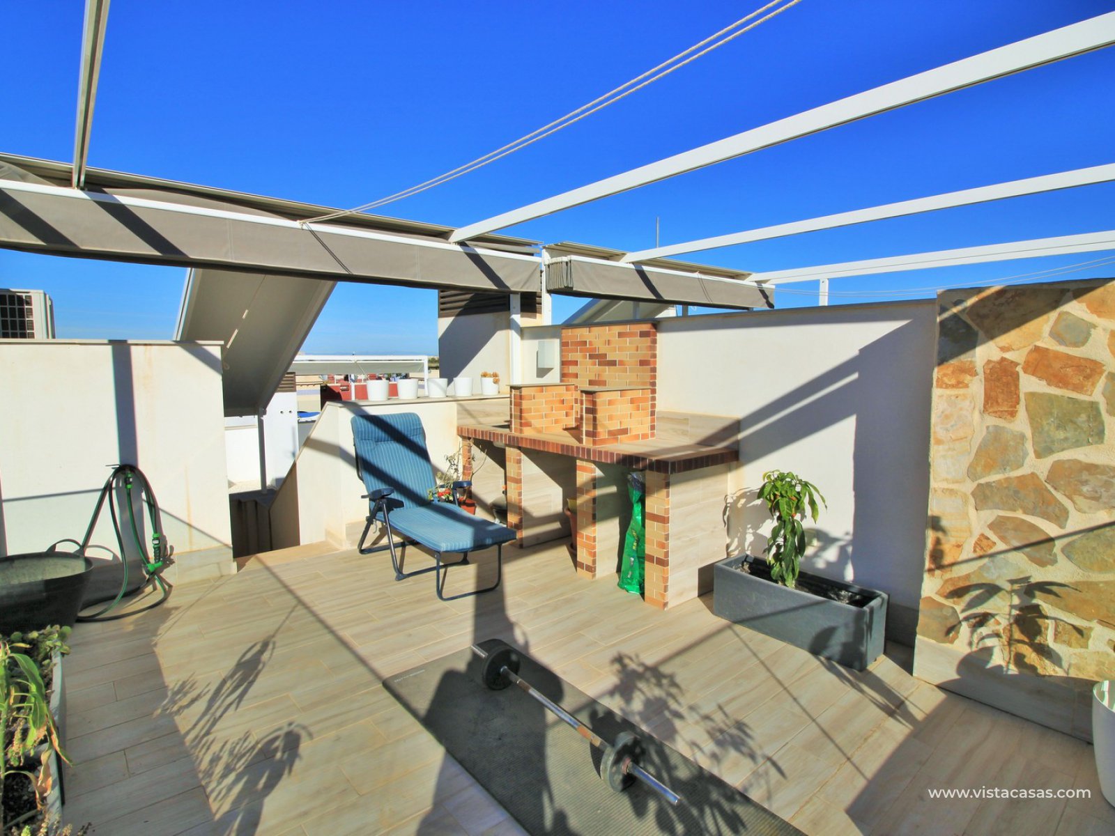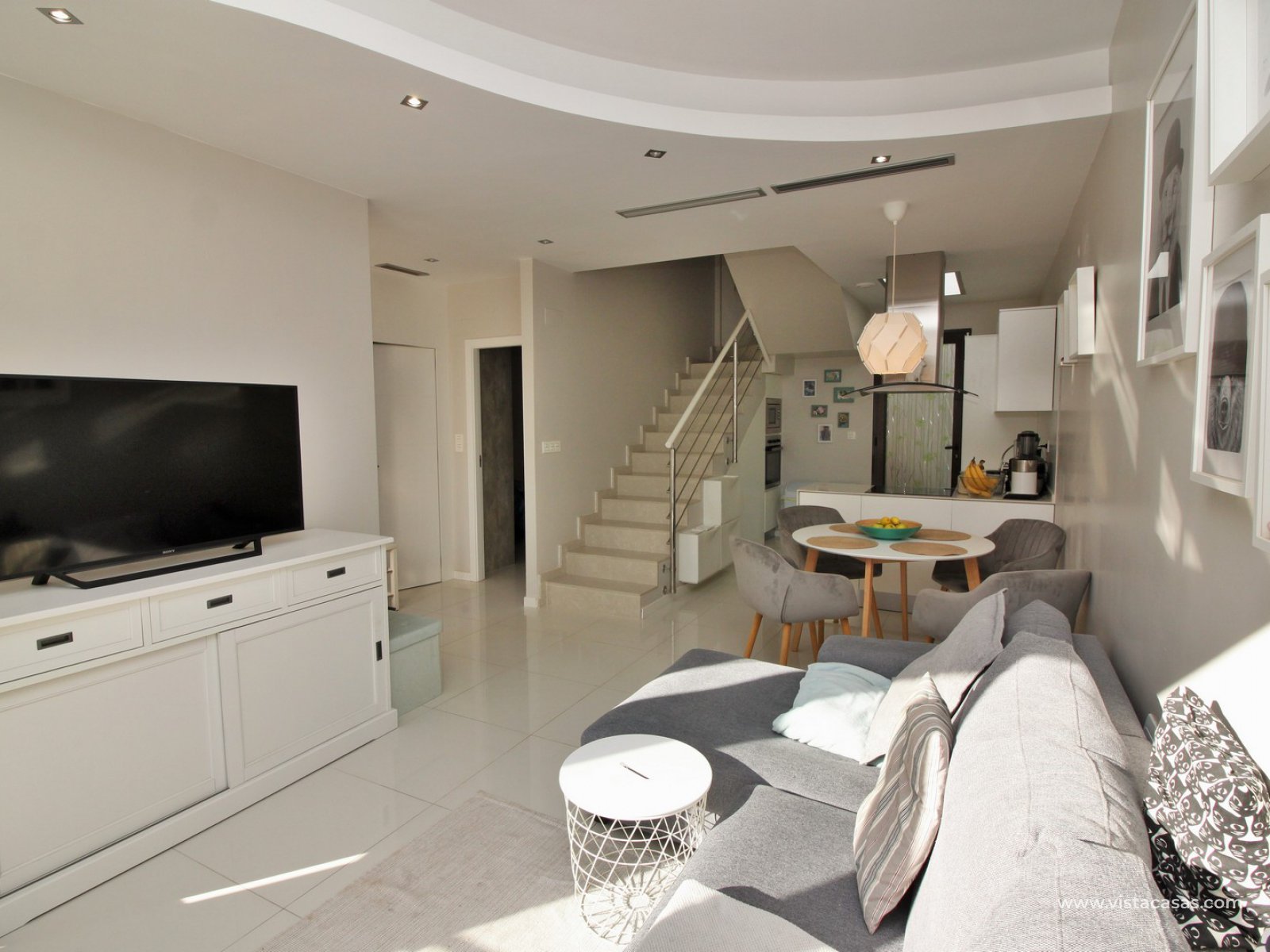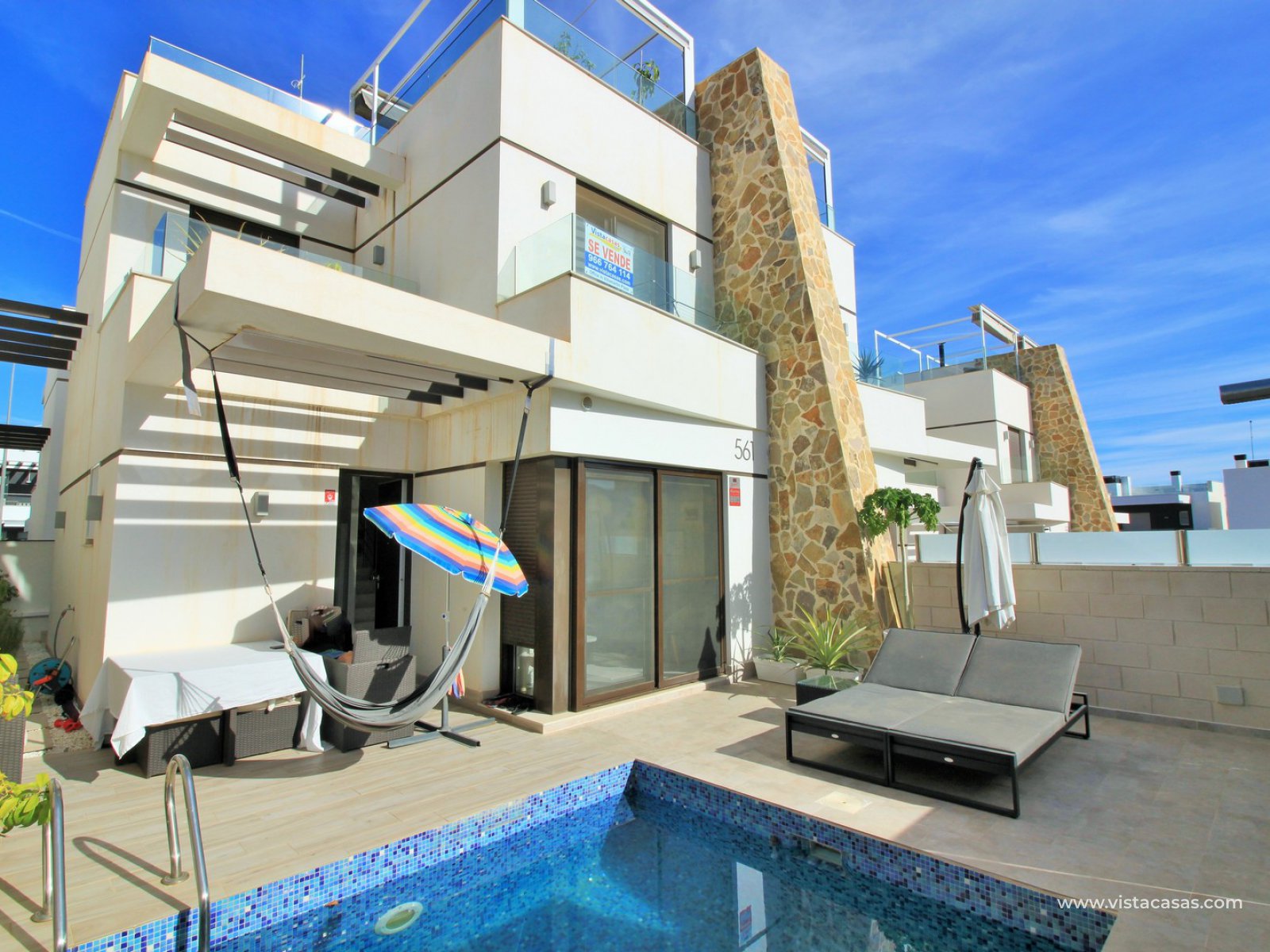 South facing 3 bedroom townhouse for sale in Entregolf, Pau 26, Villamartin. This fantastic property was built in 2017 and offers lovely outdoor space with all day sunshine including a private pool, 2 balconies and a roof solarium with views of the Torrevieja salt lakes. The ground floor comprises of a bright and airy lounge-dining area with open kitchen and built-in appliances, a bedroom with fitted wardrobes and downstairs toilet. To the rear there is a covered utility area a washing machine/dryer. Upstairs there are two bedrooms with fitted wardrobes, both of which offer private balconies. There is also a family bathroom with walk-in shower. Internal stairs from the landing leads to the roof solarium which offers a summer kitchen with BBQ area, retractable awnings, and views of the salt lakes of Torrevieja. The property is sold furnished with ducted air-conditioning throughout and has LED lighting throughout with a B energy rating. There are mosquito nets on the windows and doors. There is also electric shutters and off-road parking. Part of a community with the use of a communal pool and a petanque court just a few metres from the property.