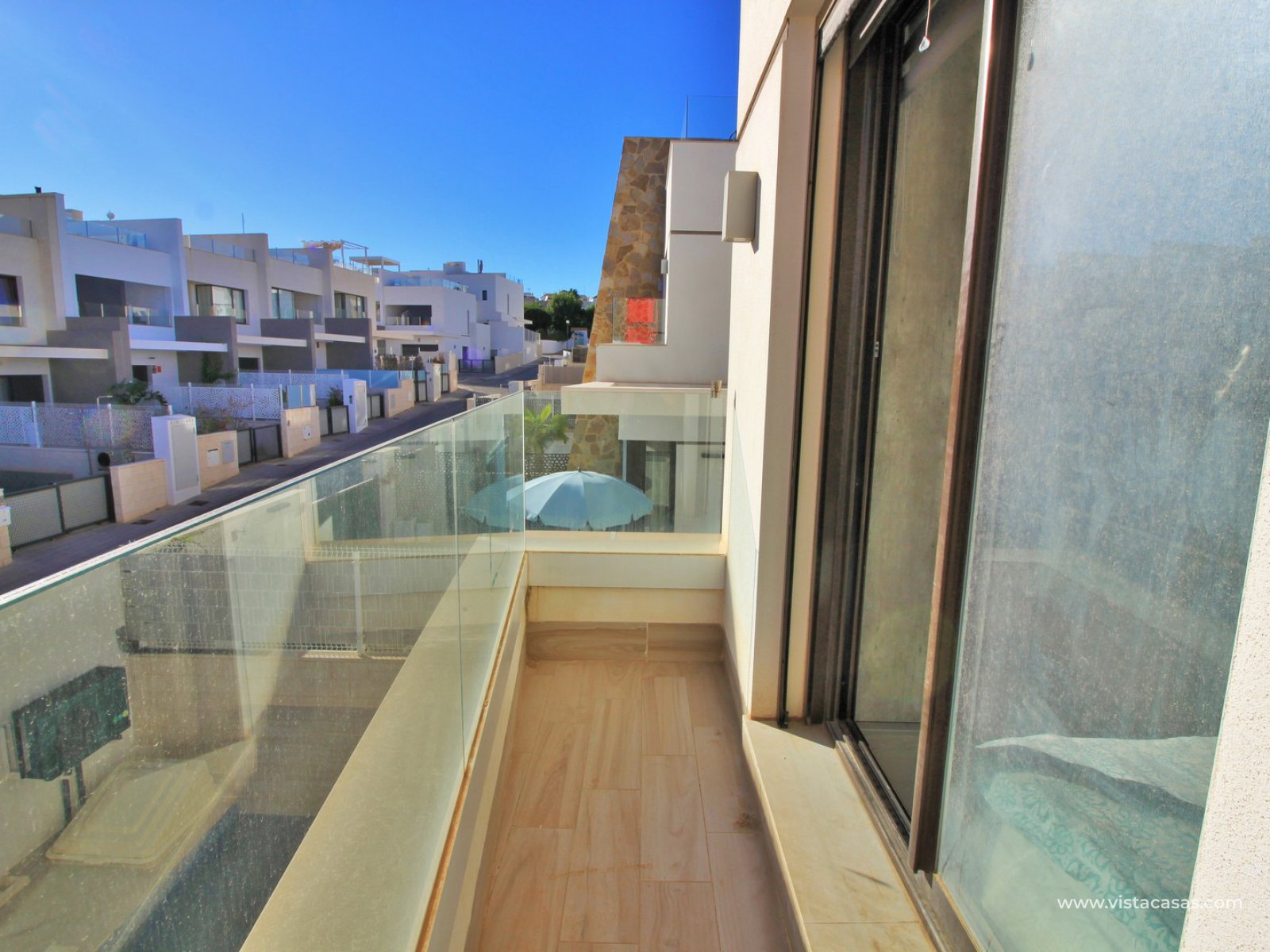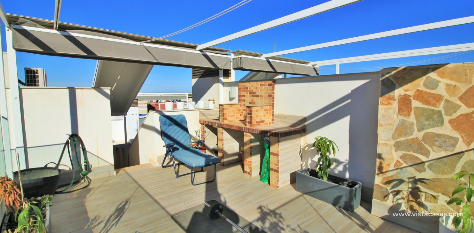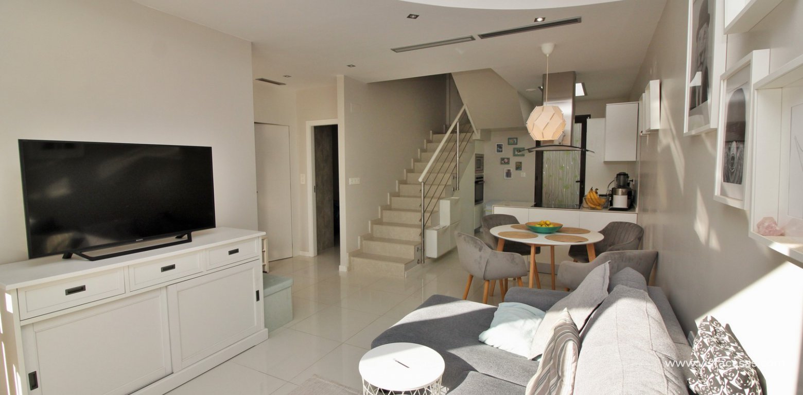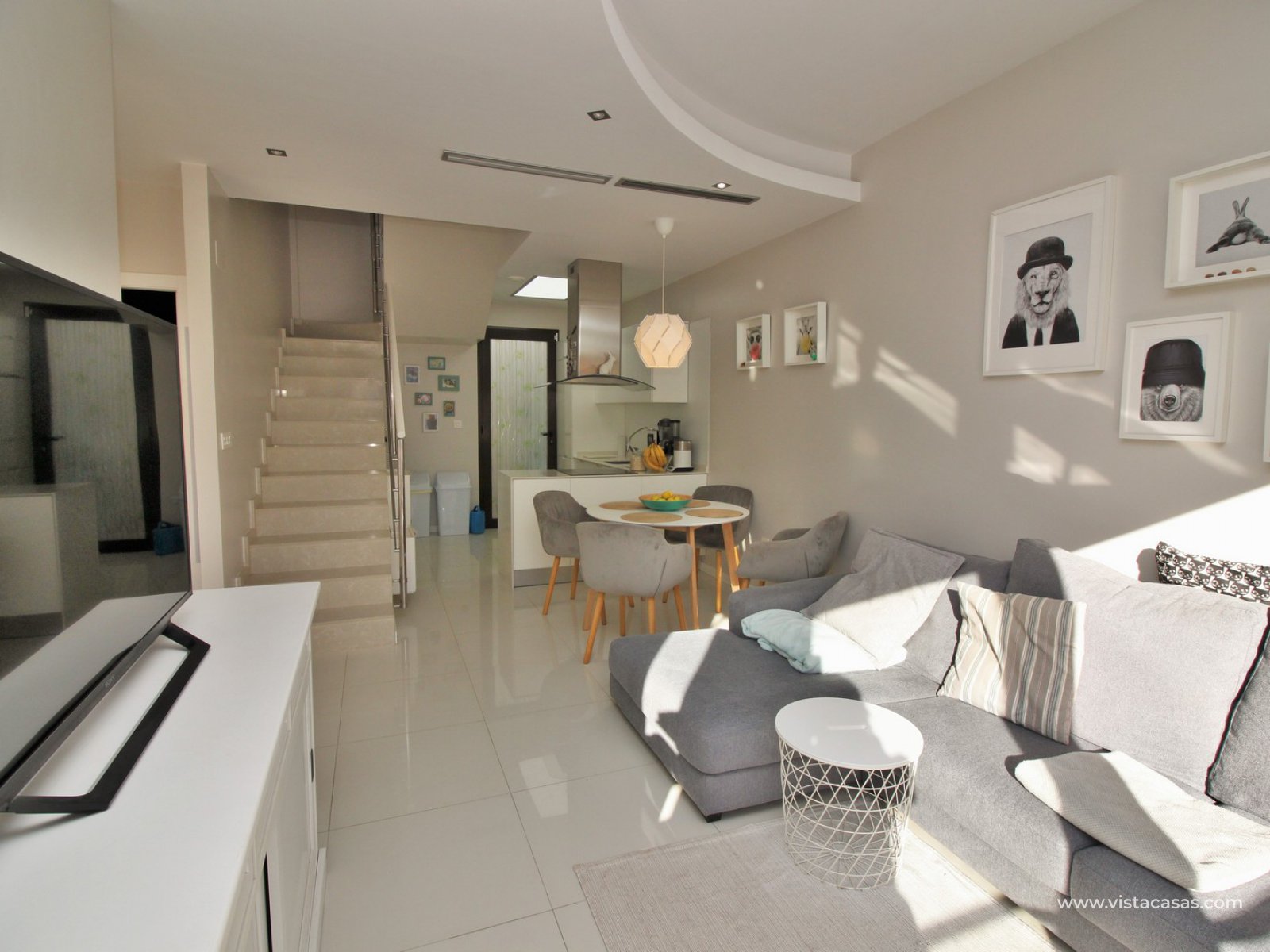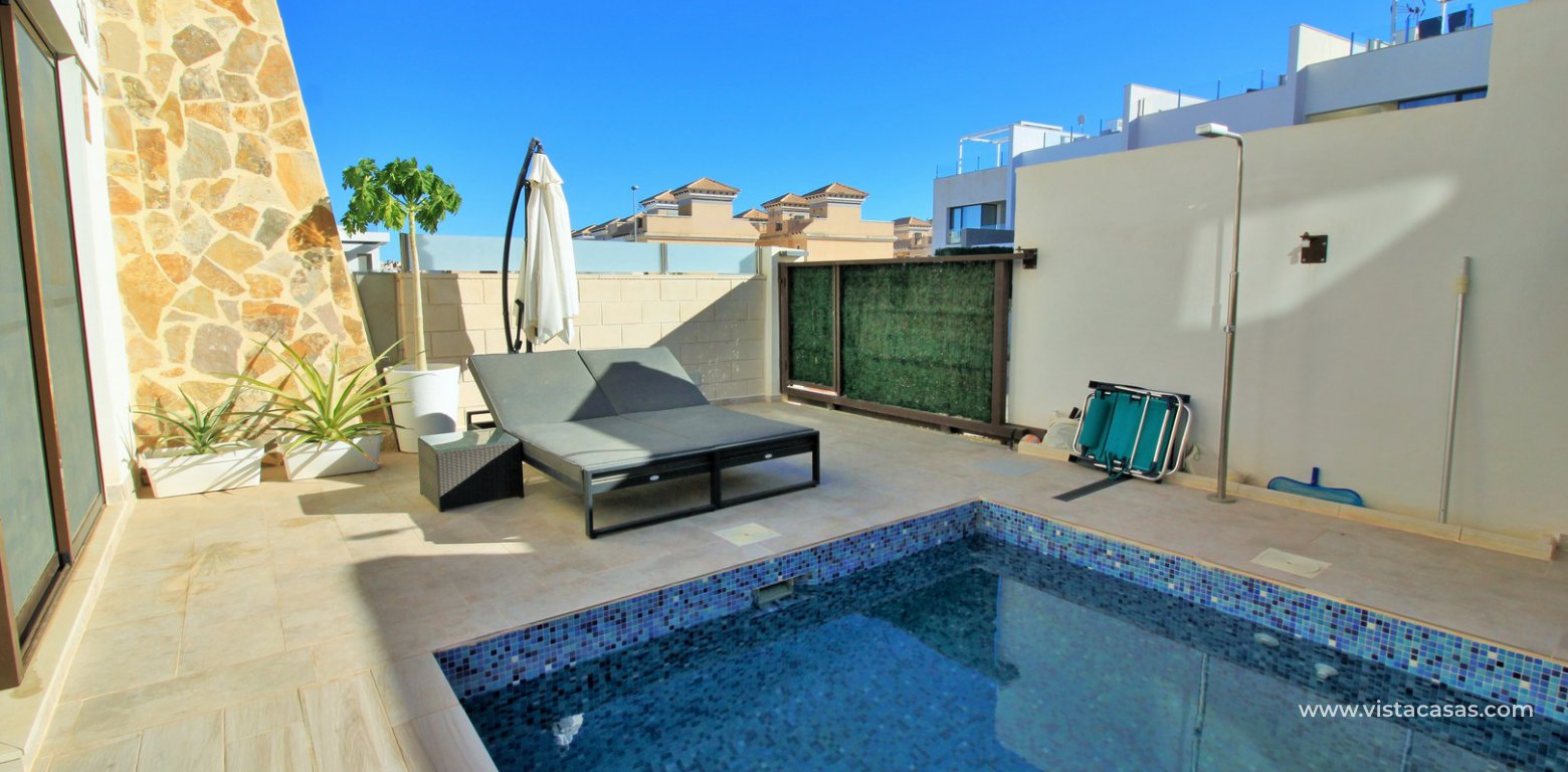 South facing 3 bedroom townhouse for sale in Entregolf, Pau 26, Villamartin. This fantastic property was built in 2017 and offers lovely outdoor space with all day sunshine including a private pool, 2 balconies and a roof solarium with views of the Torrevieja salt lakes. The ground floor comprises of a bright and airy lounge-dining area with open kitchen and built-in appliances, a bedroom with fitted wardrobes and downstairs toilet. To the rear there is a covered utility area a washing machine/dryer. Upstairs there are two bedrooms with fitted wardrobes, both of which offer private balconies. There is also a family bathroom with walk-in shower. Internal stairs from the landing leads to the roof solarium which offers a summer kitchen with BBQ area, retractable awnings, and views of the salt lakes of Torrevieja. The property is sold furnished with ducted air-conditioning throughout and has LED lighting throughout with a B energy rating. There are mosquito nets on the windows and doors. There is also electric shutters and off-road parking. Part of a community with the use of a communal pool and a petanque court just a few metres from the property.