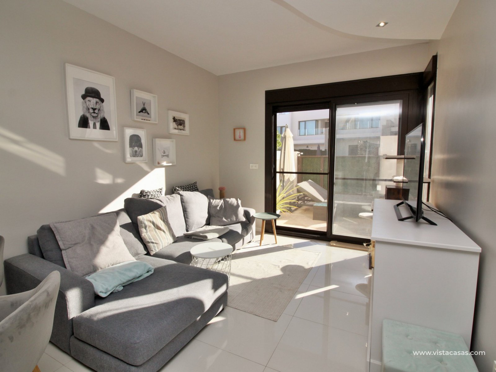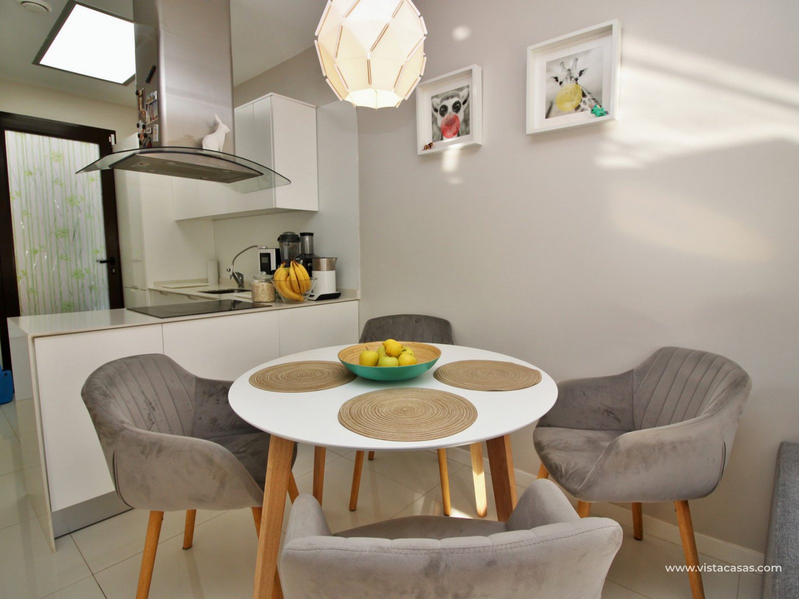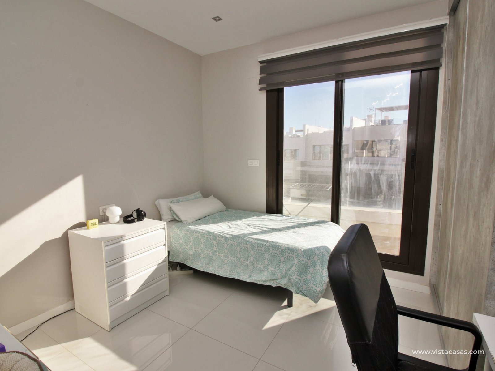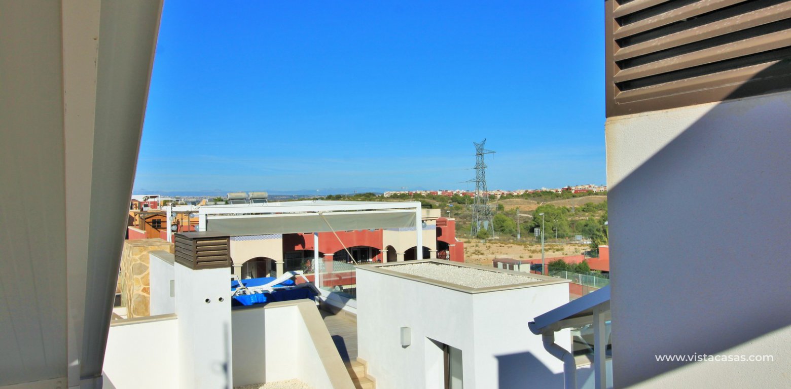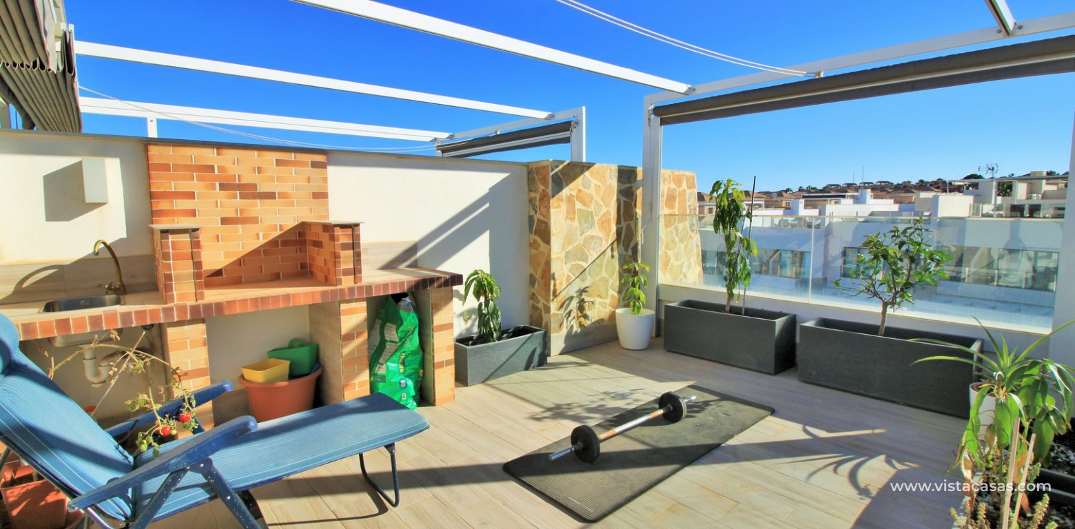South facing 3 bedroom townhouse for sale in Entregolf, Pau 26, Villamartin. This fantastic property was built in 2017 and offers lovely outdoor space with all day sunshine including a private pool, 2 balconies and a roof solarium with views of the Torrevieja salt lakes. The ground floor comprises of a bright and airy lounge-dining area with open kitchen and built-in appliances, a bedroom with fitted wardrobes and downstairs toilet. To the rear there is a covered utility area a washing machine/dryer. Upstairs there are two bedrooms with fitted wardrobes, both of which offer private balconies. There is also a family bathroom with walk-in shower. Internal stairs from the landing leads to the roof solarium which offers a summer kitchen with BBQ area, retractable awnings, and views of the salt lakes of Torrevieja. The property is sold furnished with ducted air-conditioning throughout and has LED lighting throughout with a B energy rating. There are mosquito nets on the windows and doors. There is also electric shutters and off-road parking. Part of a community with the use of a communal pool and a petanque court just a few metres from the property.