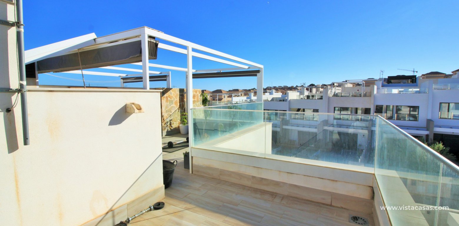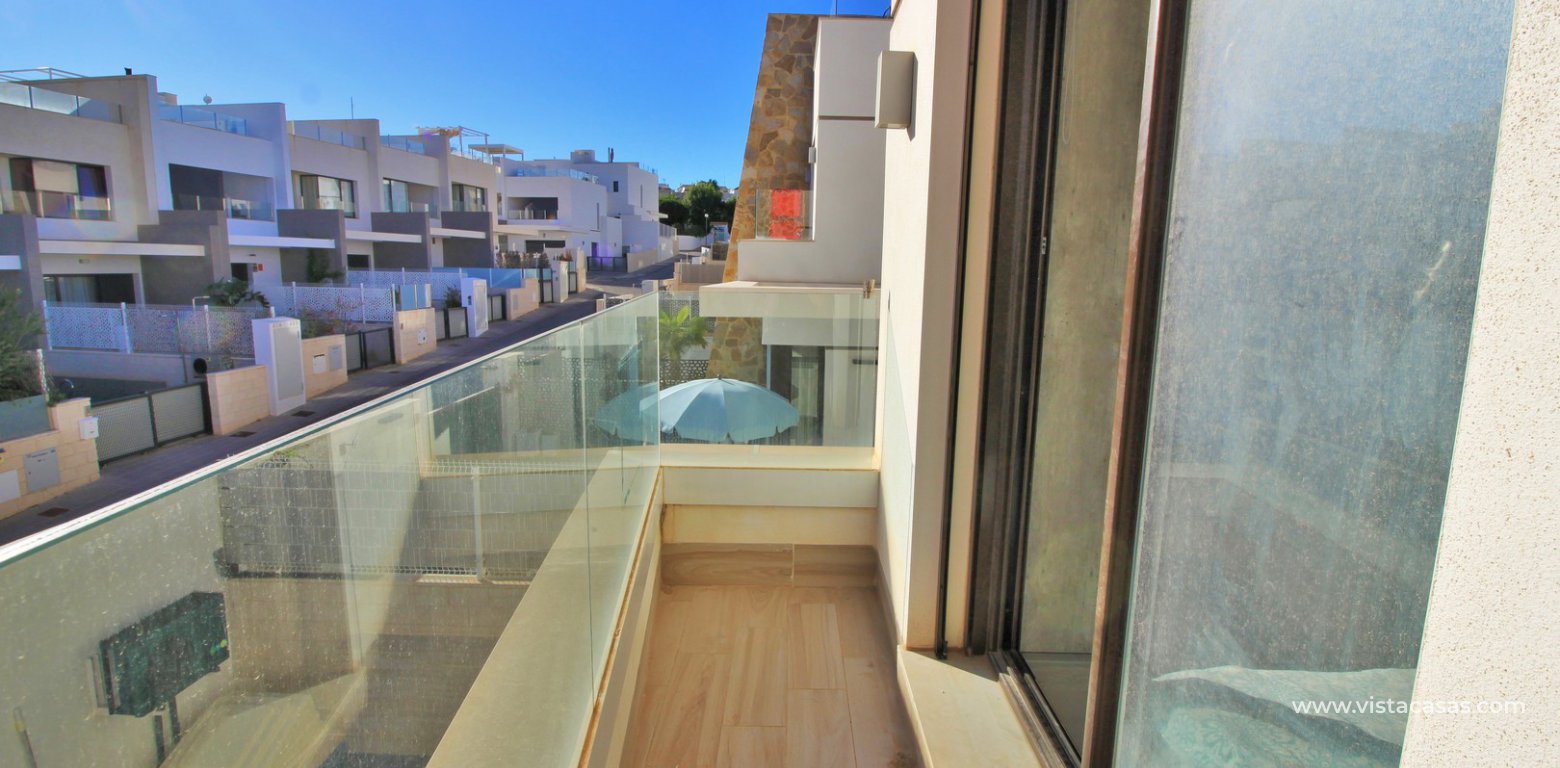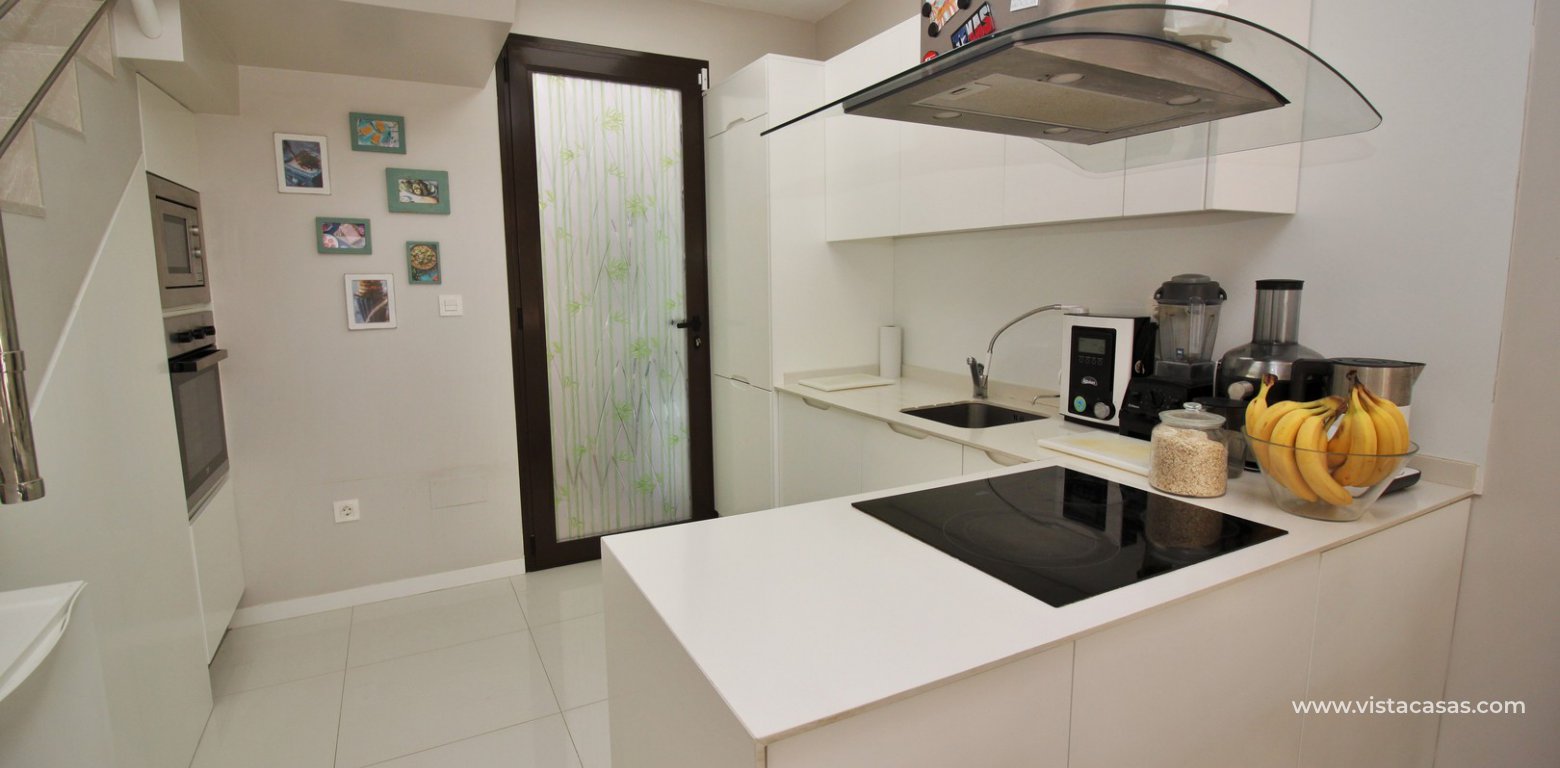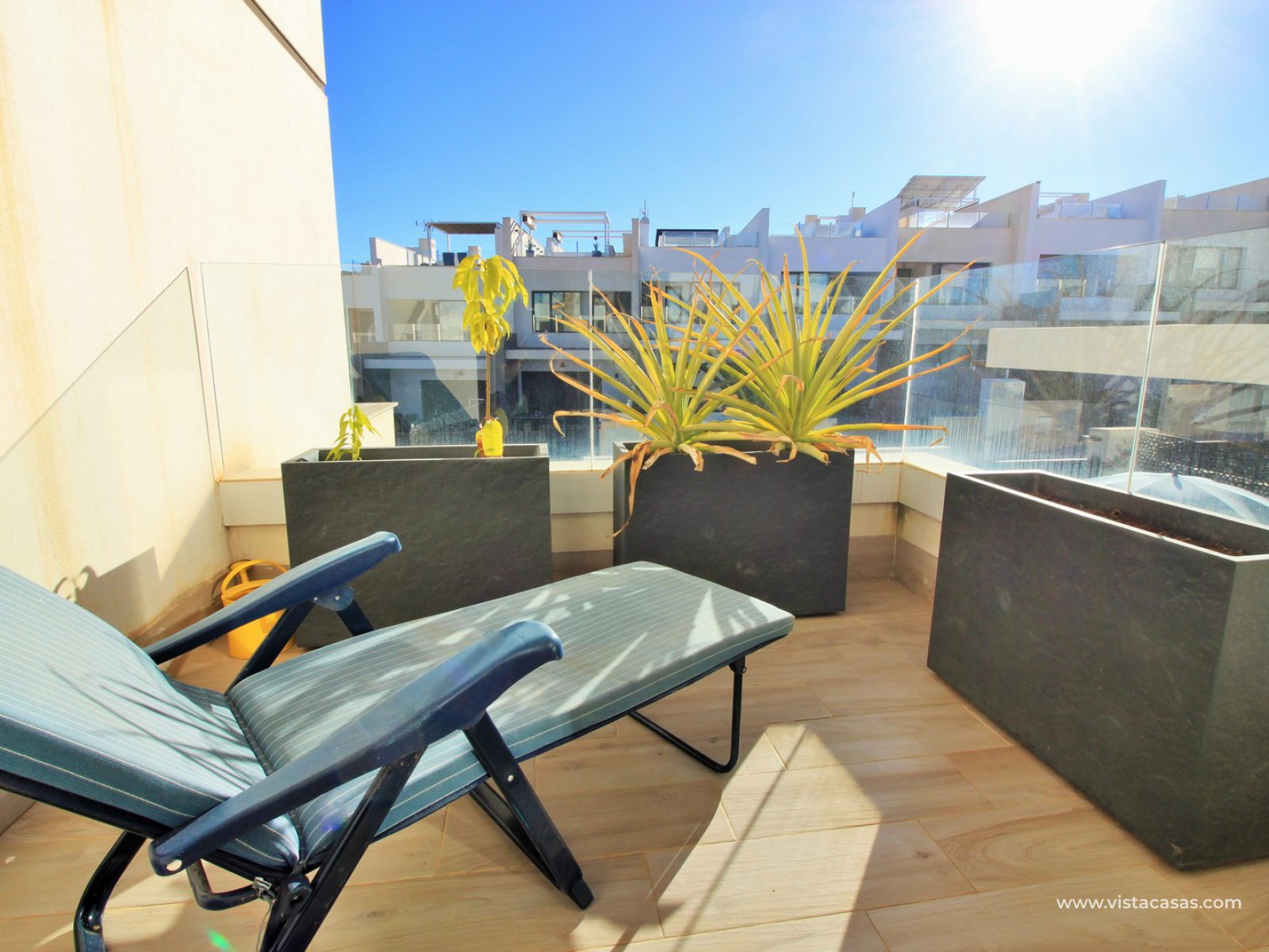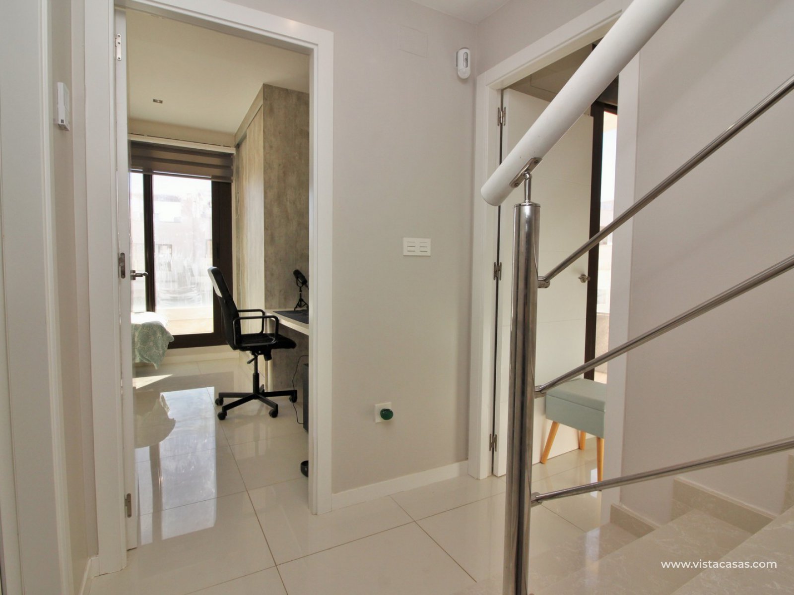South facing 3 bedroom townhouse for sale in Entregolf, Pau 26, Villamartin. This fantastic property was built in 2017 and offers lovely outdoor space with all day sunshine including a private pool, 2 balconies and a roof solarium with views of the Torrevieja salt lakes. The ground floor comprises of a bright and airy lounge-dining area with open kitchen and built-in appliances, a bedroom with fitted wardrobes and downstairs toilet. To the rear there is a covered utility area a washing machine/dryer. Upstairs there are two bedrooms with fitted wardrobes, both of which offer private balconies. There is also a family bathroom with walk-in shower. Internal stairs from the landing leads to the roof solarium which offers a summer kitchen with BBQ area, retractable awnings, and views of the salt lakes of Torrevieja. The property is sold furnished with ducted air-conditioning throughout and has LED lighting throughout with a B energy rating. There are mosquito nets on the windows and doors. There is also electric shutters and off-road parking. Part of a community with the use of a communal pool and a petanque court just a few metres from the property.