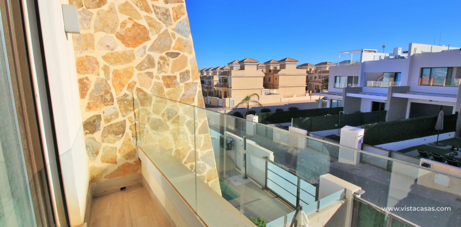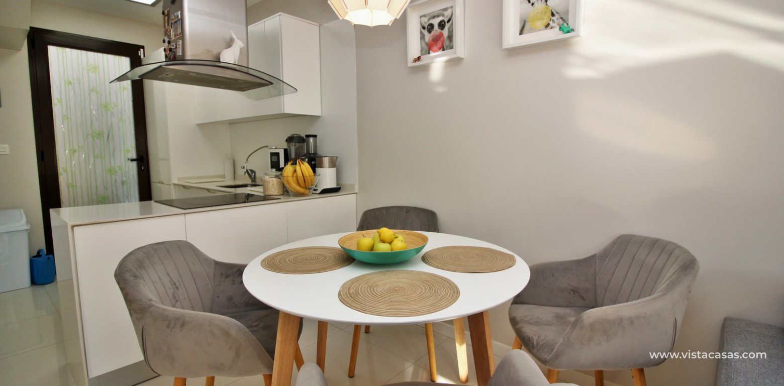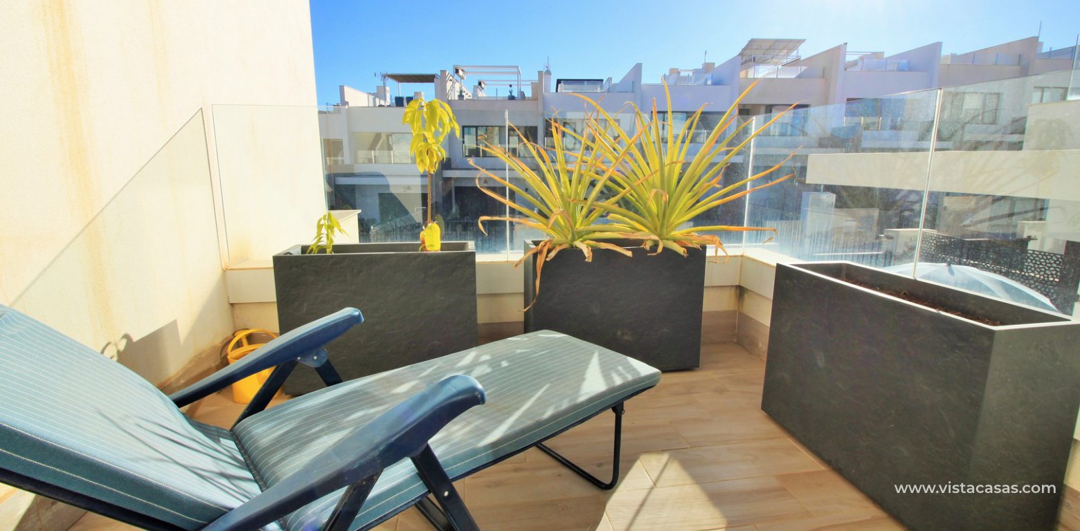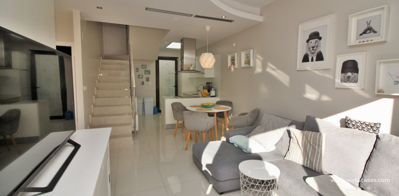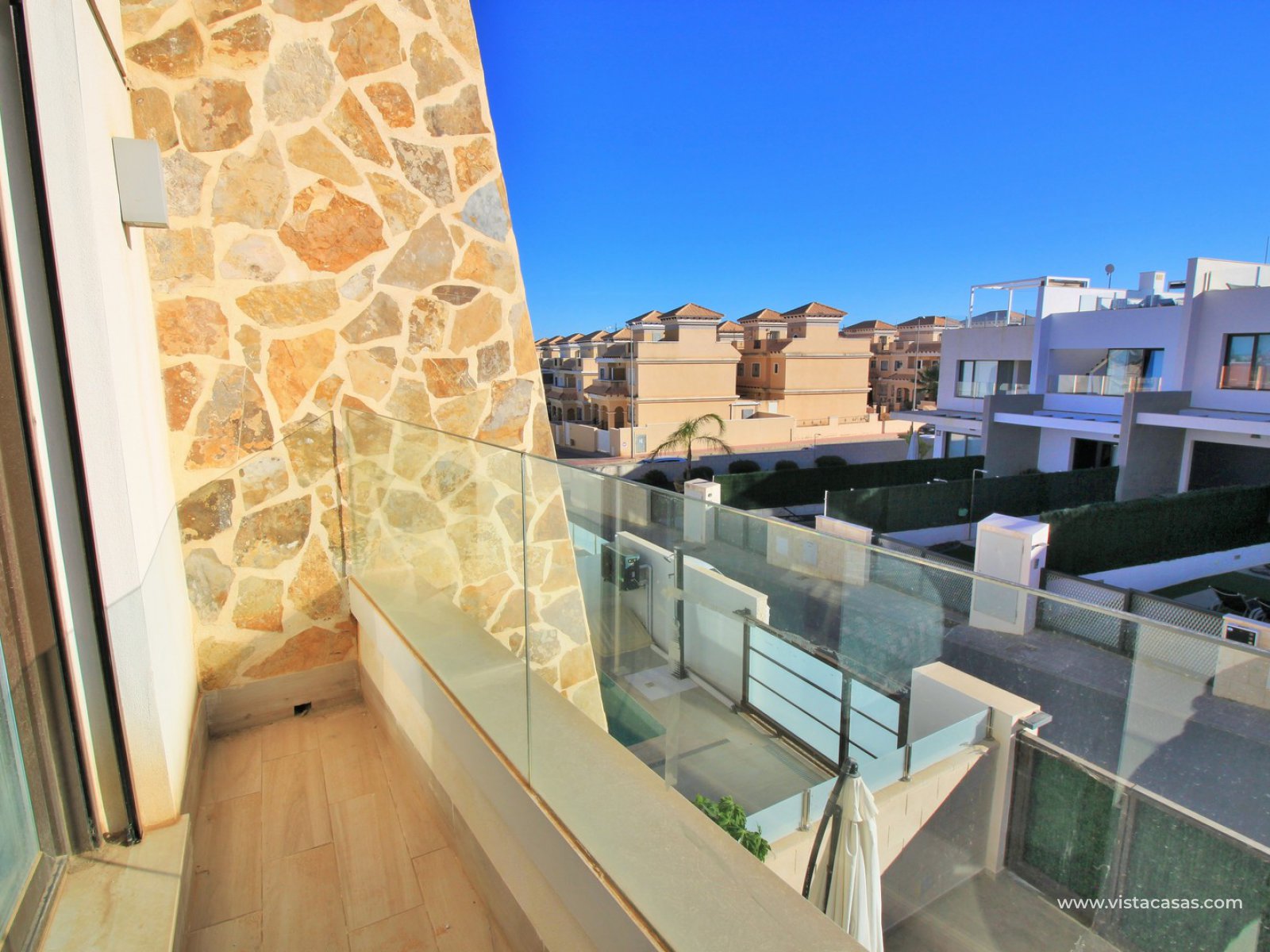 South facing 3 bedroom townhouse for sale in Entregolf, Pau 26, Villamartin. This fantastic property was built in 2017 and offers lovely outdoor space with all day sunshine including a private pool, 2 balconies and a roof solarium with views of the Torrevieja salt lakes. The ground floor comprises of a bright and airy lounge-dining area with open kitchen and built-in appliances, a bedroom with fitted wardrobes and downstairs toilet. To the rear there is a covered utility area a washing machine/dryer. Upstairs there are two bedrooms with fitted wardrobes, both of which offer private balconies. There is also a family bathroom with walk-in shower. Internal stairs from the landing leads to the roof solarium which offers a summer kitchen with BBQ area, retractable awnings, and views of the salt lakes of Torrevieja. The property is sold furnished with ducted air-conditioning throughout and has LED lighting throughout with a B energy rating. There are mosquito nets on the windows and doors. There is also electric shutters and off-road parking. Part of a community with the use of a communal pool and a petanque court just a few metres from the property.