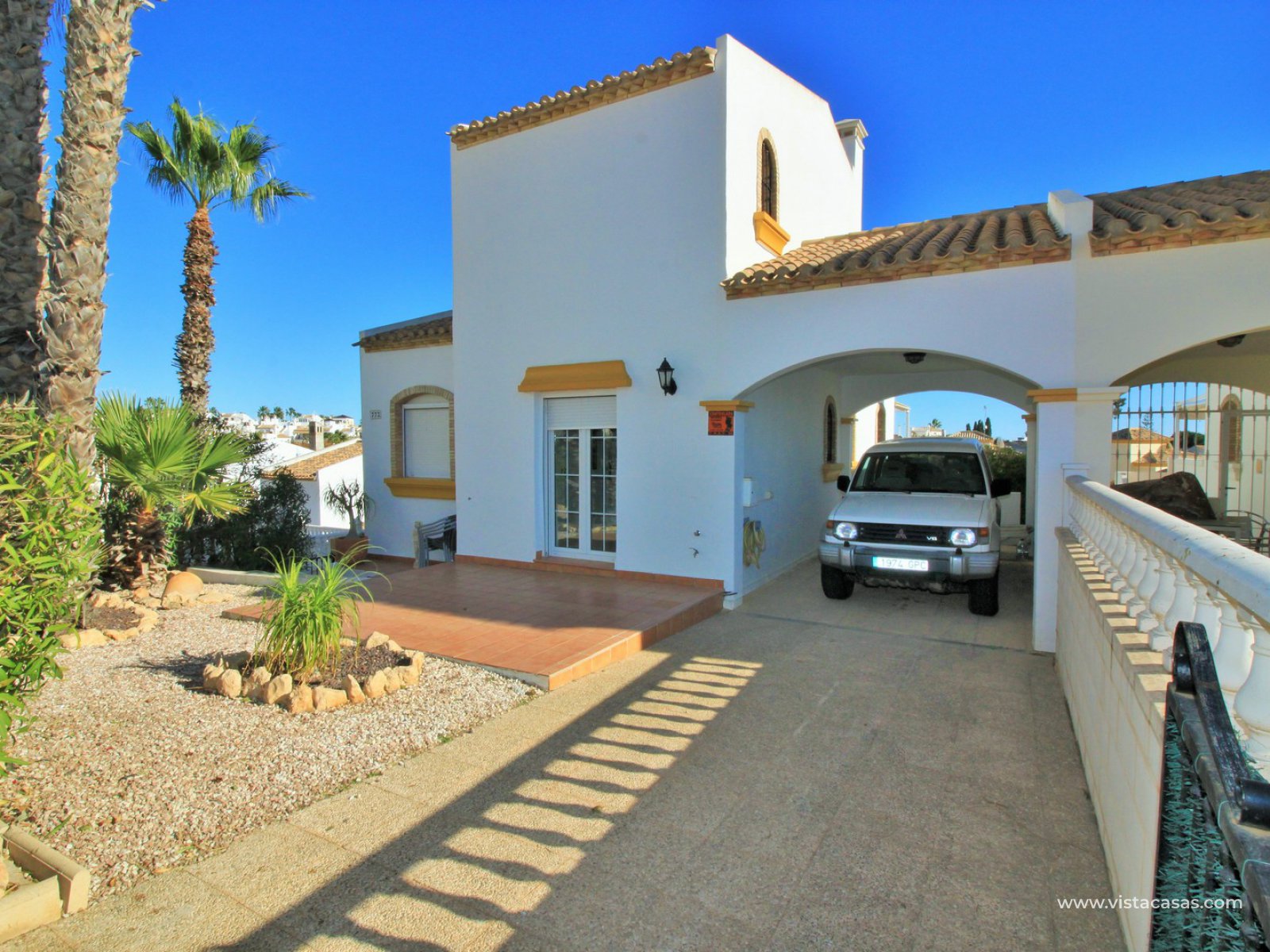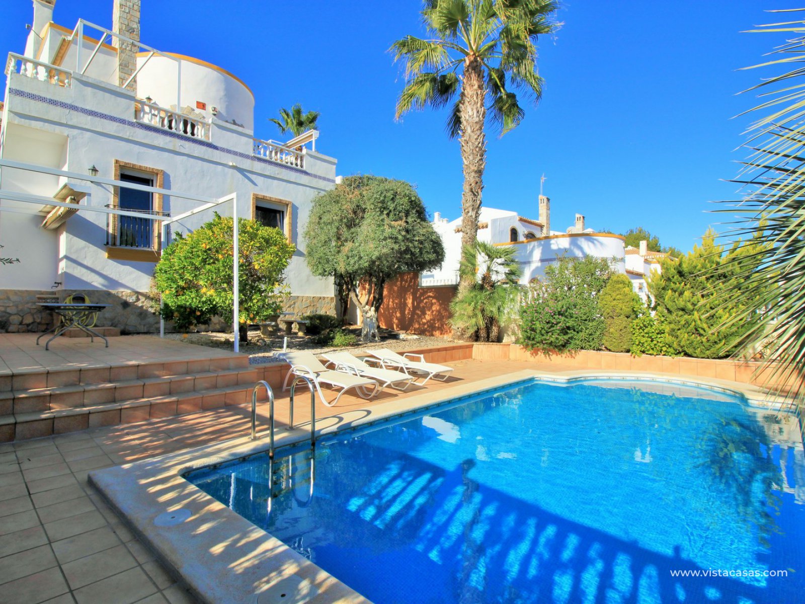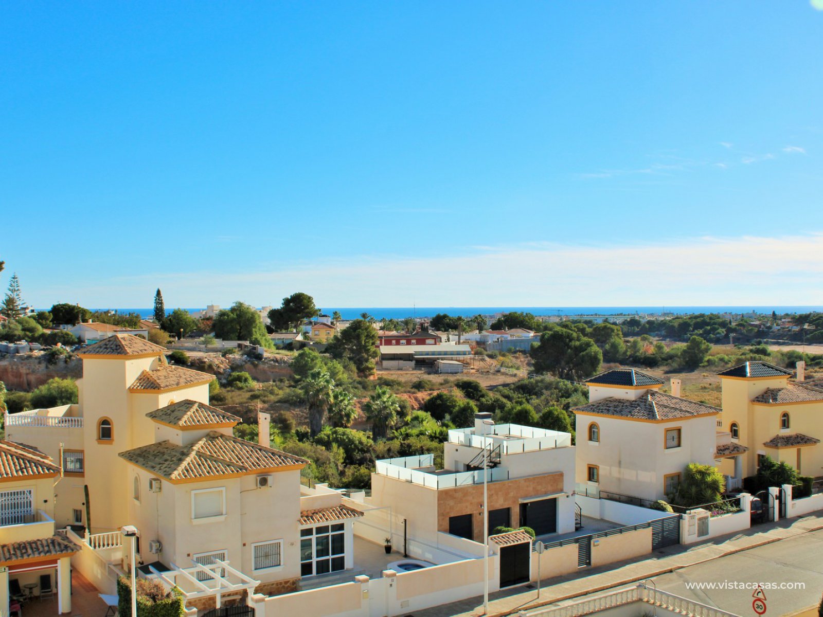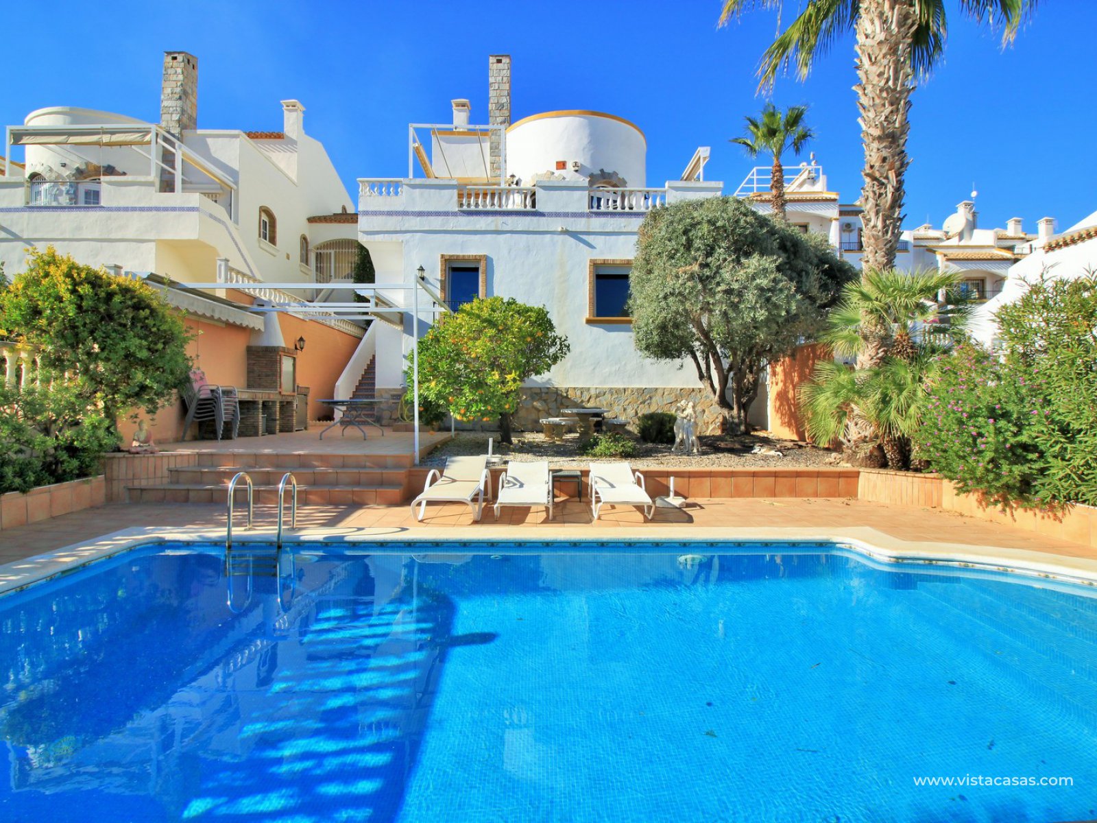 Spacious 3 bedroom Ibiza style detached villa with private pool for sale in the sought-after community of R15 in Los Dolses, Orihuela Costa. This wonderful property offers great outdoor space, including front and rear gardens, a raised terrace and roof solarium which both offer sea views. There is also covered off-road parking with a large private swimming pool, plus a large underbuild perfect for storage or a possible conversion into an independent annex. Located just 700m from the Los Dolses commercial centre, which offers a variety of services including a supermarket, bars, restaurants, shops, and a bus stop.