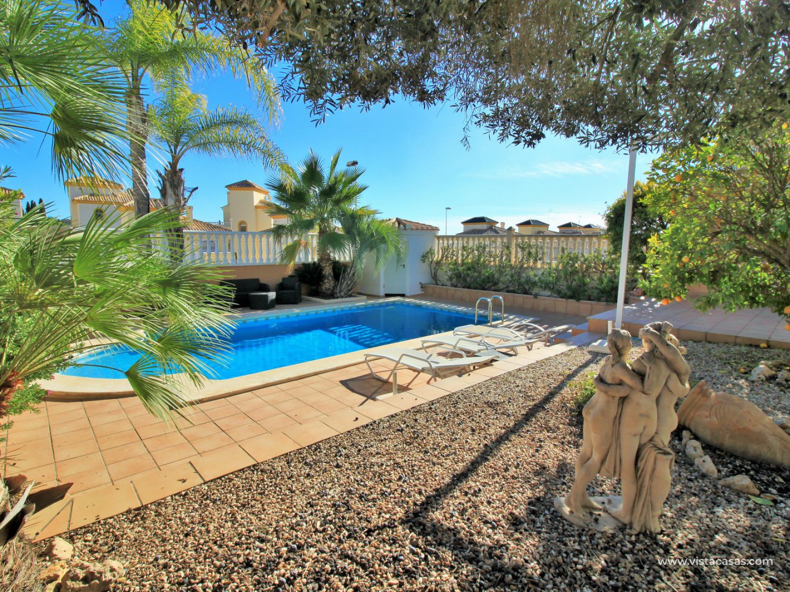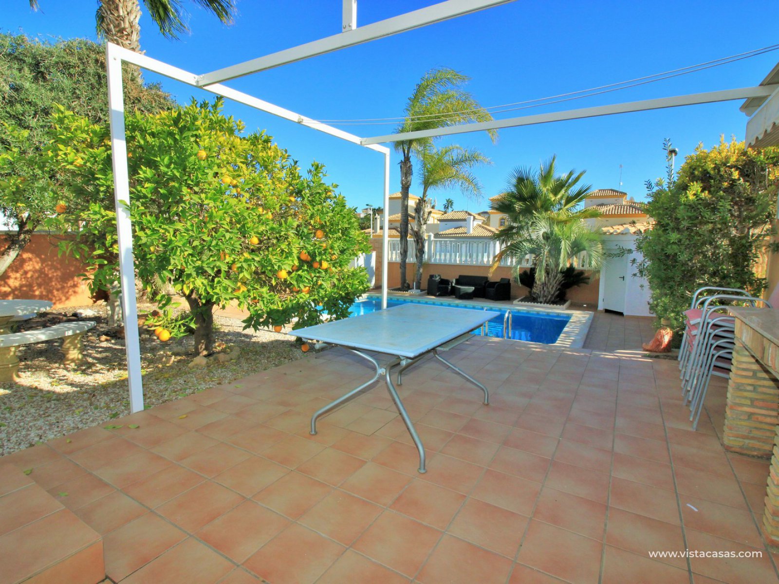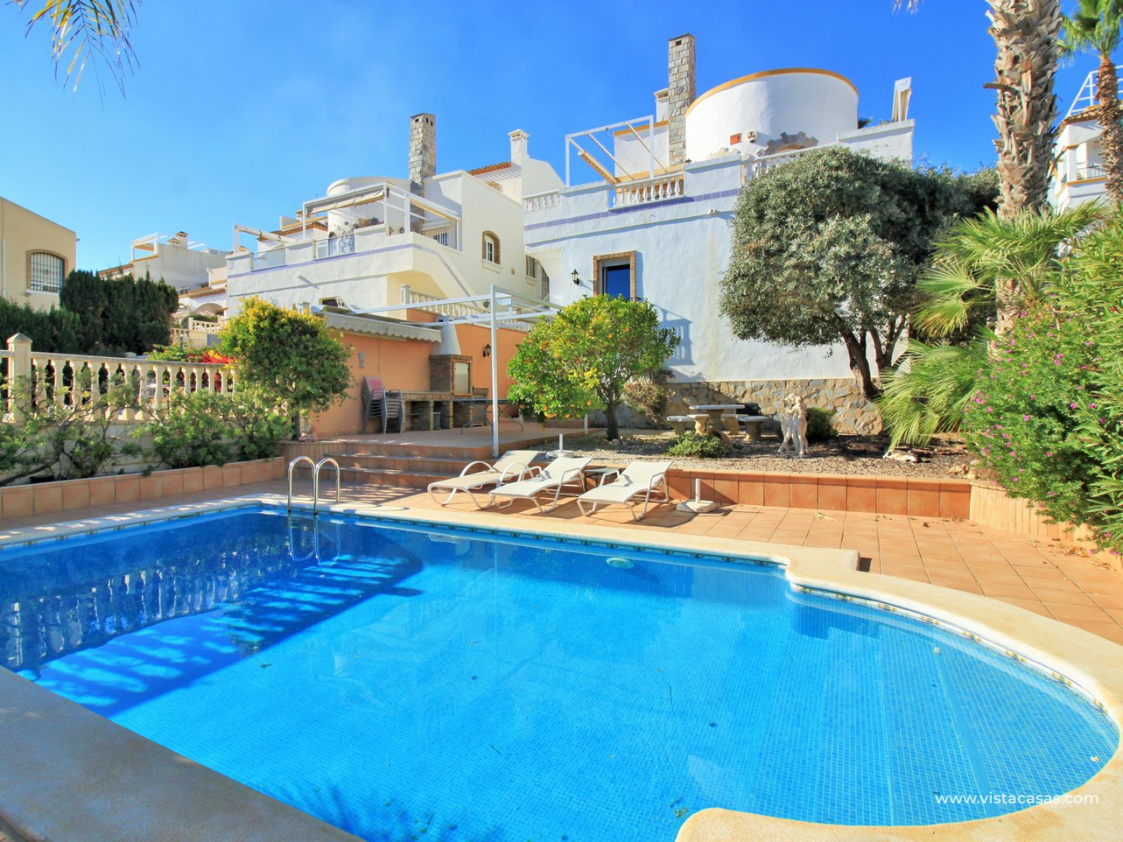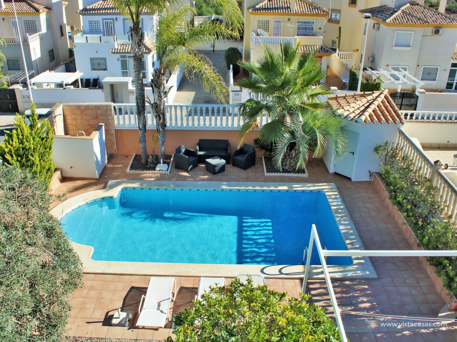 Spacious 3 bedroom Ibiza style detached villa with private pool for sale in the sought-after community of R15 in Los Dolses, Orihuela Costa. This wonderful property offers great outdoor space, including front and rear gardens, a raised terrace and roof solarium which both offer sea views. There is also covered off-road parking with a large private swimming pool, plus a large underbuild perfect for storage or a possible conversion into an independent annex. Located just 700m from the Los Dolses commercial centre, which offers a variety of services including a supermarket, bars, restaurants, shops, and a bus stop.