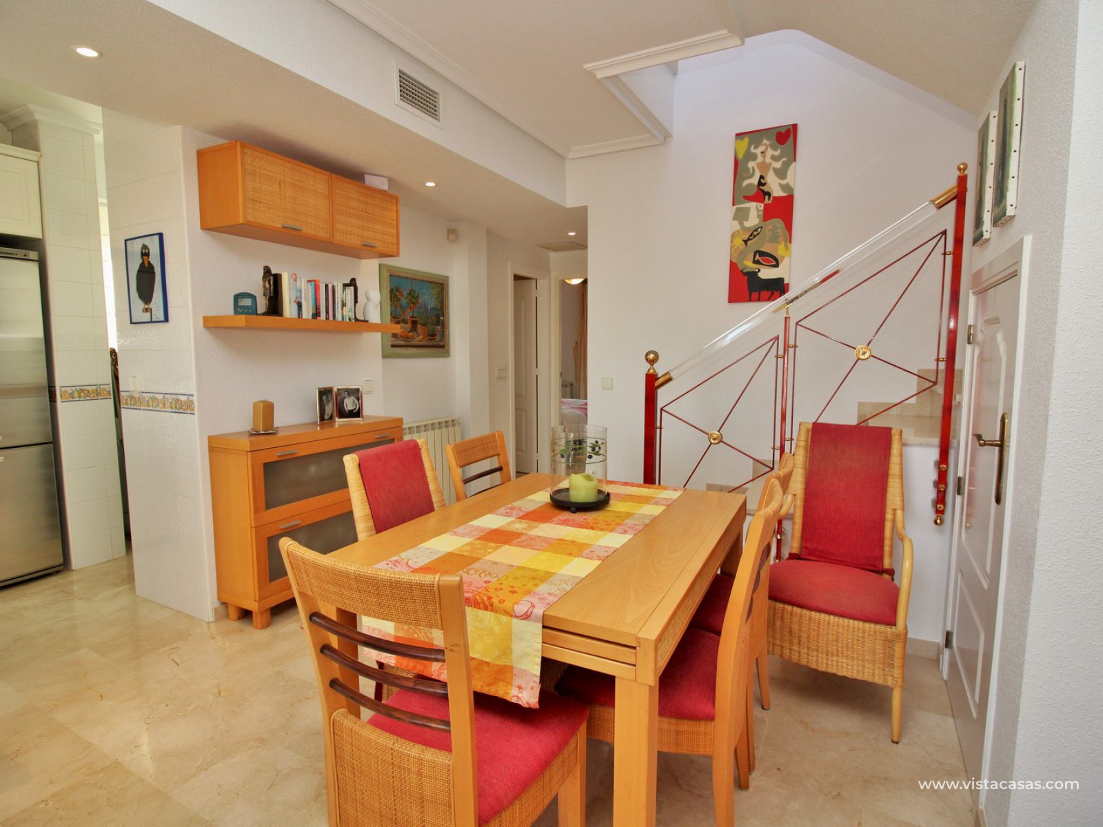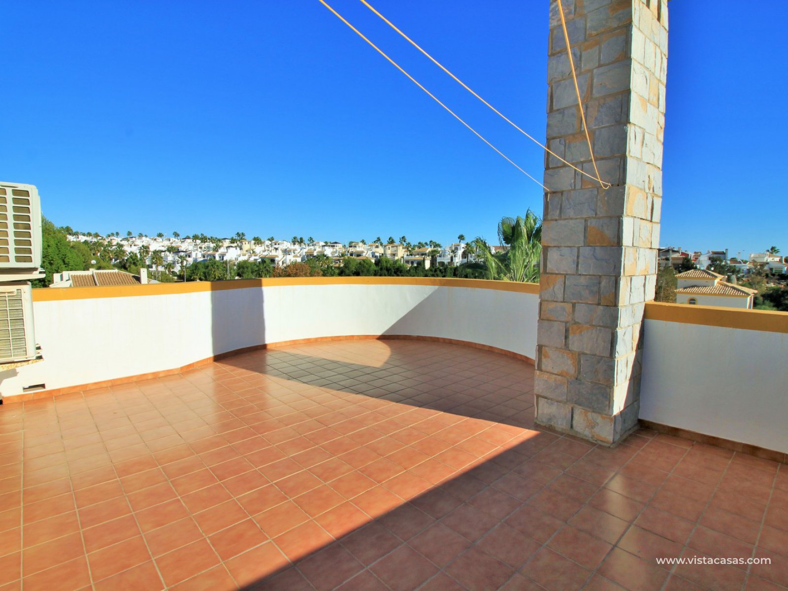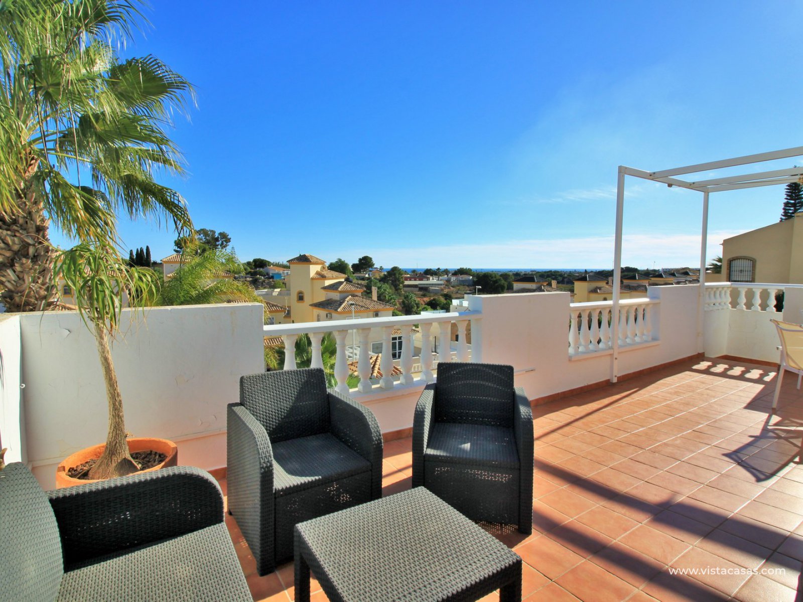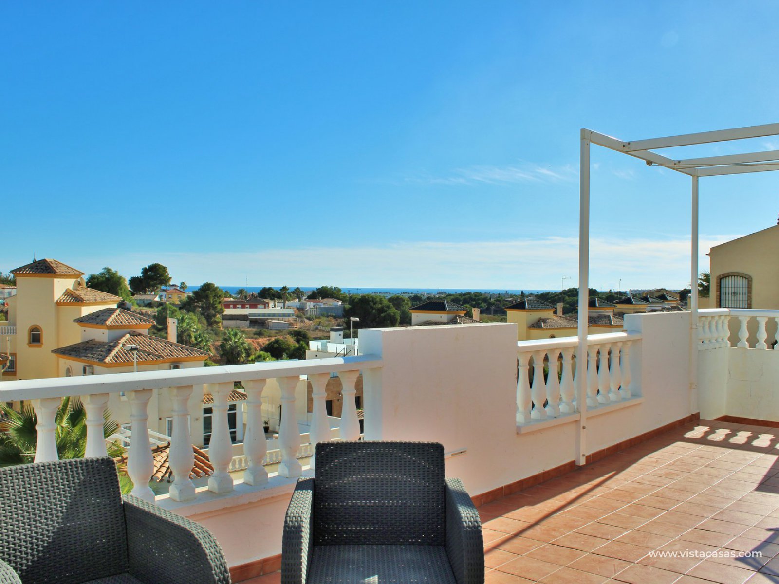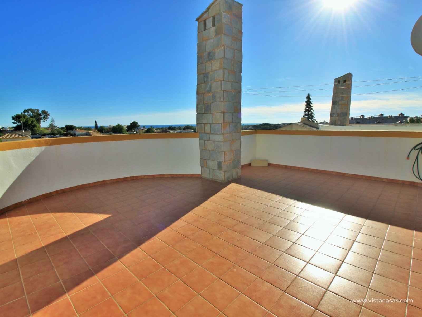 The living accommodation on the ground floor comprises of a bright and open lounge-dining area with fully equipped kitchen with utility area to the side, 2 double bedrooms with fitted wardrobes, and a family bathroom. From the lounge, French doors leads out to the raised terrace offering views of the sea. Upstairs is the good sized master bedroom with fitted wardrobes and en-suite bathroom with walk-in shower. There is a large roof solarium, offering great sea views accessible from the master bedroom and landing. The pool area offers plenty of space for sunbathing, plus a BBQ/dining area. There is also central heating throughout the property. R15 is a well kept community which also offers all homeowners use of a communal pool.