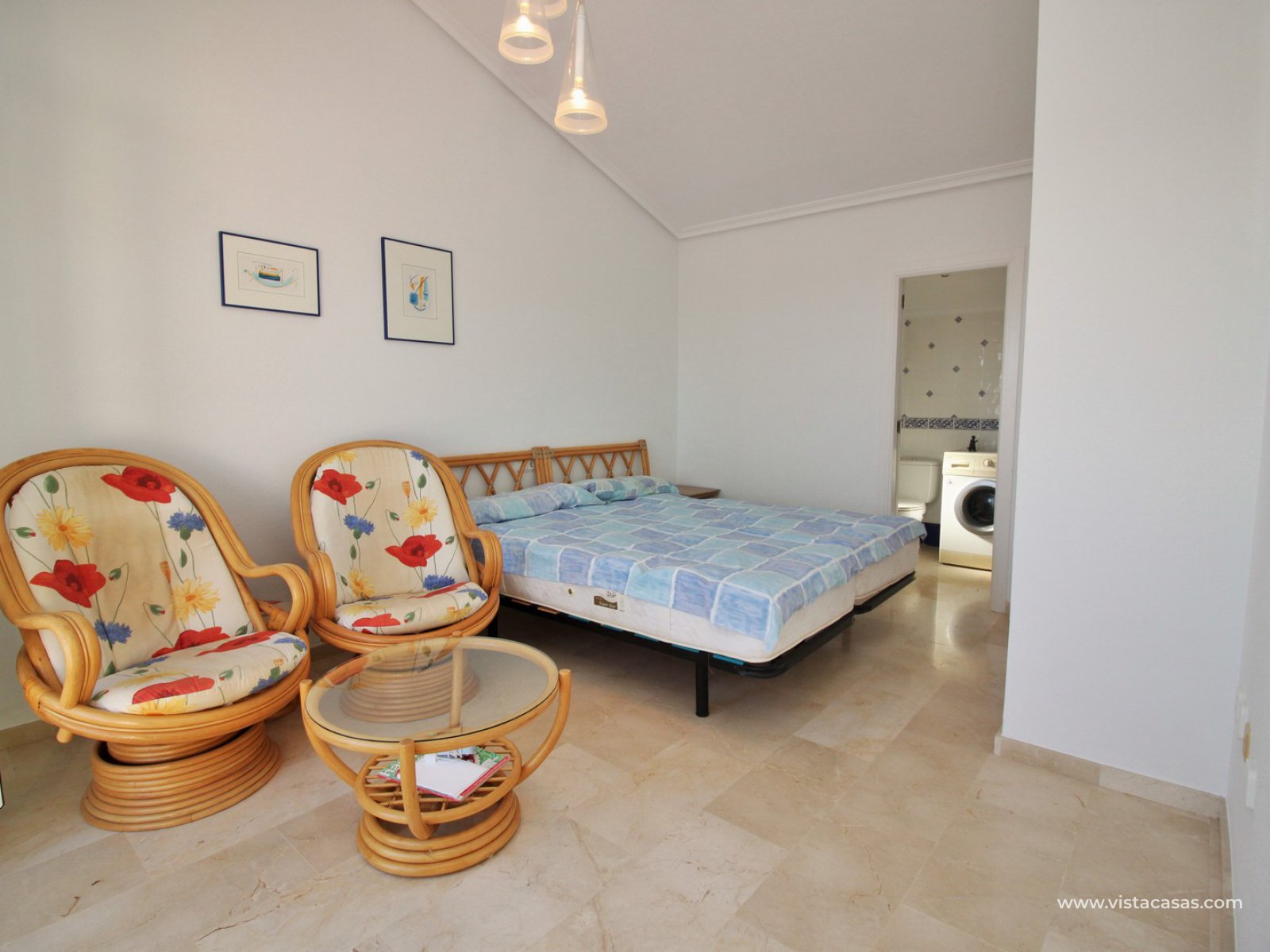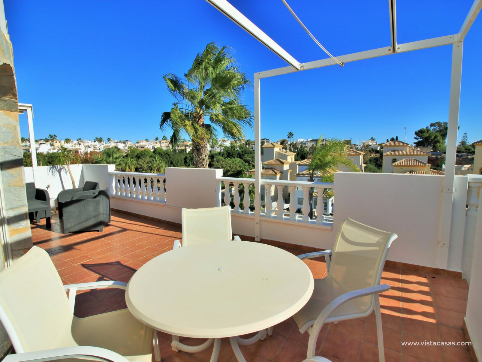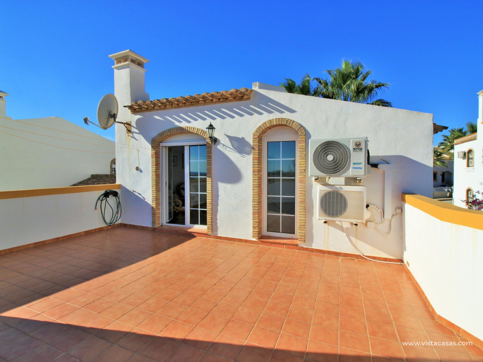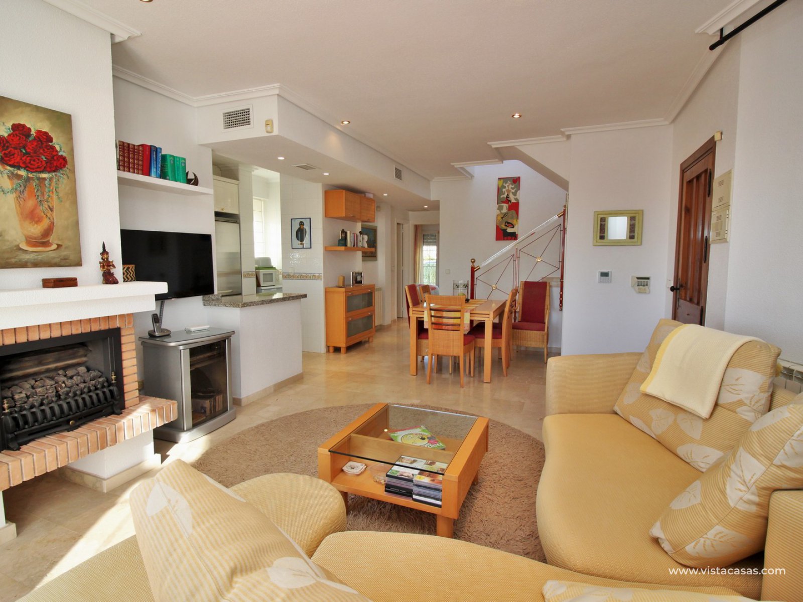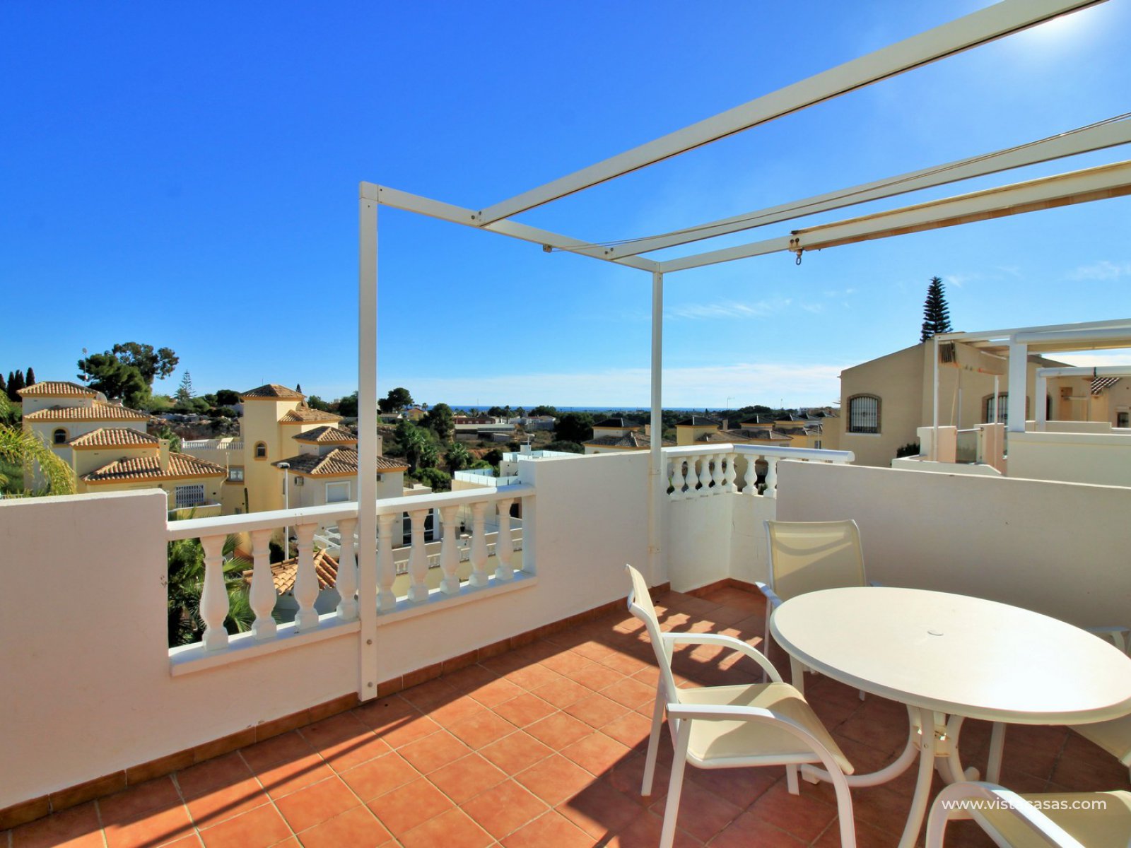 The living accommodation on the ground floor comprises of a bright and open lounge-dining area with fully equipped kitchen with utility area to the side, 2 double bedrooms with fitted wardrobes, and a family bathroom. From the lounge, French doors leads out to the raised terrace offering views of the sea. Upstairs is the good sized master bedroom with fitted wardrobes and en-suite bathroom with walk-in shower. There is a large roof solarium, offering great sea views accessible from the master bedroom and landing. The pool area offers plenty of space for sunbathing, plus a BBQ/dining area. There is also central heating throughout the property. R15 is a well kept community which also offers all homeowners use of a communal pool.