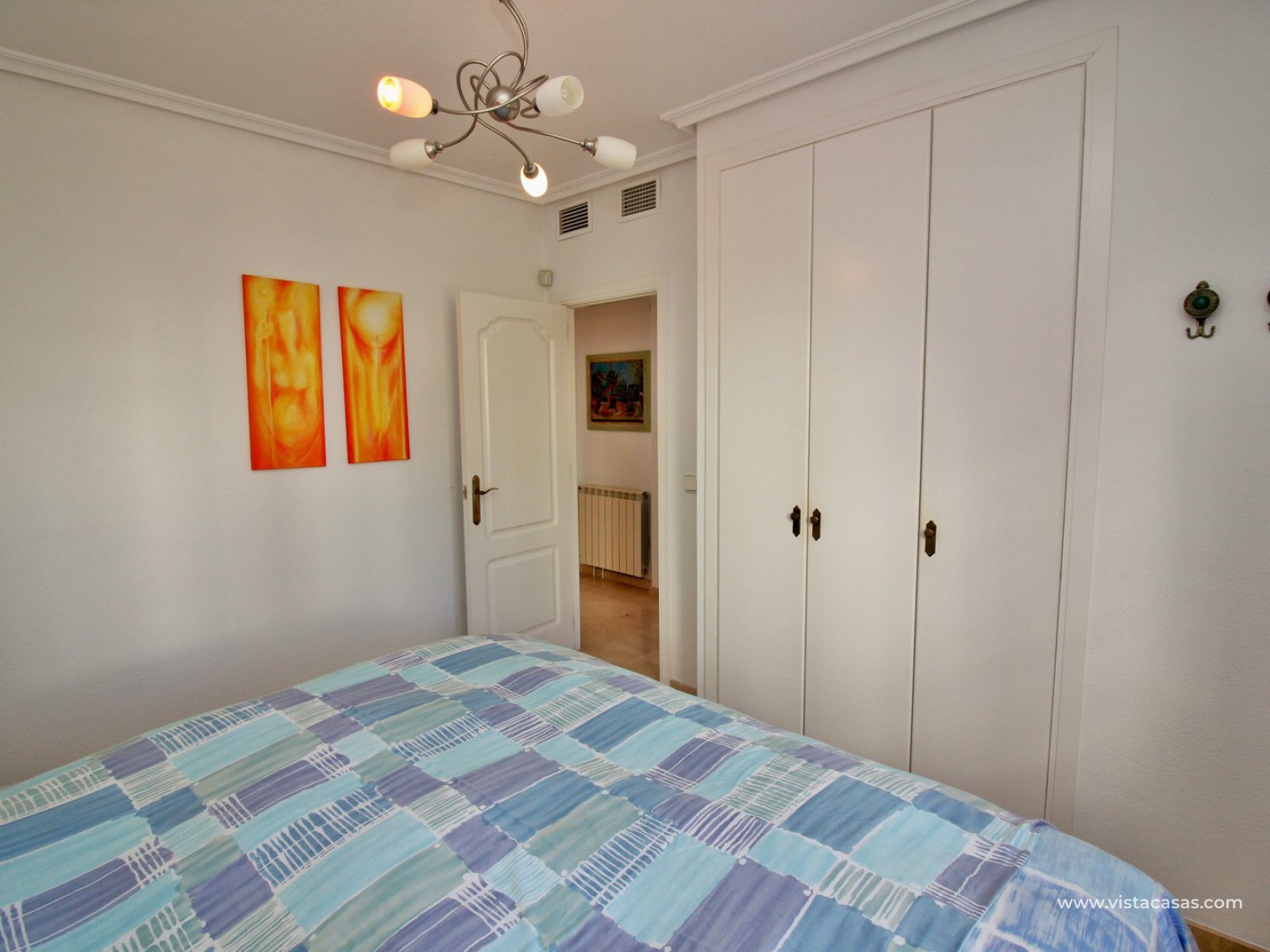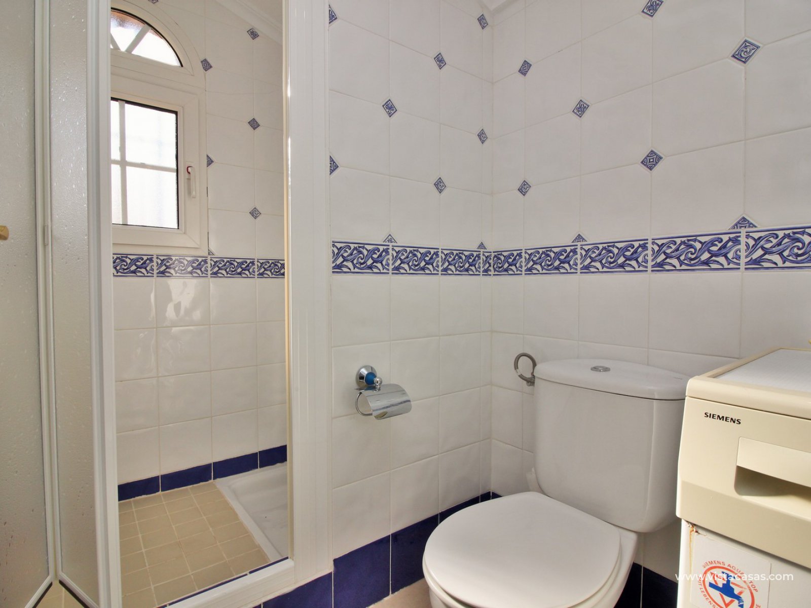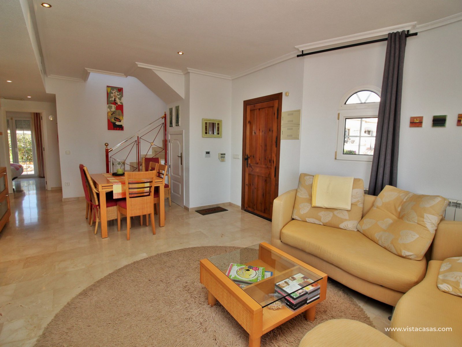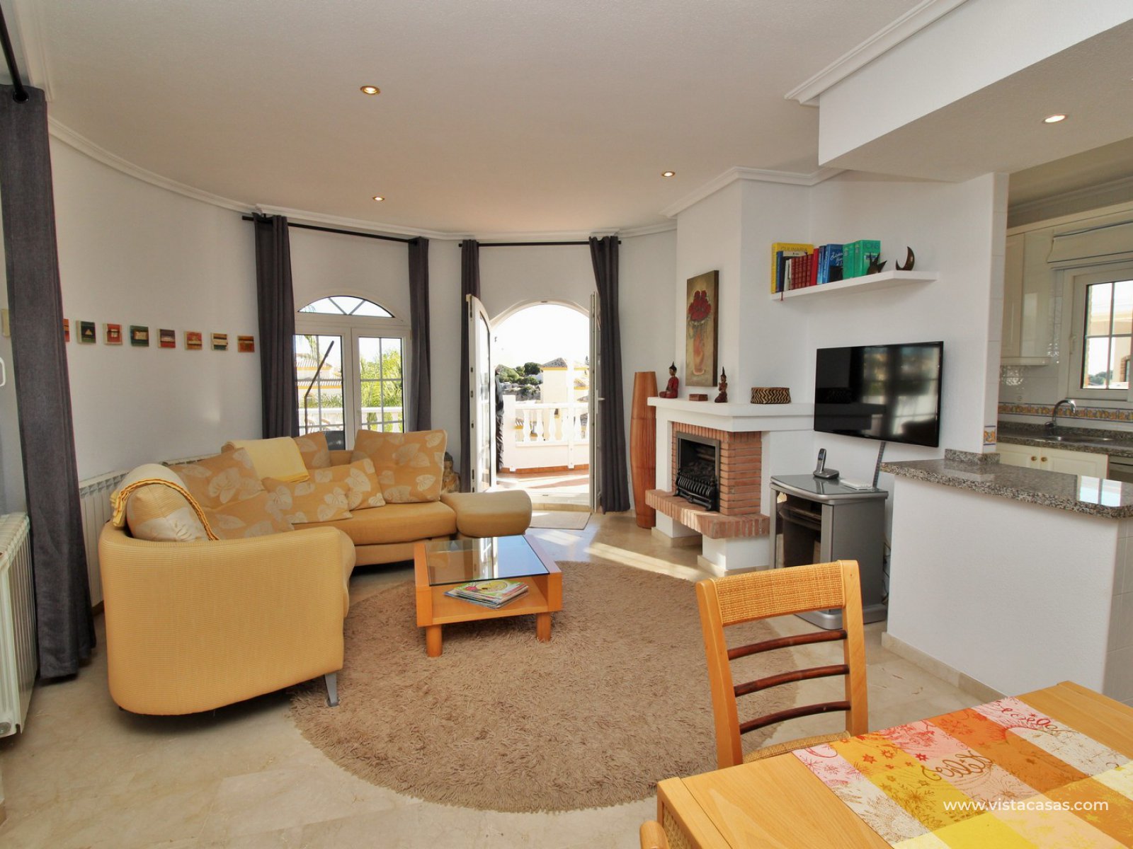 The living accommodation on the ground floor comprises of a bright and open lounge-dining area with fully equipped kitchen with utility area to the side, 2 double bedrooms with fitted wardrobes, and a family bathroom. From the lounge, French doors leads out to the raised terrace offering views of the sea. Upstairs is the good sized master bedroom with fitted wardrobes and en-suite bathroom with walk-in shower. There is a large roof solarium, offering great sea views accessible from the master bedroom and landing. The pool area offers plenty of space for sunbathing, plus a BBQ/dining area. There is also central heating throughout the property. R15 is a well kept community which also offers all homeowners use of a communal pool.