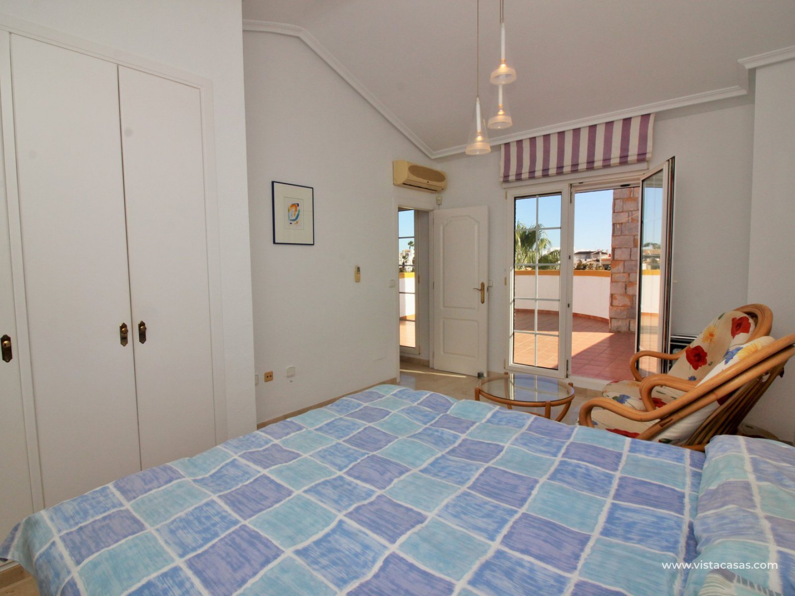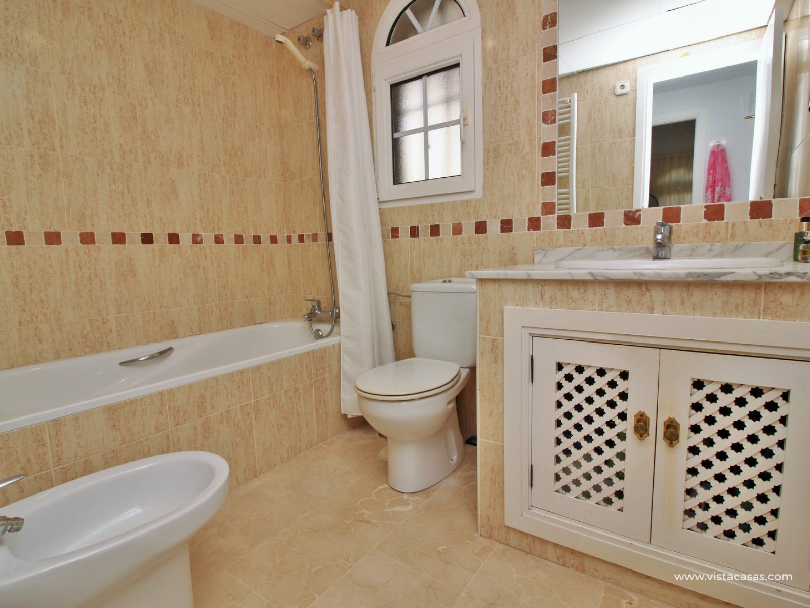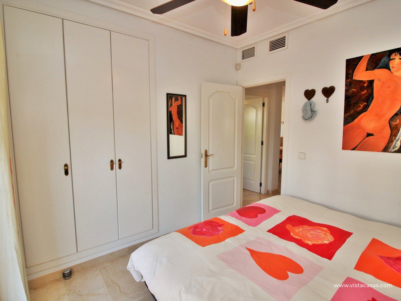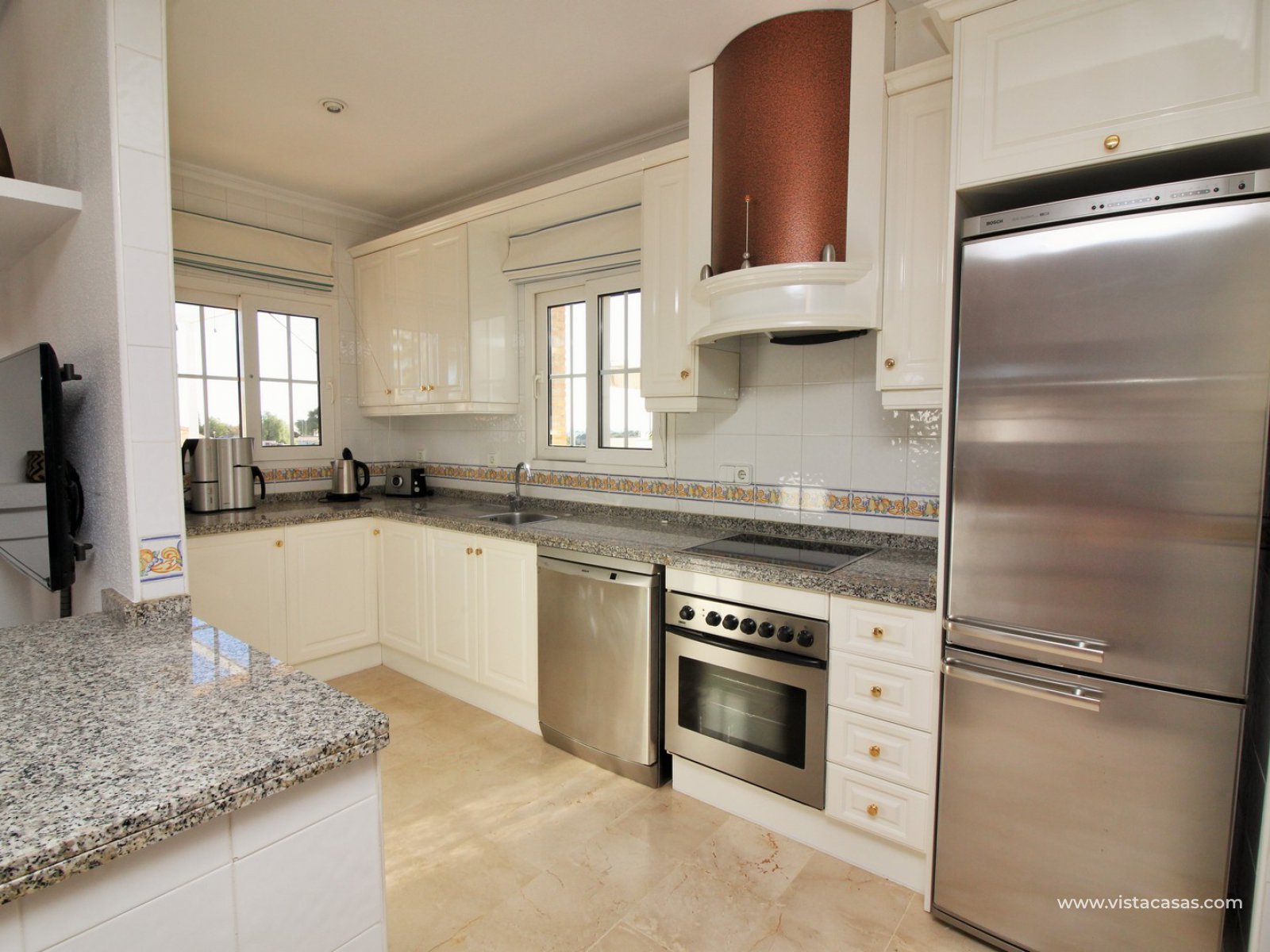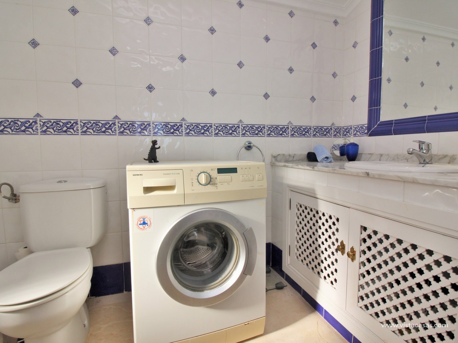 The living accommodation on the ground floor comprises of a bright and open lounge-dining area with fully equipped kitchen with utility area to the side, 2 double bedrooms with fitted wardrobes, and a family bathroom. From the lounge, French doors leads out to the raised terrace offering views of the sea. Upstairs is the good sized master bedroom with fitted wardrobes and en-suite bathroom with walk-in shower. There is a large roof solarium, offering great sea views accessible from the master bedroom and landing. The pool area offers plenty of space for sunbathing, plus a BBQ/dining area. There is also central heating throughout the property. R15 is a well kept community which also offers all homeowners use of a communal pool.
