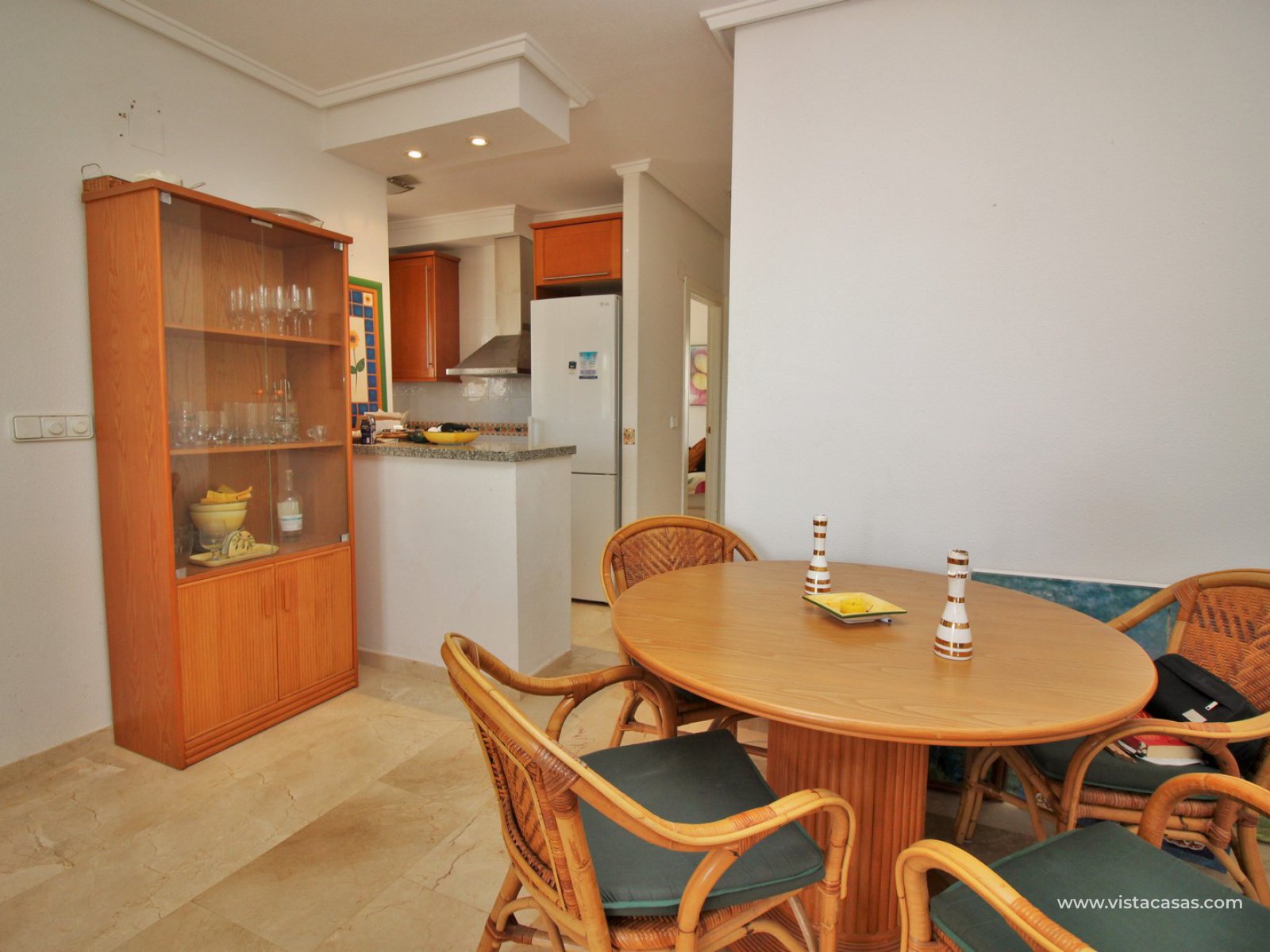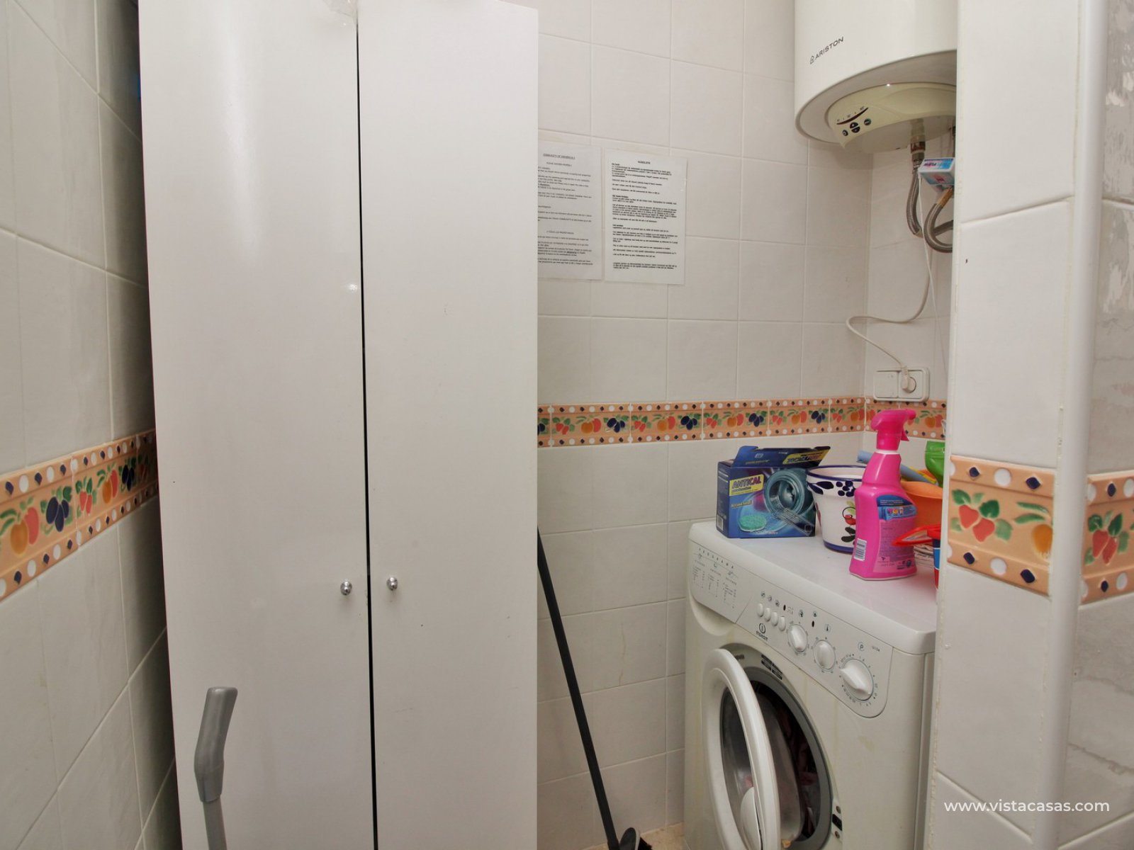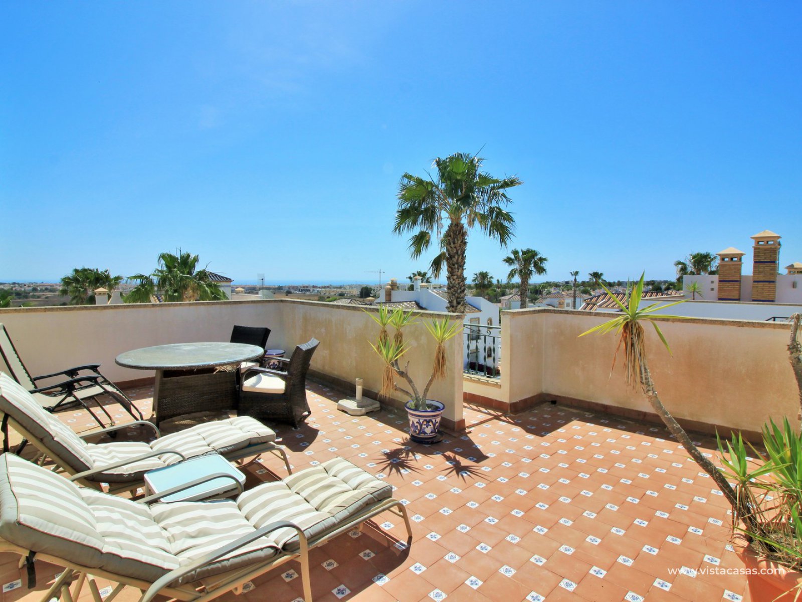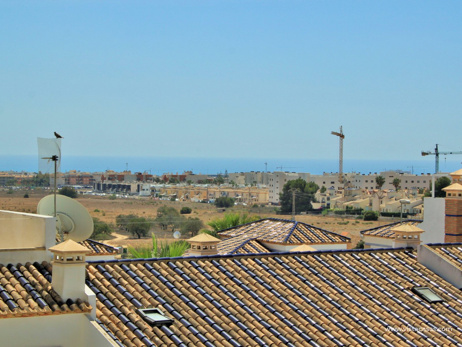 LOCATION, LOCATION! 2 bedroom, 2 bathroom top floor apartment in the highly sought-after area of R3, Las Violetas in Villamartin. The apartment is sold fully equipped with furniture and offers amazing sea views, and great outdoor space including a private garden, covered balcony, and large roof solarium with brick built BBQ and storage cupboard.