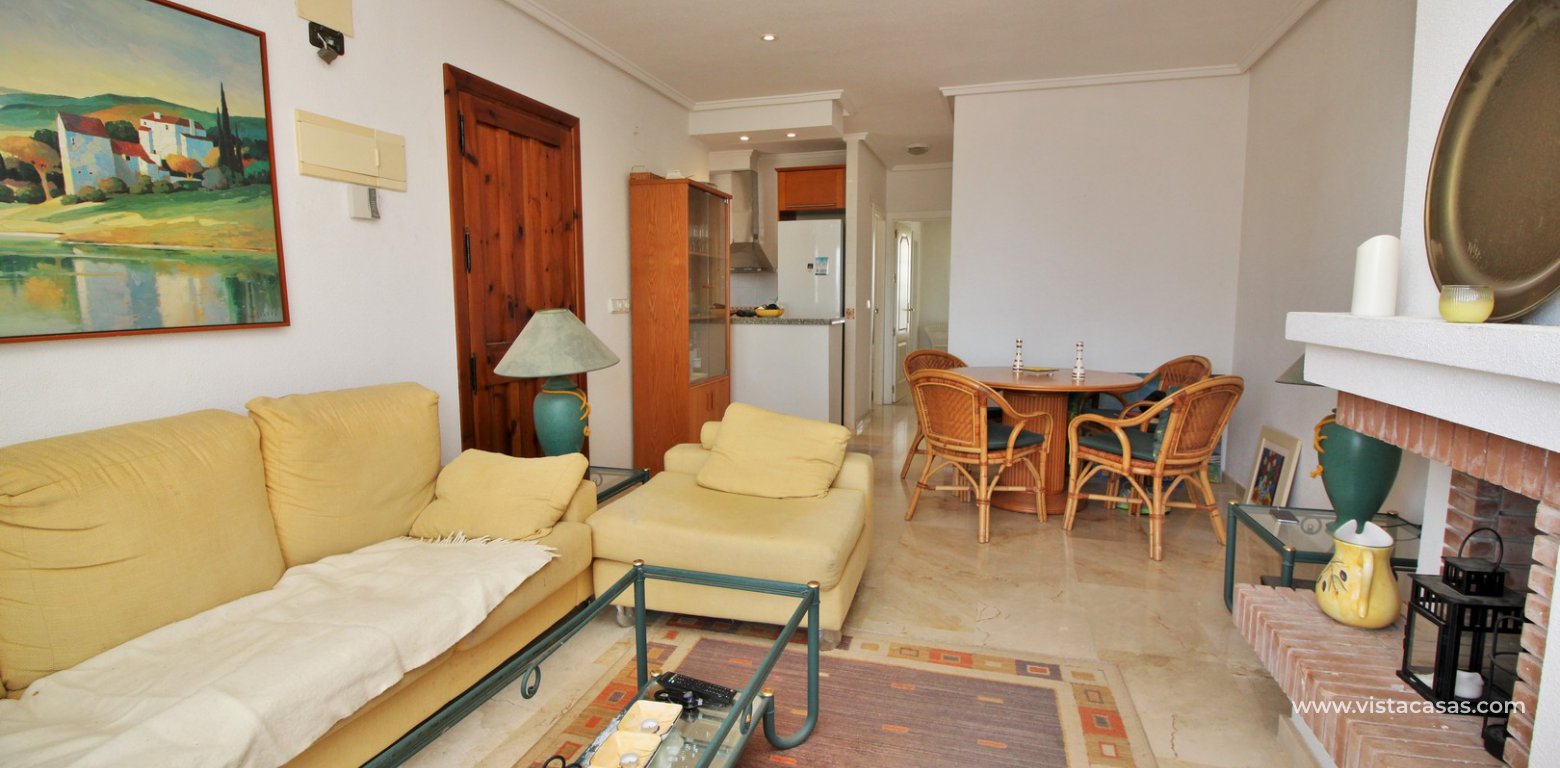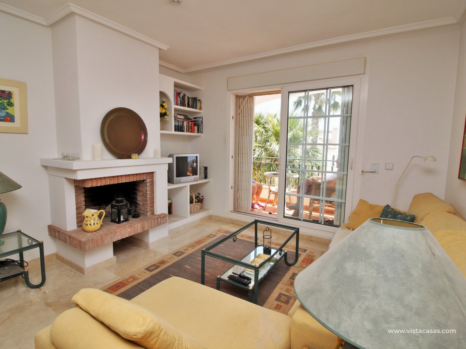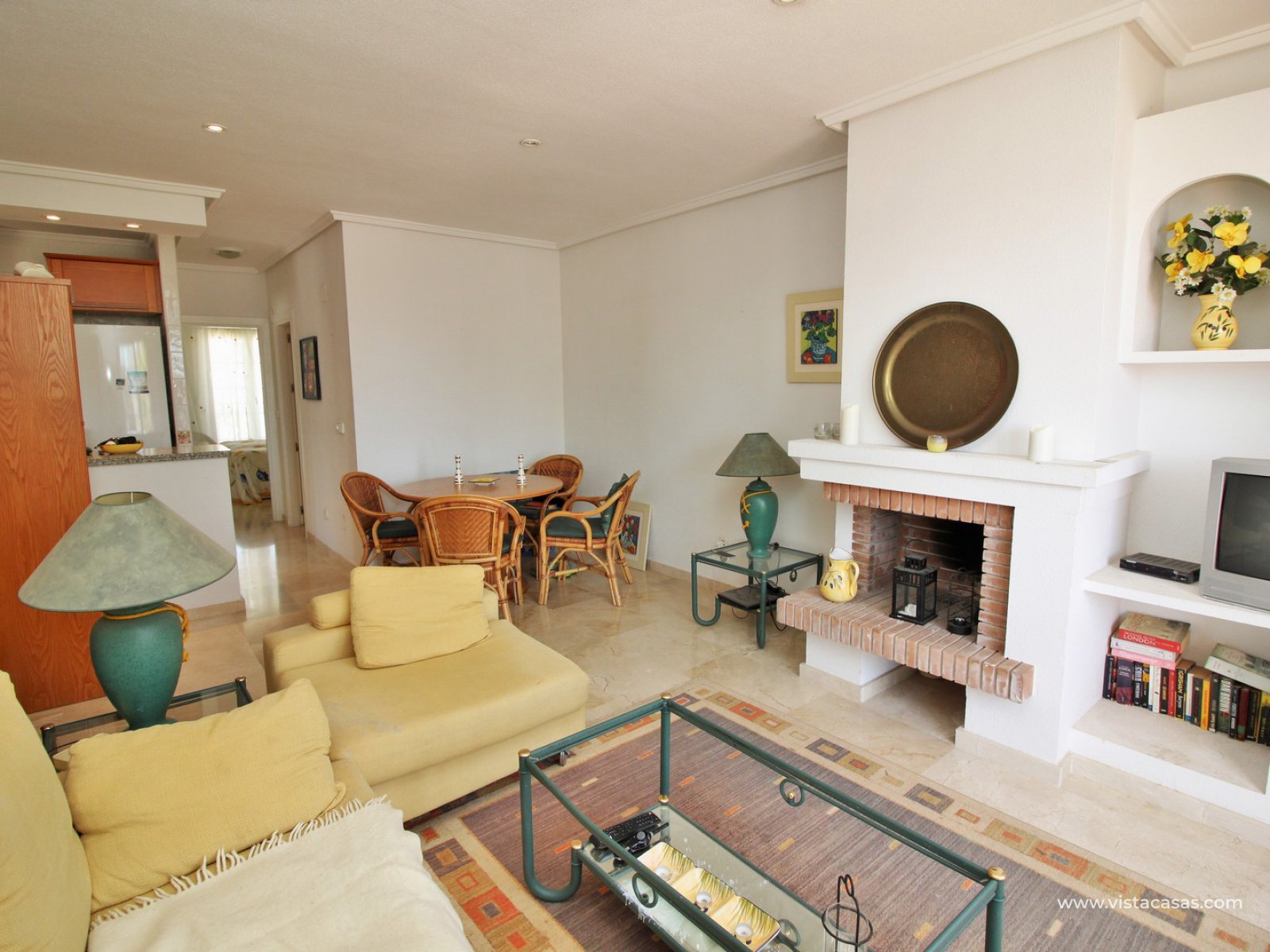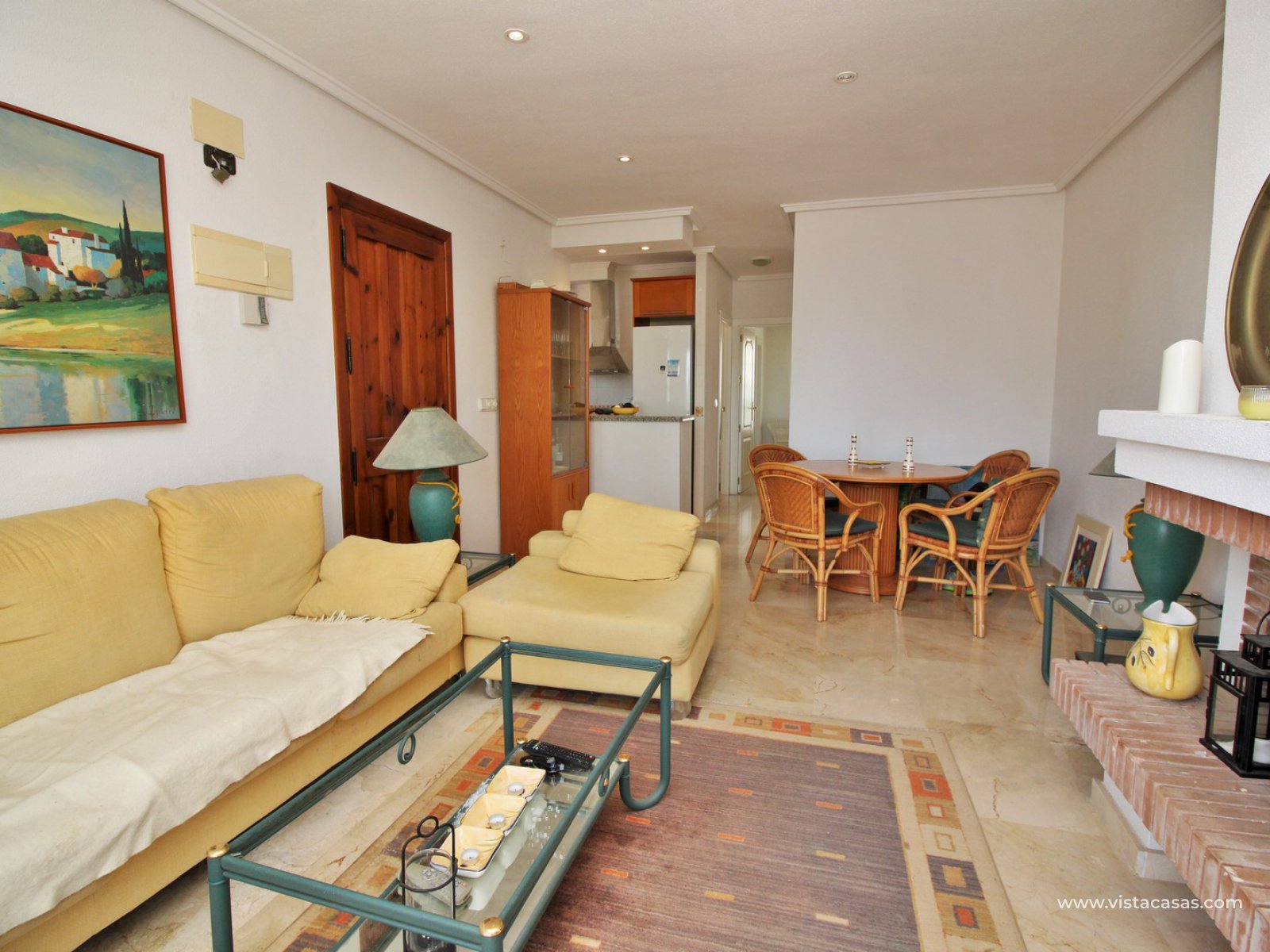 The living accommodation comprises of a lounge-dining area with fireplace, a fully fitted kitchen complete with white goods and a utility area, 2 bedrooms with fitted wardrobes and a family bathroom. The master bedroom offers an en-suite bathroom with walk-in shower plus a Juliet balcony. Patio doors from the lounge leads onto the covered balcony, a perfect place to enjoy a meal or morning coffee with views of the pool. External stairs from the balcony leads to the roof solarium which offers great sea views. The apartment has beautiful marble flooring throughout. Part of a community with the use of a beautiful pool with green areas, and off-road communal parking.