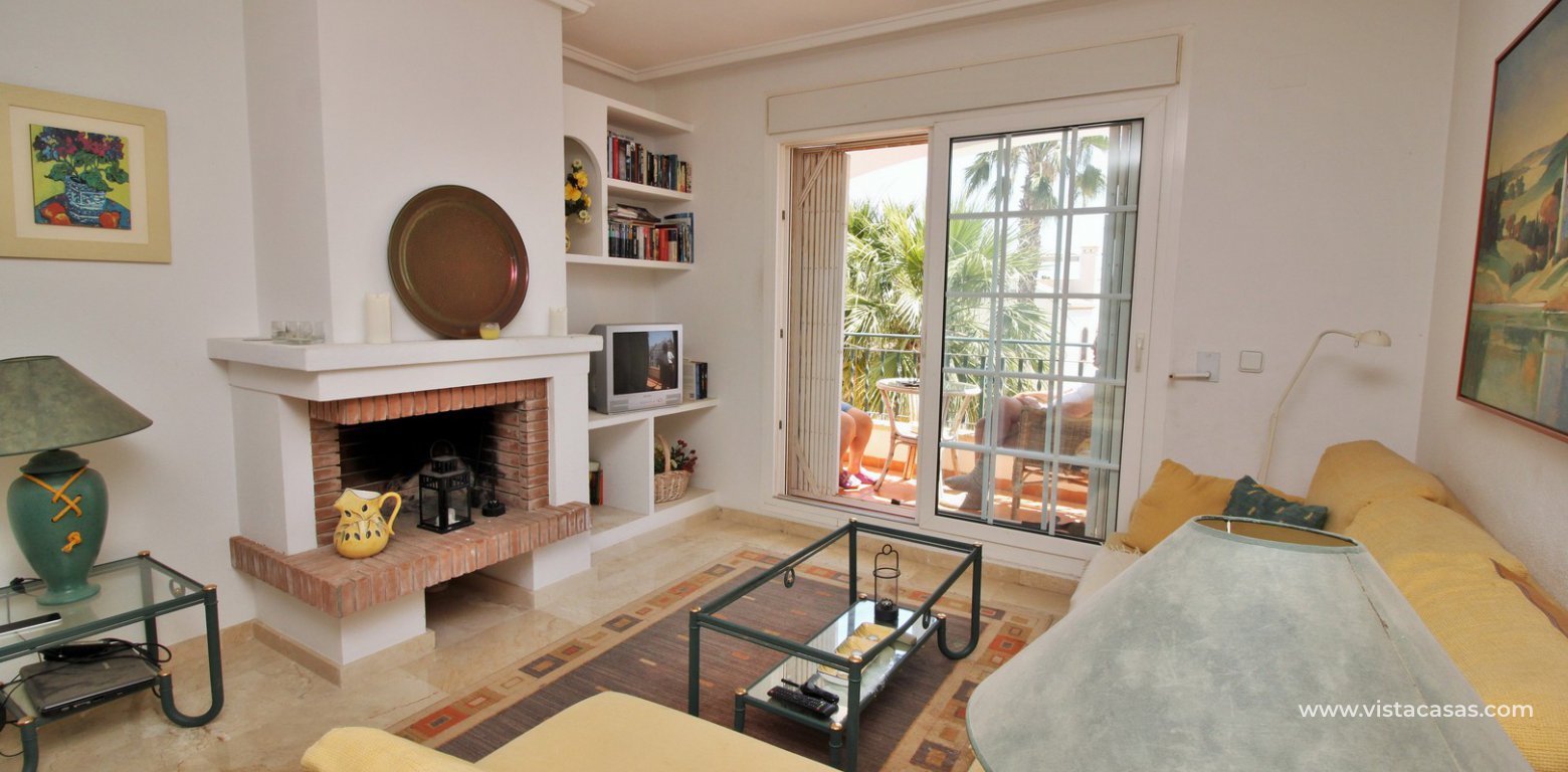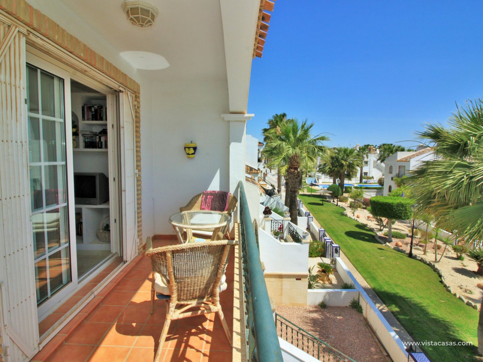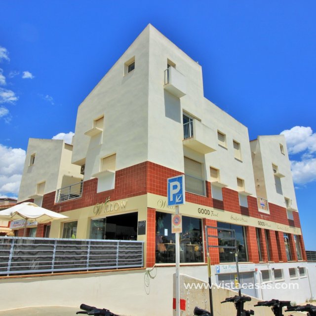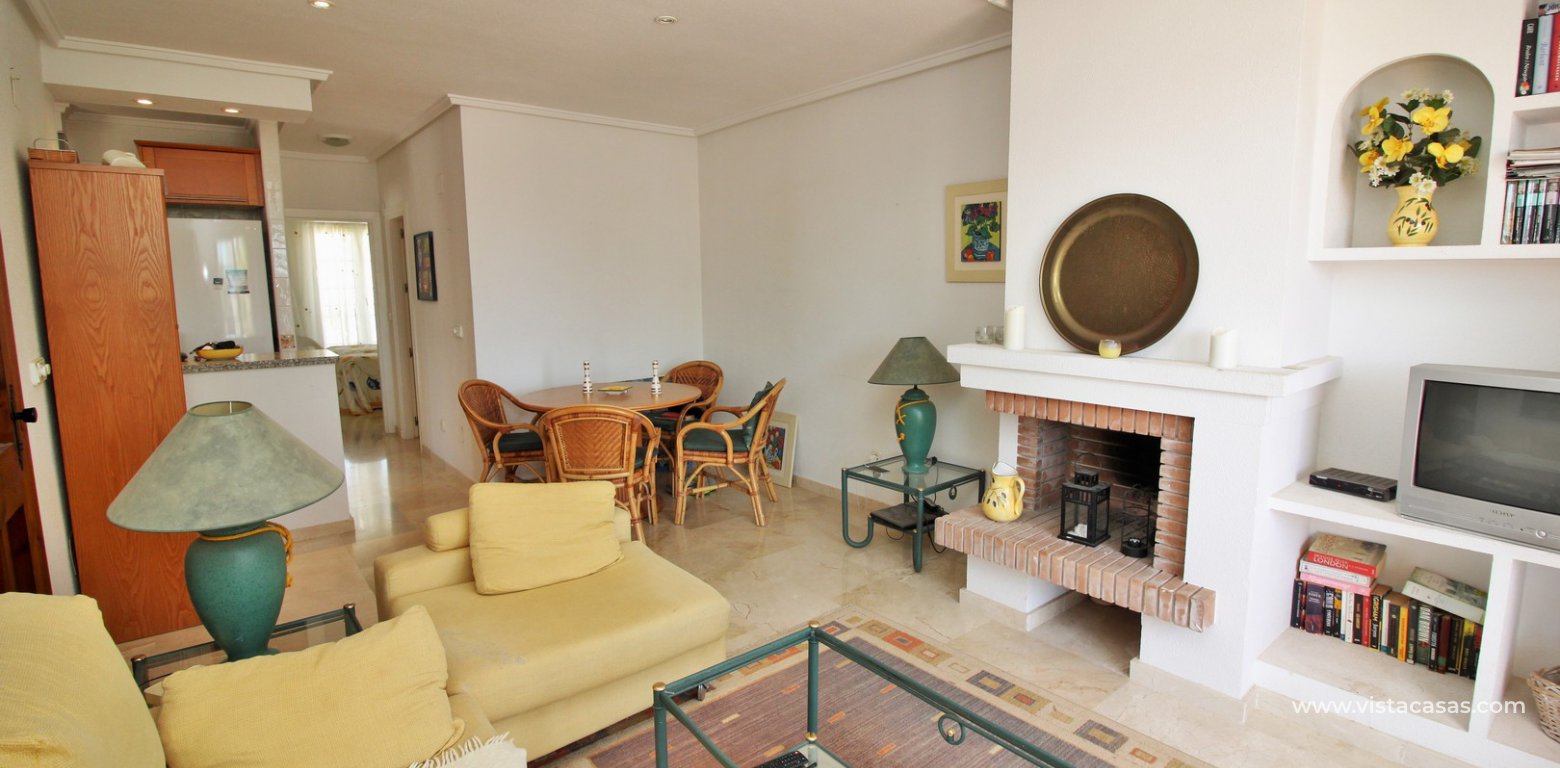 The living accommodation comprises of a lounge-dining area with fireplace, a fully fitted kitchen complete with white goods and a utility area, 2 bedrooms with fitted wardrobes and a family bathroom. The master bedroom offers an en-suite bathroom with walk-in shower plus a Juliet balcony. Patio doors from the lounge leads onto the covered balcony, a perfect place to enjoy a meal or morning coffee with views of the pool. External stairs from the balcony leads to the roof solarium which offers great sea views. The apartment has beautiful marble flooring throughout. Part of a community with the use of a beautiful pool with green areas, and off-road communal parking.