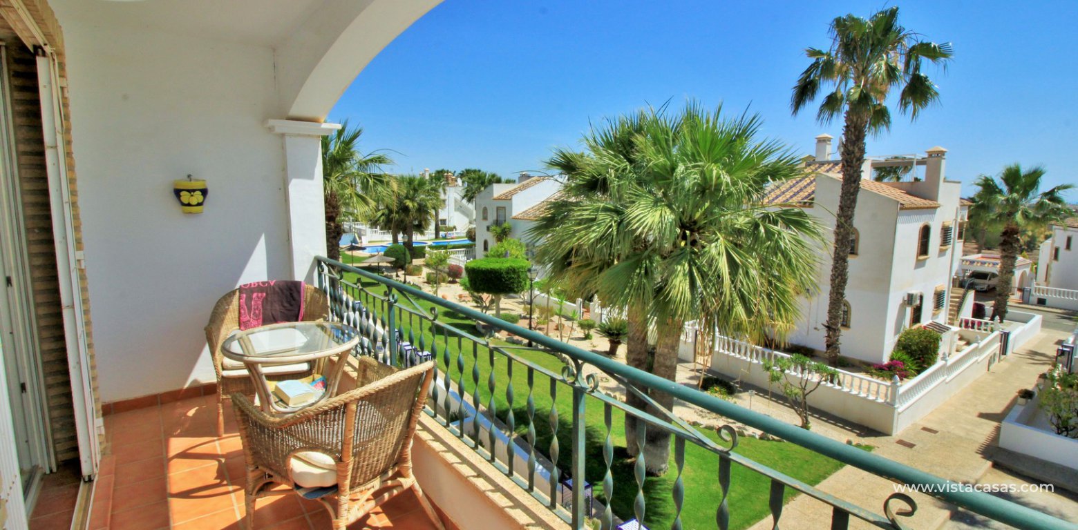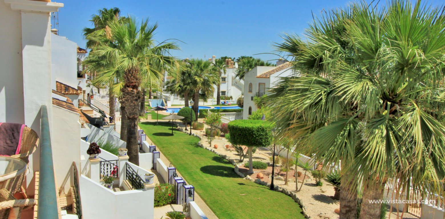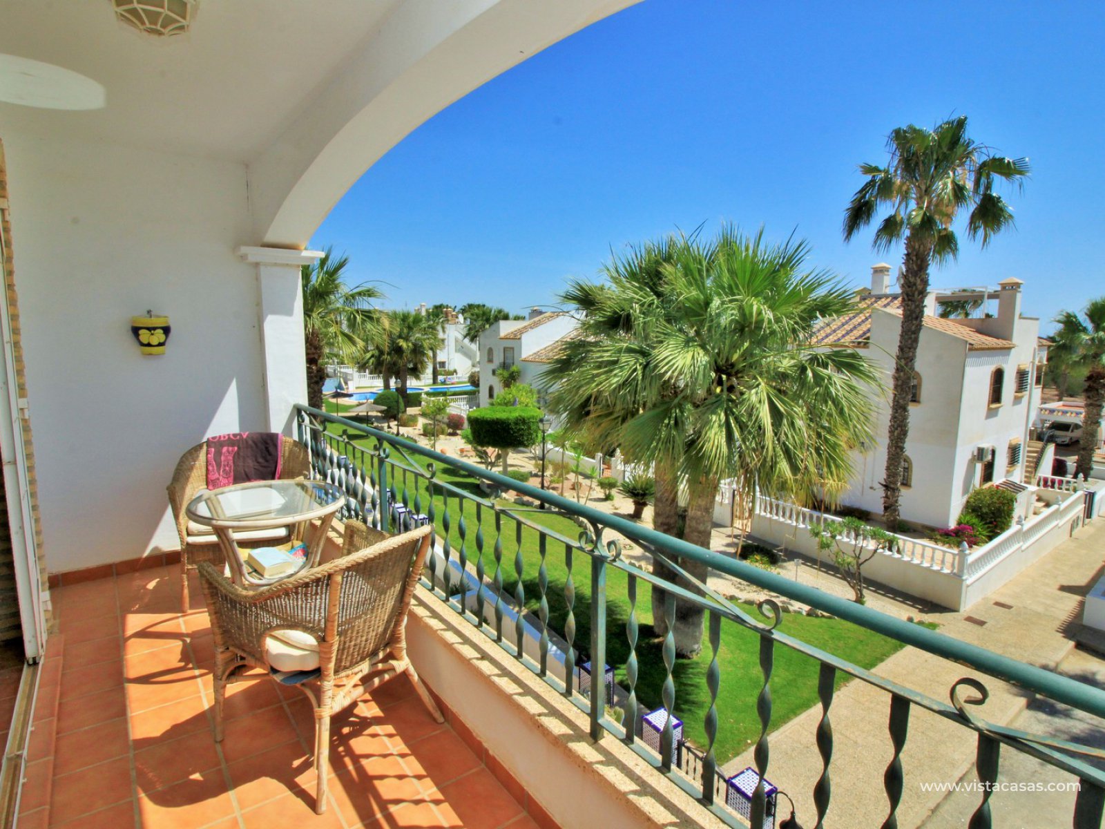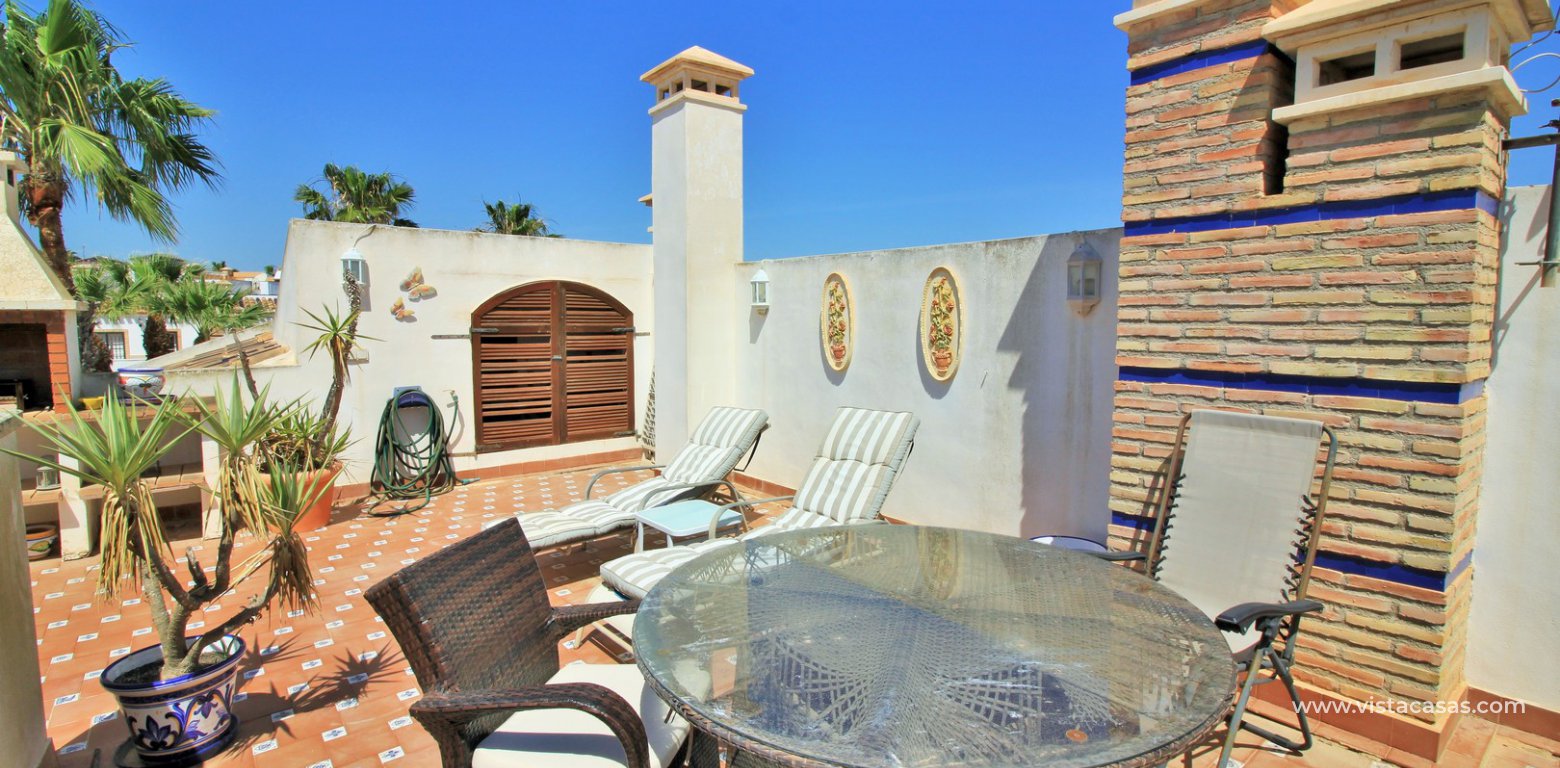 The living accommodation comprises of a lounge-dining area with fireplace, a fully fitted kitchen complete with white goods and a utility area, 2 bedrooms with fitted wardrobes and a family bathroom. The master bedroom offers an en-suite bathroom with walk-in shower plus a Juliet balcony. Patio doors from the lounge leads onto the covered balcony, a perfect place to enjoy a meal or morning coffee with views of the pool. External stairs from the balcony leads to the roof solarium which offers great sea views. The apartment has beautiful marble flooring throughout. Part of a community with the use of a beautiful pool with green areas, and off-road communal parking.
