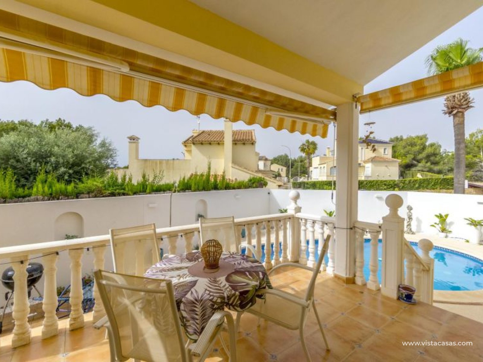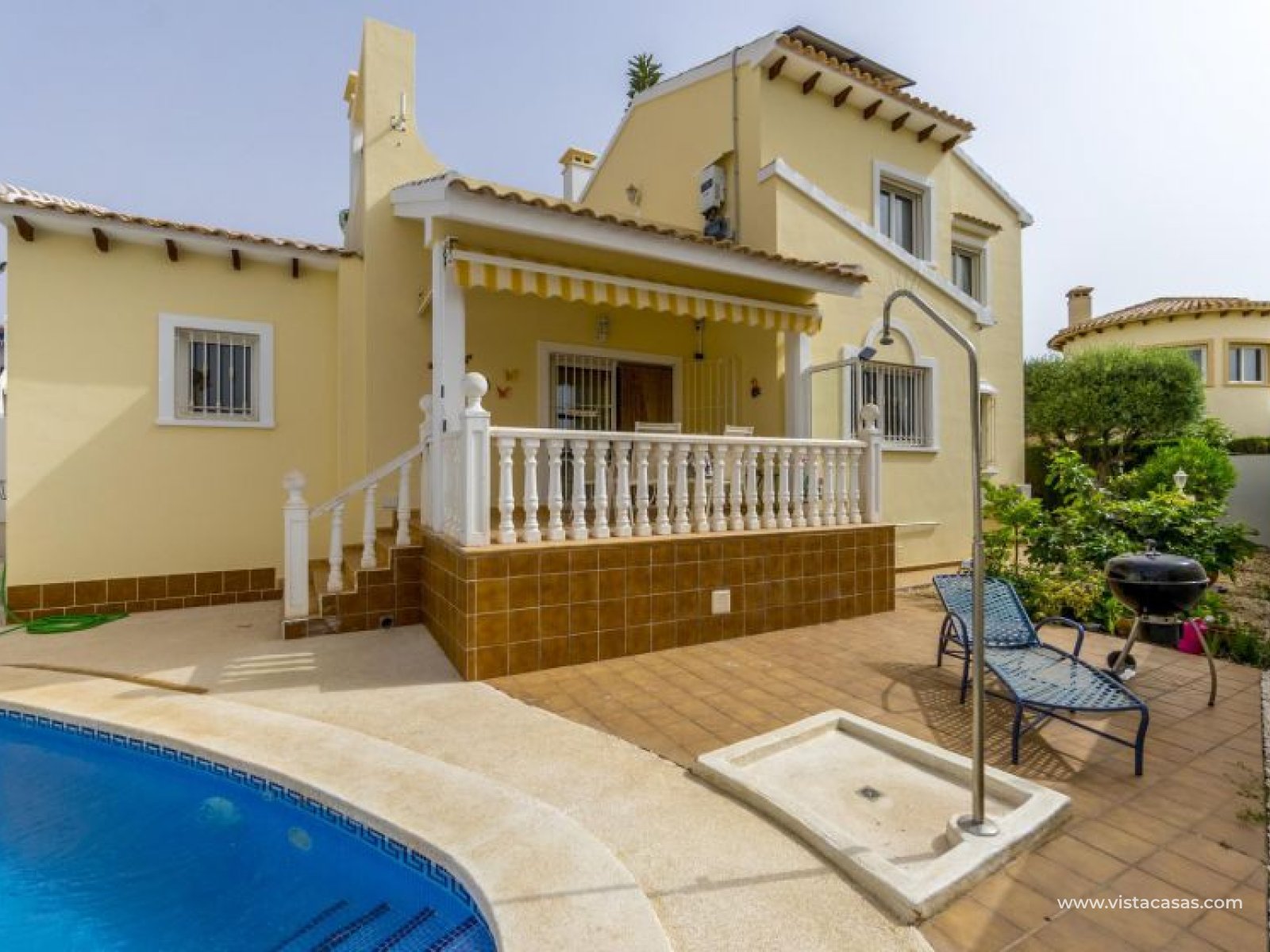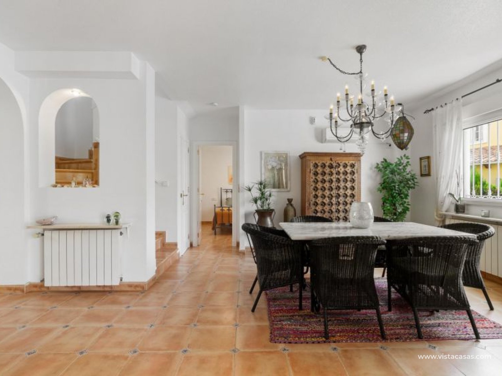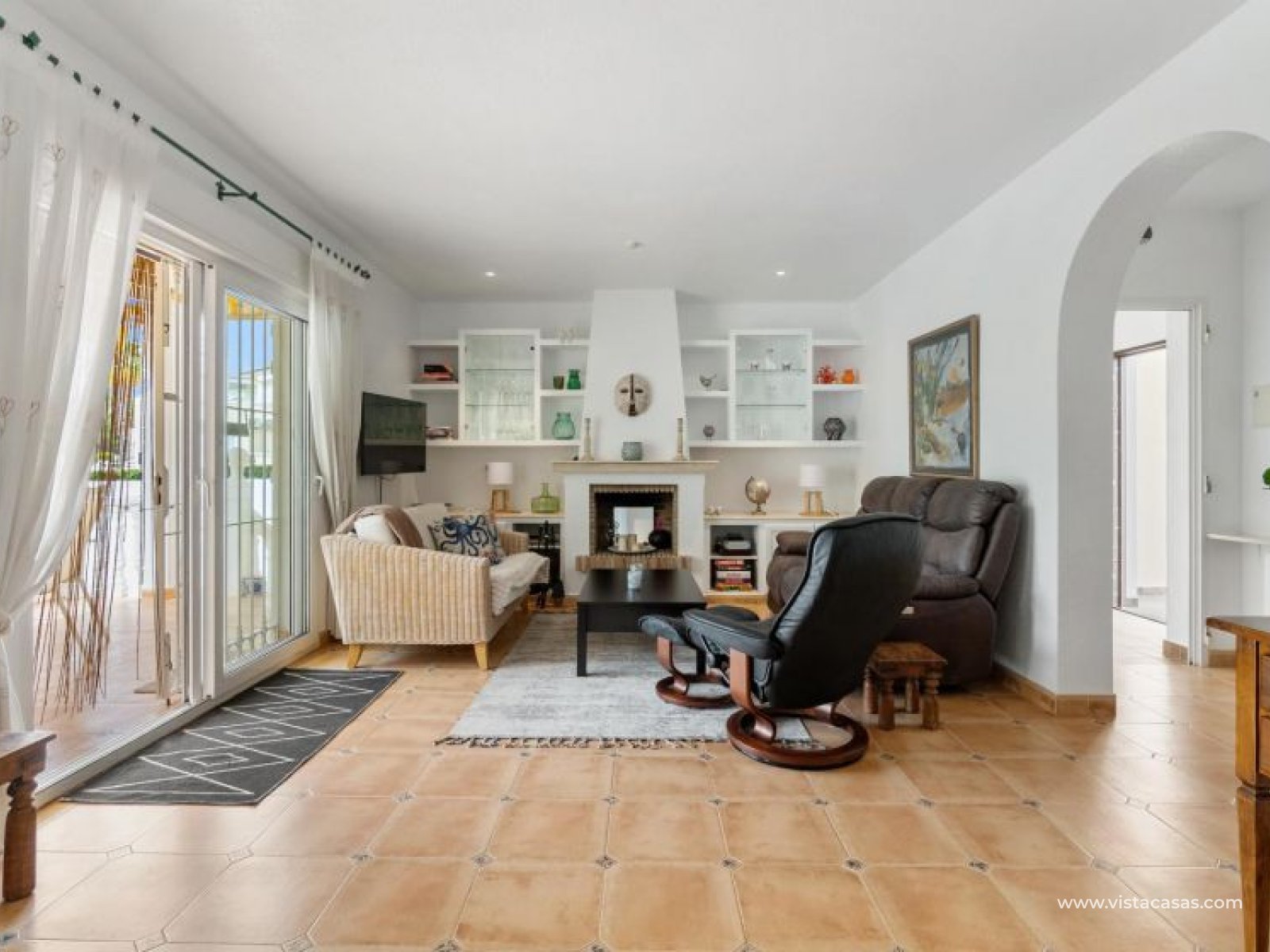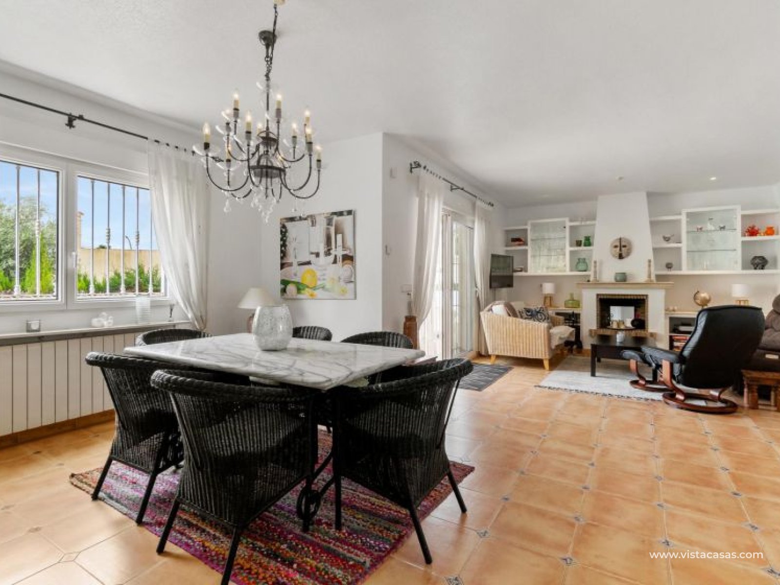 Beautiful mediterranean style detached villa for sale in Los Dolses-Orihuela Costa Discover this charming two storey Mediterranean style detached villa, a luxury retreat with modern facilities, located in the prestigious area of Los Dolses, Orihuela Costa. Designed to offer maximum comfort and elegance. On the ground floor we find a spacious and bright living-dining room with fireplace, creating a warm and cosy atmosphere, with direct exit to a covered terrace and the stunning private swimming pool, ideal to enjoy relaxing moments outdoors. At this floor we also find a large independent kitchen fully equipped with modern appliances, 2 comfortable bedrooms, each with en suite bathroom, plus 1 additional toilet and a small storage room for added functionality. The first floor consists of 2 additional bedrooms offering a versatile and cosy space for family or guests, 1 full bathroom and a terrace perfect for enjoying the Mediterranean sun or its unobstructed views. All rooms are air-conditioned, guaranteeing comfort at any time of the year. This property is in impeccable condition, ready to move into, sold furnished and fully equipped! The beautiful garden of this spectacular villa has a driveway and seating areas. The private pool and terrace are the ideal place to enjoy the sun all year round. There is also a storage room in the garden, perfect for you beach chairs, golf bags or bicycles etc. The property offers multiple orientations, filling the spaces with abundant natural light. Its location is privileged, close to a wide range of shops, restaurants and services and within walking distance of the famous La Zenia Boulevard shopping centre, known for its wide variety of fashionable shops, restaurants and leisure areas. For golf lovers, there are three 18-hole golf courses within 2 km. The AP-7 motorway is only 1 km away, offering excellent connections to the region. This spectacular villa combines the charm of Mediterranean style with the comfort of modern facilities, offering a luxurious and relaxed lifestyle in an unbeatable location. Contact us today to arrange a viewing/videoviewing and discover your new home or holiday home in Orihuela Costa!