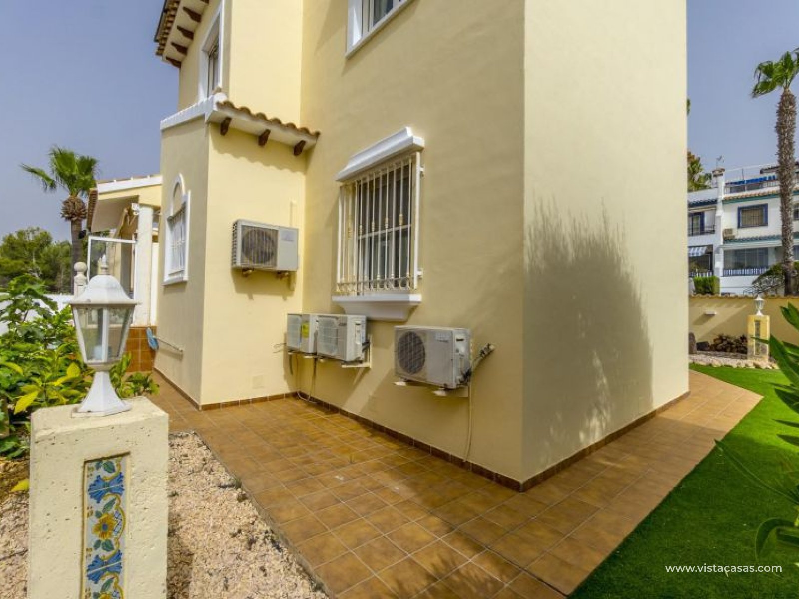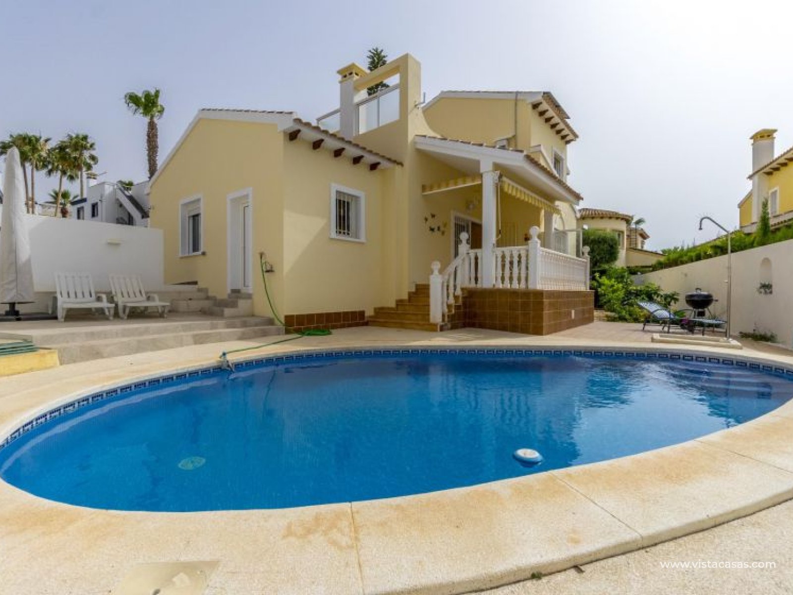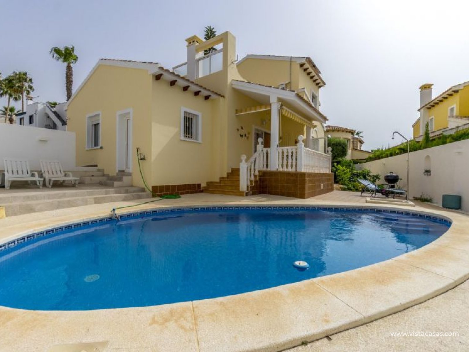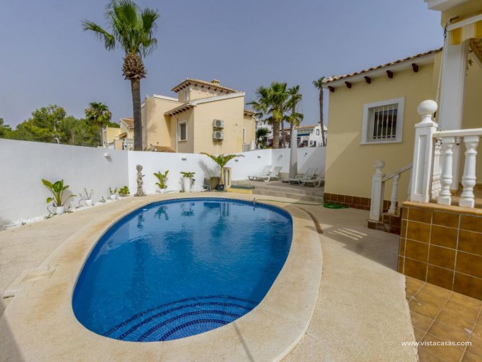 Beautiful mediterranean style detached villa for sale in Los Dolses-Orihuela Costa Discover this charming two storey Mediterranean style detached villa, a luxury retreat with modern facilities, located in the prestigious area of Los Dolses, Orihuela Costa. Designed to offer maximum comfort and elegance. On the ground floor we find a spacious and bright living-dining room with fireplace, creating a warm and cosy atmosphere, with direct exit to a covered terrace and the stunning private swimming pool, ideal to enjoy relaxing moments outdoors. At this floor we also find a large independent kitchen fully equipped with modern appliances, 2 comfortable bedrooms, each with en suite bathroom, plus 1 additional toilet and a small storage room for added functionality. The first floor consists of 2 additional bedrooms offering a versatile and cosy space for family or guests, 1 full bathroom and a terrace perfect for enjoying the Mediterranean sun or its unobstructed views. All rooms are air-conditioned, guaranteeing comfort at any time of the year. This property is in impeccable condition, ready to move into, sold furnished and fully equipped! The beautiful garden of this spectacular villa has a driveway and seating areas. The private pool and terrace are the ideal place to enjoy the sun all year round. There is also a storage room in the garden, perfect for you beach chairs, golf bags or bicycles etc. The property offers multiple orientations, filling the spaces with abundant natural light. Its location is privileged, close to a wide range of shops, restaurants and services and within walking distance of the famous La Zenia Boulevard shopping centre, known for its wide variety of fashionable shops, restaurants and leisure areas. For golf lovers, there are three 18-hole golf courses within 2 km. The AP-7 motorway is only 1 km away, offering excellent connections to the region. This spectacular villa combines the charm of Mediterranean style with the comfort of modern facilities, offering a luxurious and relaxed lifestyle in an unbeatable location. Contact us today to arrange a viewing/videoviewing and discover your new home or holiday home in Orihuela Costa!