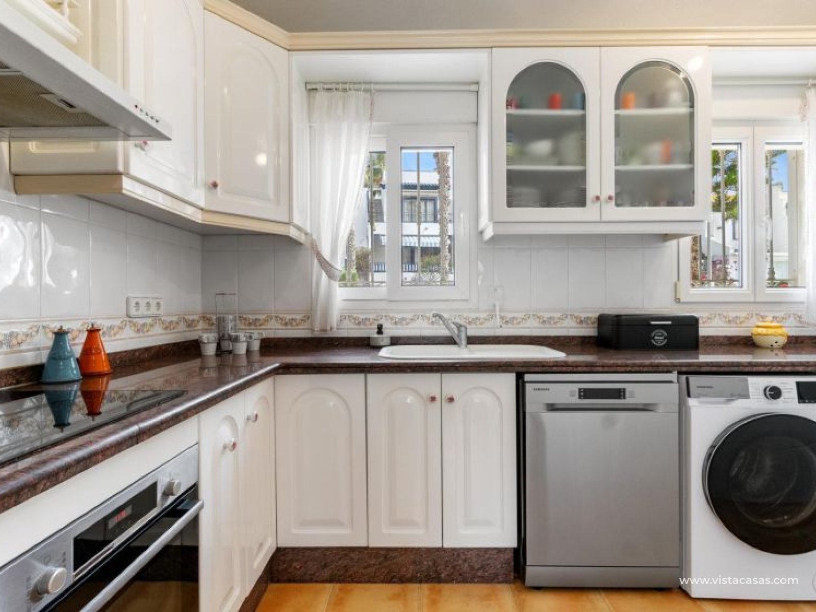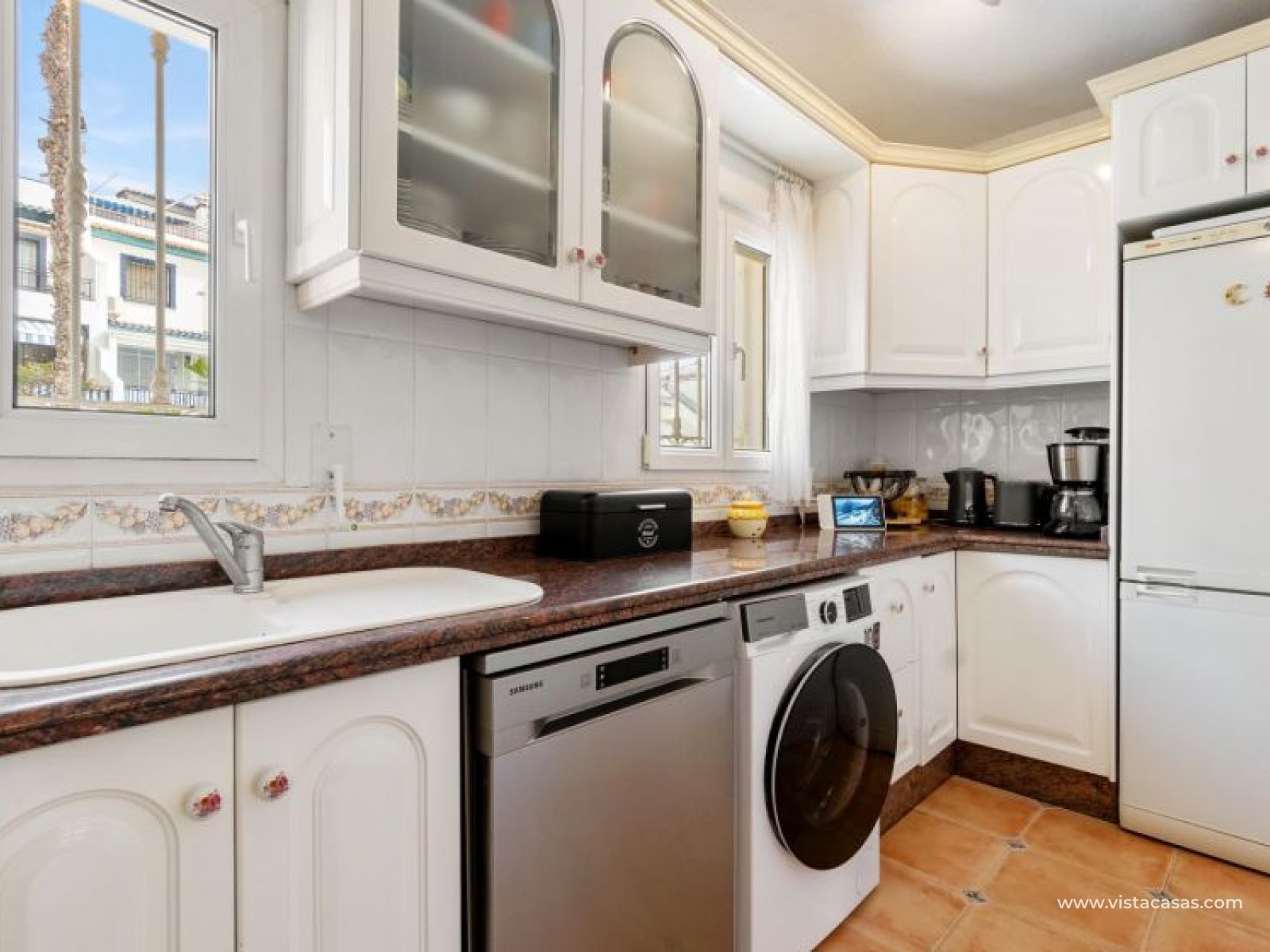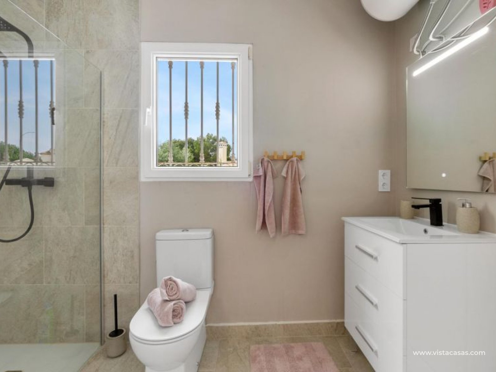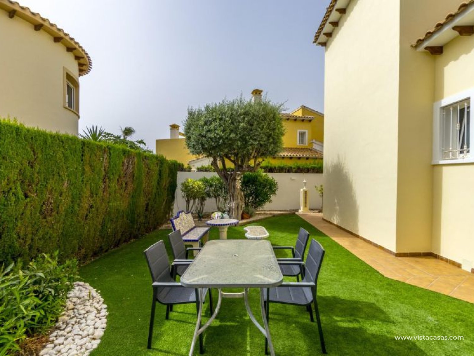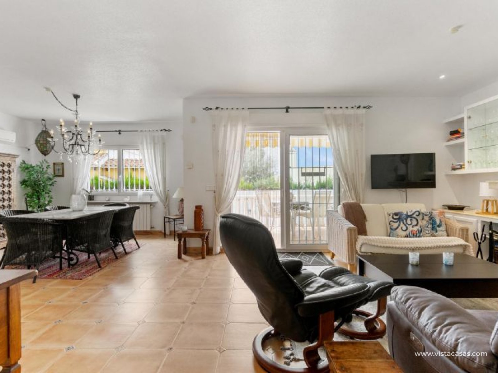 Beautiful mediterranean style detached villa for sale in Los Dolses-Orihuela Costa Discover this charming two storey Mediterranean style detached villa, a luxury retreat with modern facilities, located in the prestigious area of Los Dolses, Orihuela Costa. Designed to offer maximum comfort and elegance. On the ground floor we find a spacious and bright living-dining room with fireplace, creating a warm and cosy atmosphere, with direct exit to a covered terrace and the stunning private swimming pool, ideal to enjoy relaxing moments outdoors. At this floor we also find a large independent kitchen fully equipped with modern appliances, 2 comfortable bedrooms, each with en suite bathroom, plus 1 additional toilet and a small storage room for added functionality. The first floor consists of 2 additional bedrooms offering a versatile and cosy space for family or guests, 1 full bathroom and a terrace perfect for enjoying the Mediterranean sun or its unobstructed views. All rooms are air-conditioned, guaranteeing comfort at any time of the year. This property is in impeccable condition, ready to move into, sold furnished and fully equipped! The beautiful garden of this spectacular villa has a driveway and seating areas. The private pool and terrace are the ideal place to enjoy the sun all year round. There is also a storage room in the garden, perfect for you beach chairs, golf bags or bicycles etc. The property offers multiple orientations, filling the spaces with abundant natural light. Its location is privileged, close to a wide range of shops, restaurants and services and within walking distance of the famous La Zenia Boulevard shopping centre, known for its wide variety of fashionable shops, restaurants and leisure areas. For golf lovers, there are three 18-hole golf courses within 2 km. The AP-7 motorway is only 1 km away, offering excellent connections to the region. This spectacular villa combines the charm of Mediterranean style with the comfort of modern facilities, offering a luxurious and relaxed lifestyle in an unbeatable location. Contact us today to arrange a viewing/videoviewing and discover your new home or holiday home in Orihuela Costa!