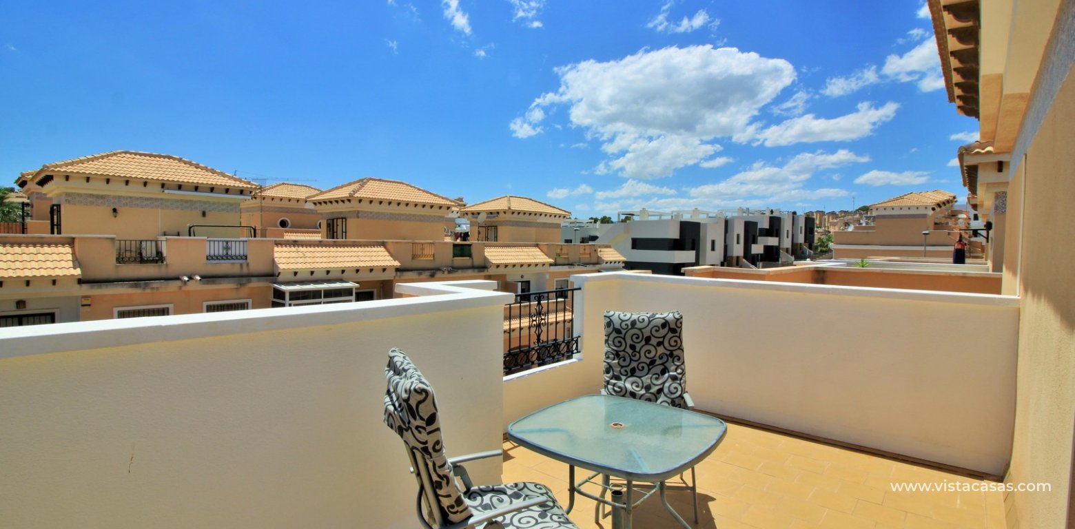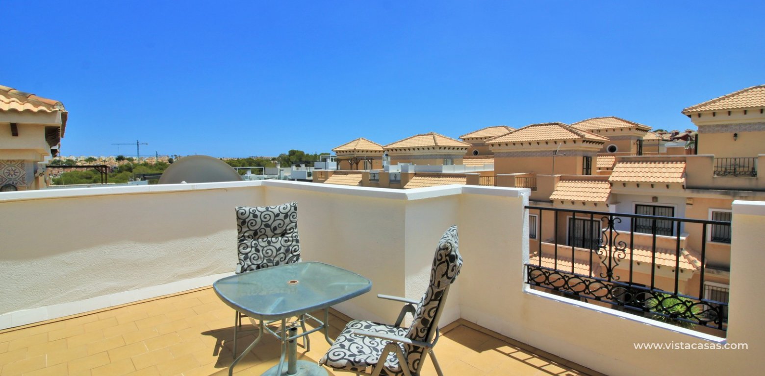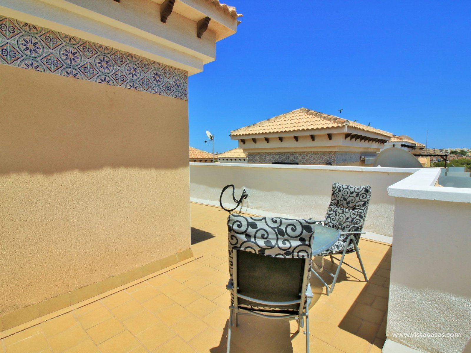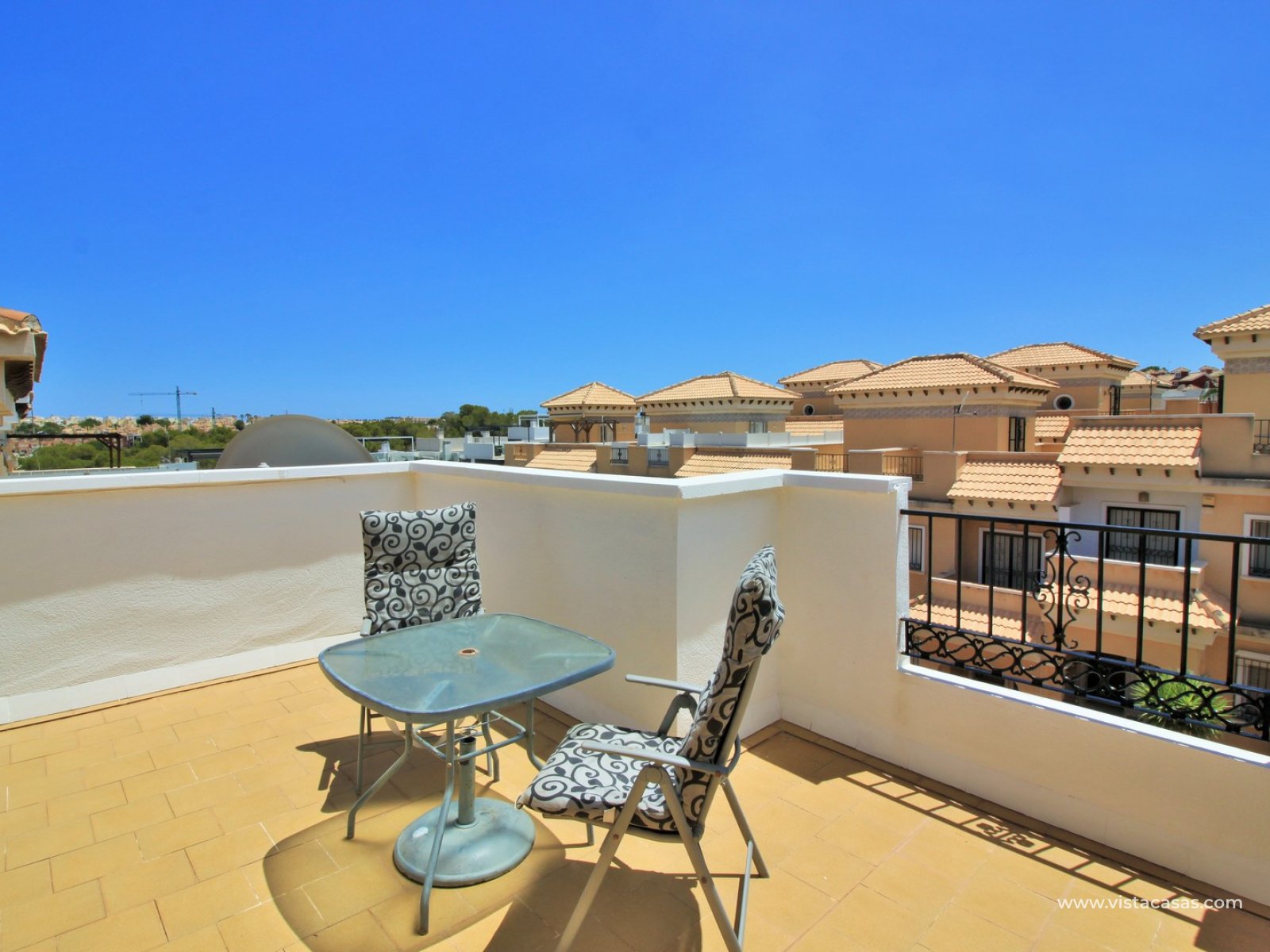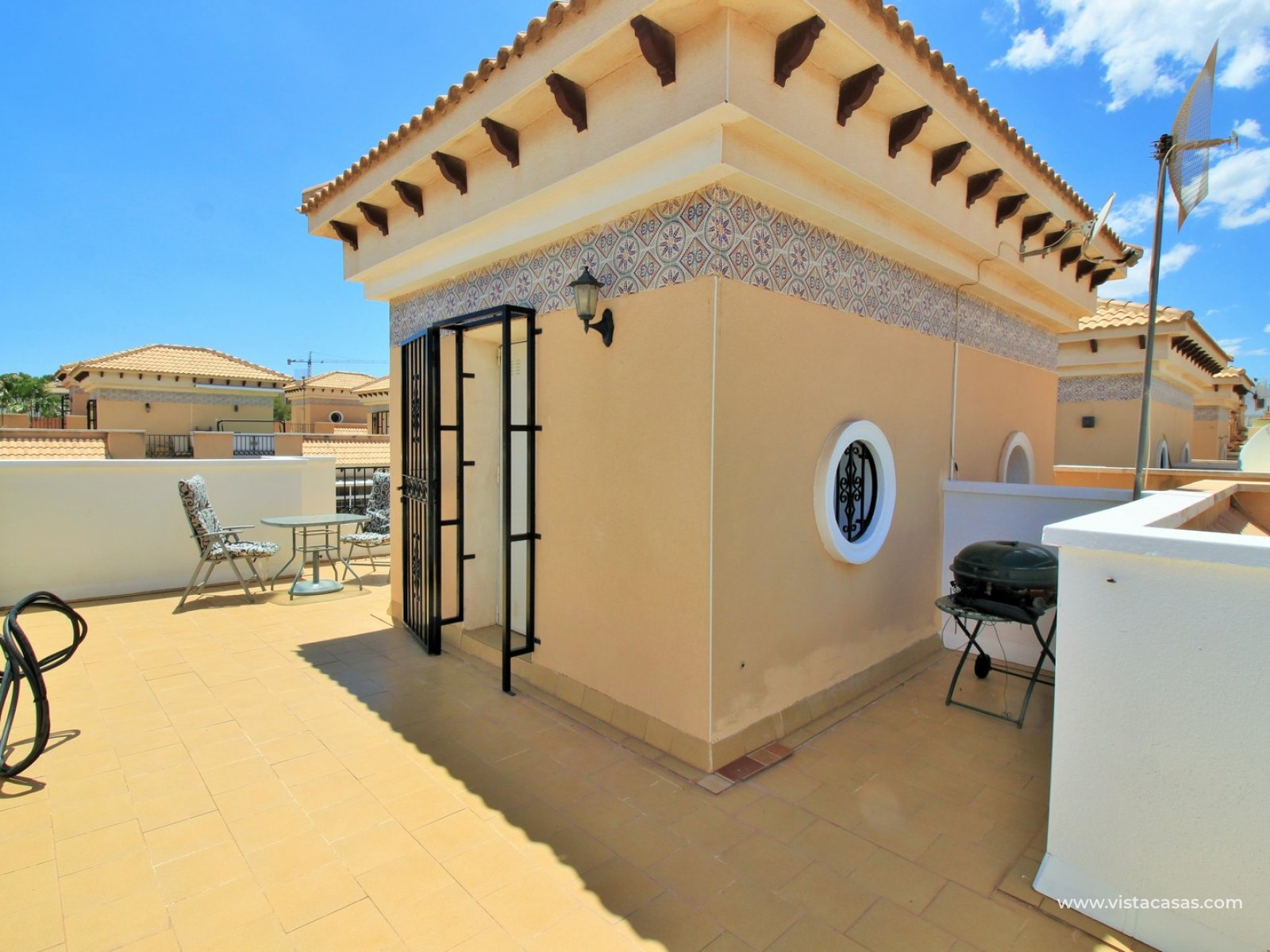 The living accommodation on the ground floor comprises of a bright lounge-dining area, a separate kitchen with access to a rear terrace, and a downstairs bathroom with walk-in shower. Outside there is a tiled patio area with a covered porch. Upstairs there are 3 bedrooms with fitted wardrobes, and a family bathroom. The master bedroom offers a private South facing balcony. Internal stairs from the landing leads up to the L shape roof solarium, perfect for sunbathing and entertaining on with sunshine all day!