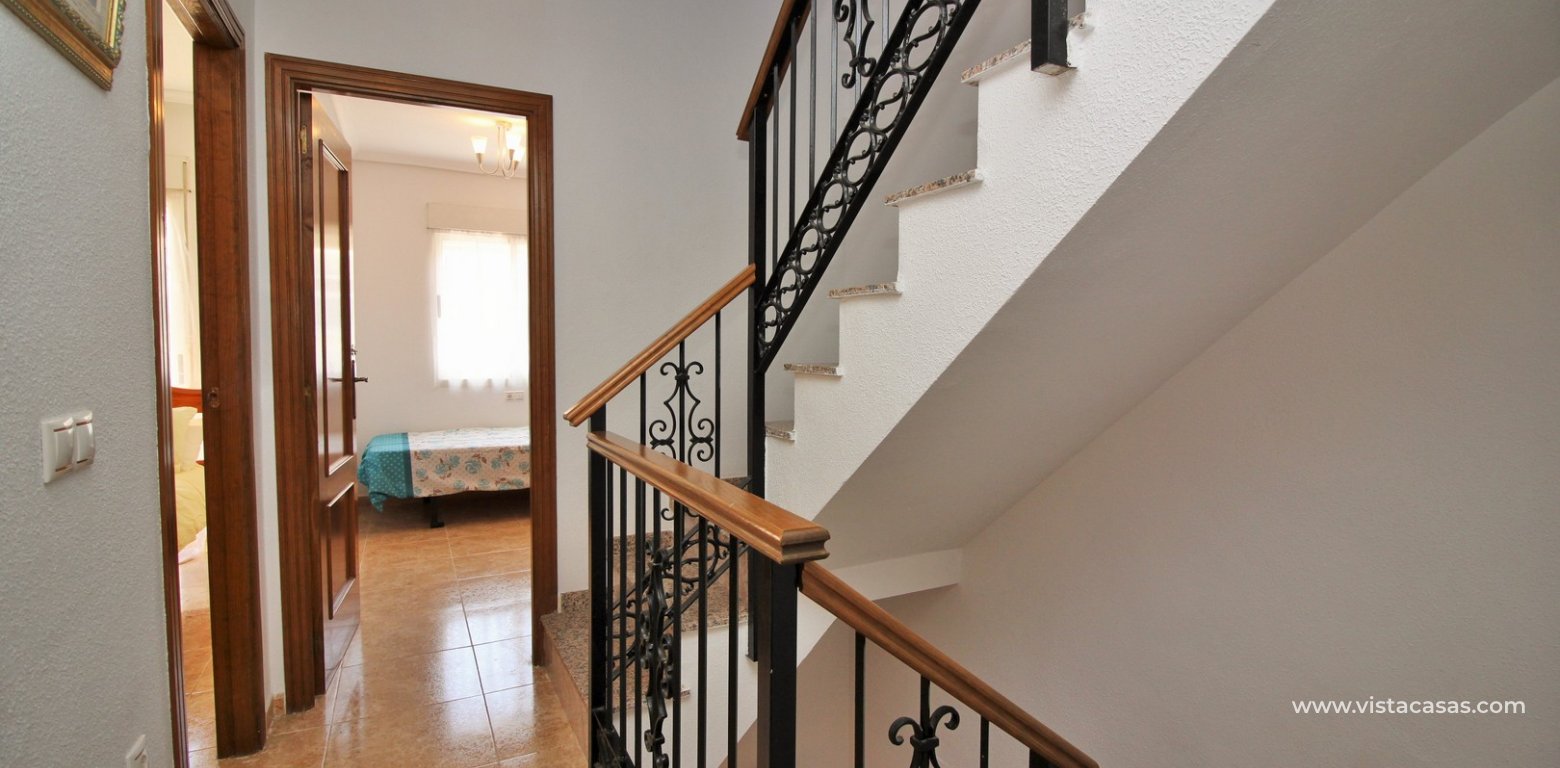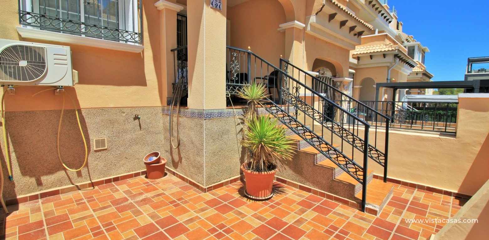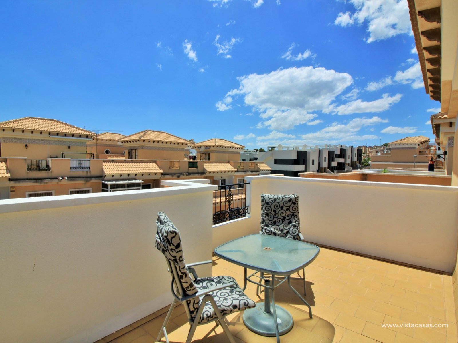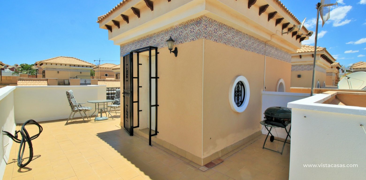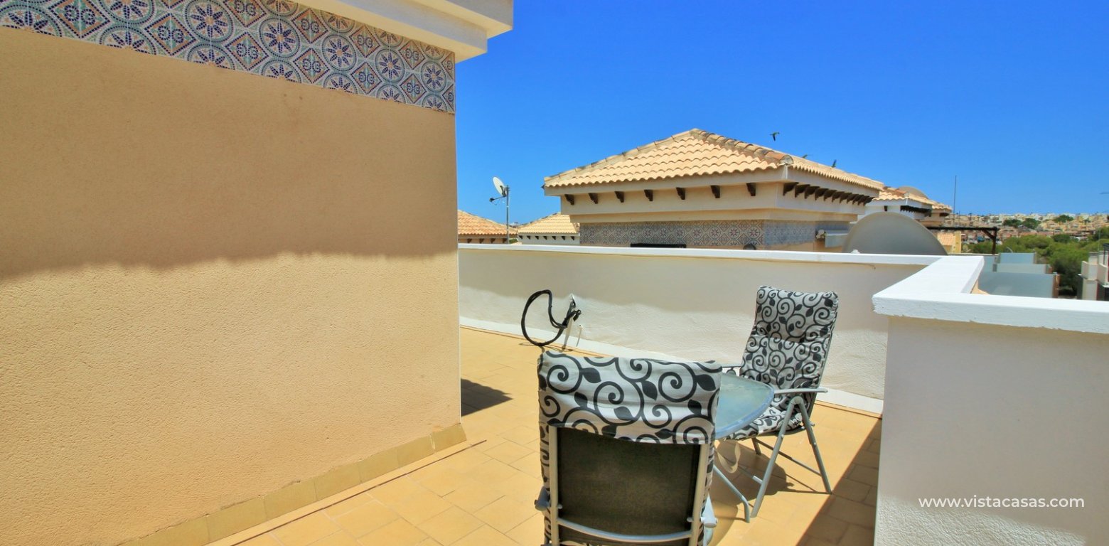 The living accommodation on the ground floor comprises of a bright lounge-dining area, a separate kitchen with access to a rear terrace, and a downstairs bathroom with walk-in shower. Outside there is a tiled patio area with a covered porch. Upstairs there are 3 bedrooms with fitted wardrobes, and a family bathroom. The master bedroom offers a private South facing balcony. Internal stairs from the landing leads up to the L shape roof solarium, perfect for sunbathing and entertaining on with sunshine all day!